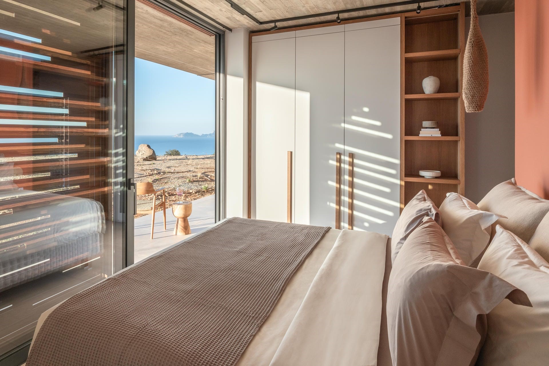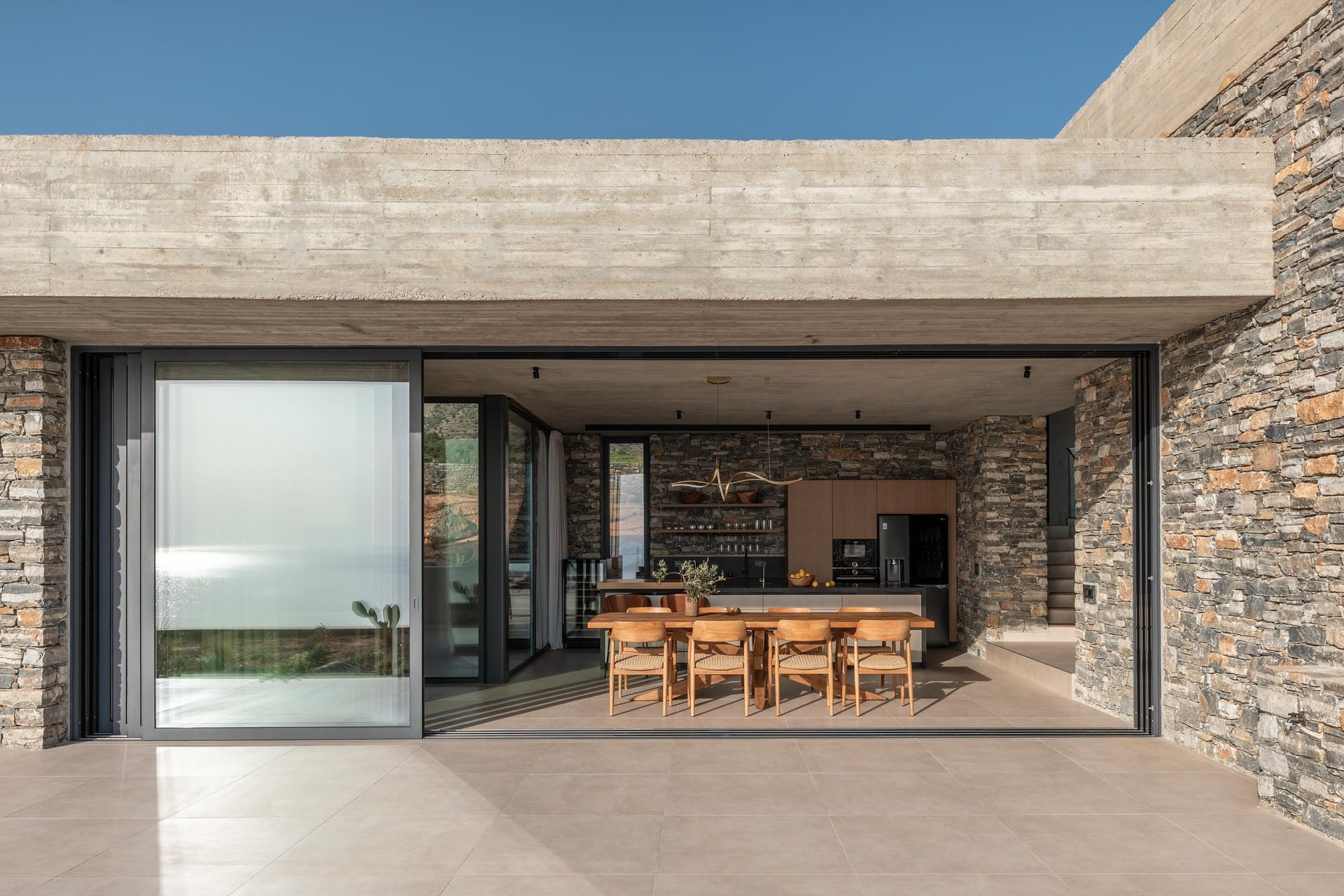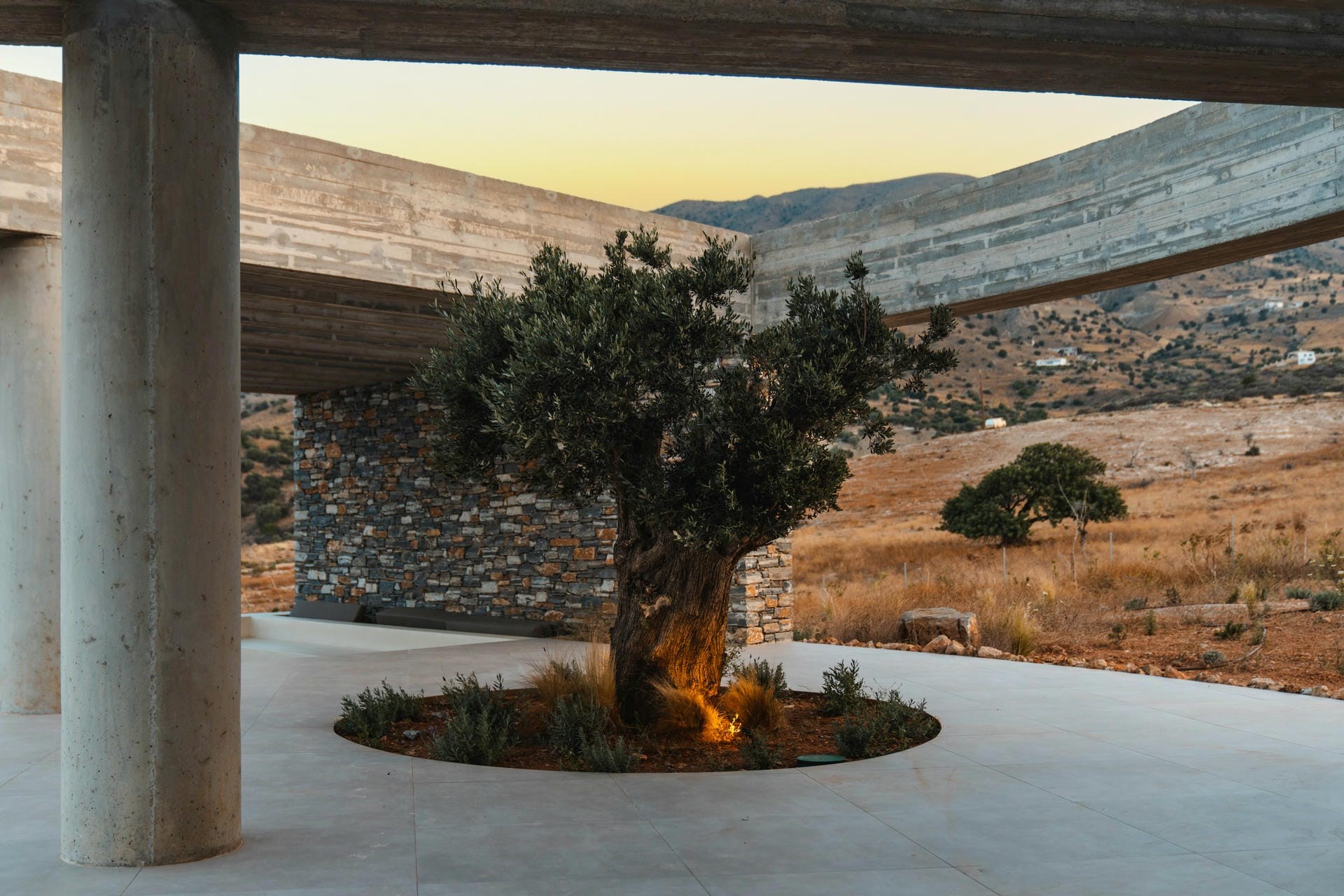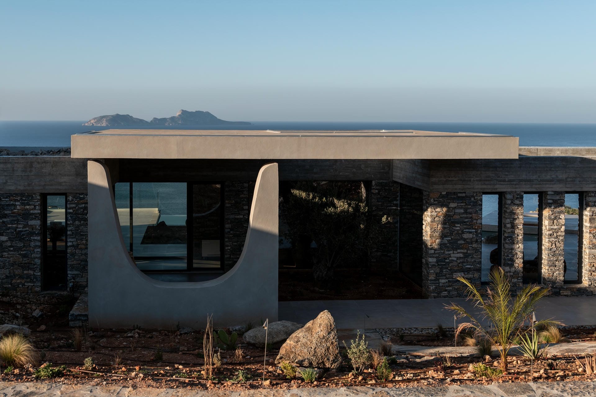 The villa is composed of two curved concrete wings – one dedicated to social living spaces and the other housing the private sleeping quarters – which artfully mimic the horn’s geometry. Expansive glass walls blur the line between the outdoor spaces and the contemporary interiors. Exposed, sculptural concrete provides a powerful geometric contrast to the natural stone walls, while warm wood detailing introduces a touch of Cretan authenticity and comfort.