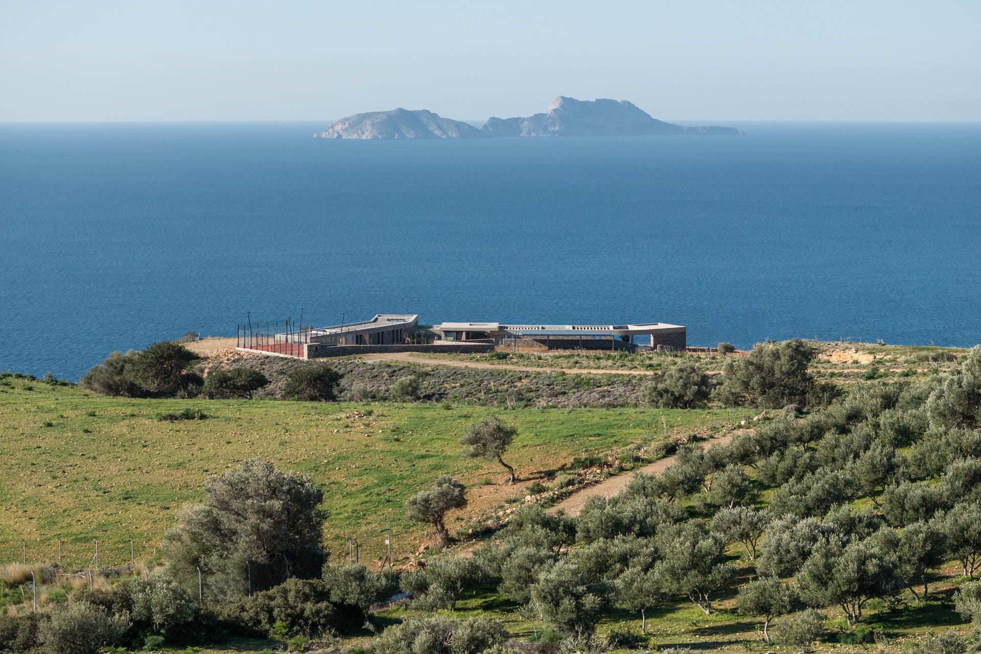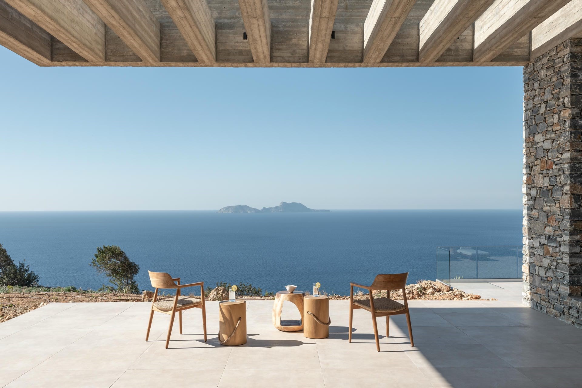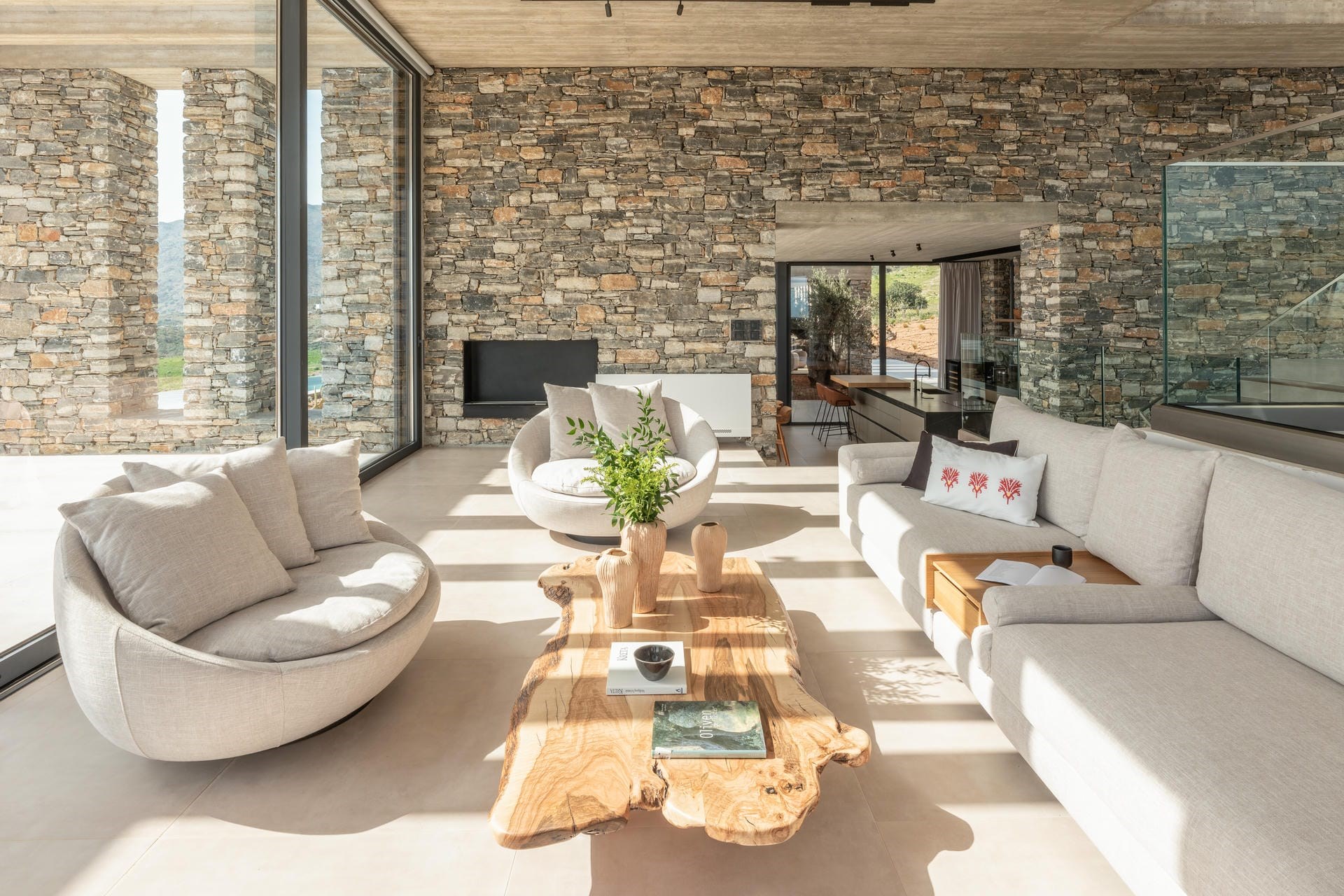The villa is composed of two curved concrete wings – one dedicated to social living spaces and the other housing the private sleeping quarters – which artfully mimic the horn’s geometry. Expansive glass walls blur the line between the outdoor spaces and the contemporary interiors. Exposed, sculptural concrete provides a powerful geometric contrast to the natural stone walls, while warm wood detailing introduces a touch of Cretan authenticity and comfort.