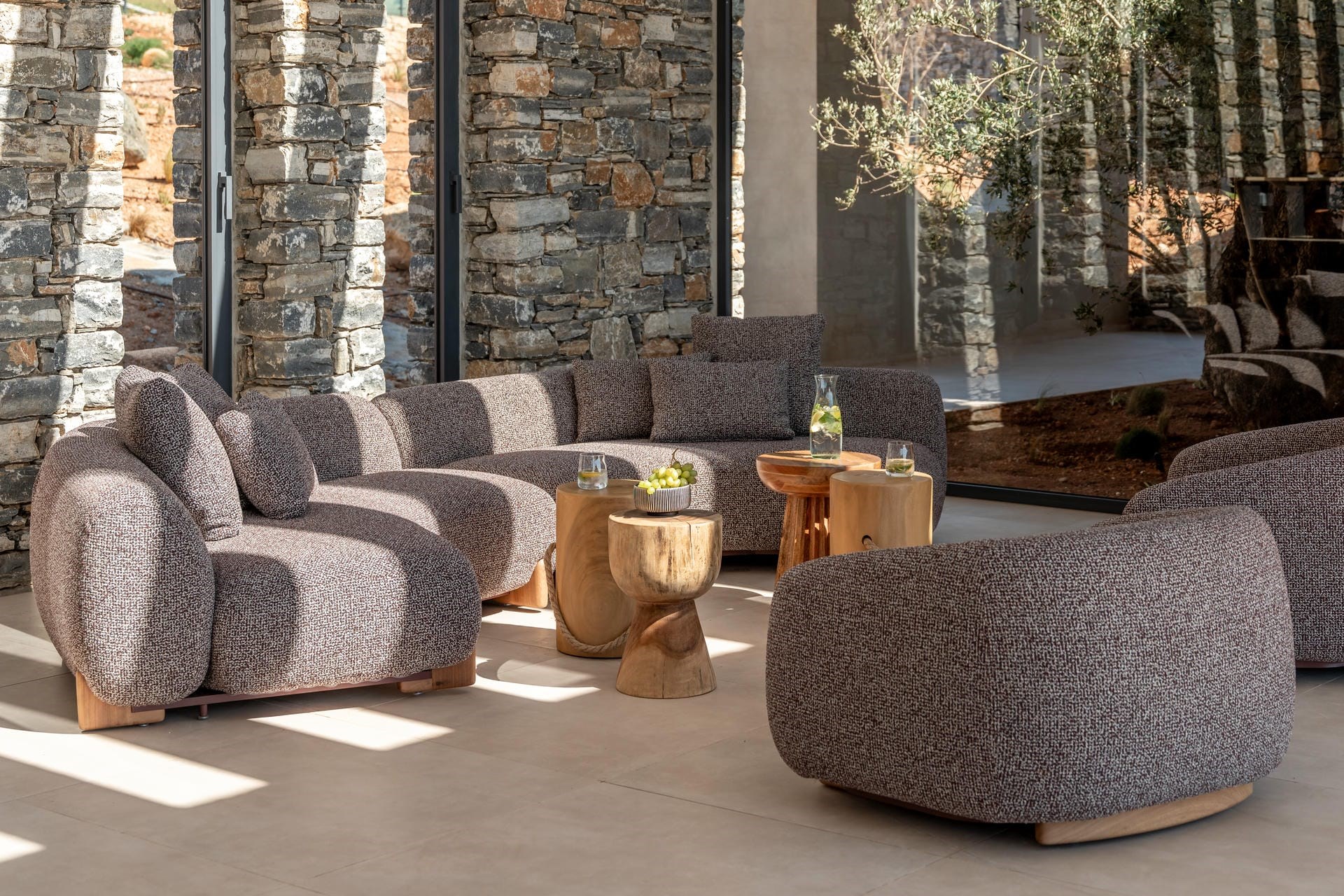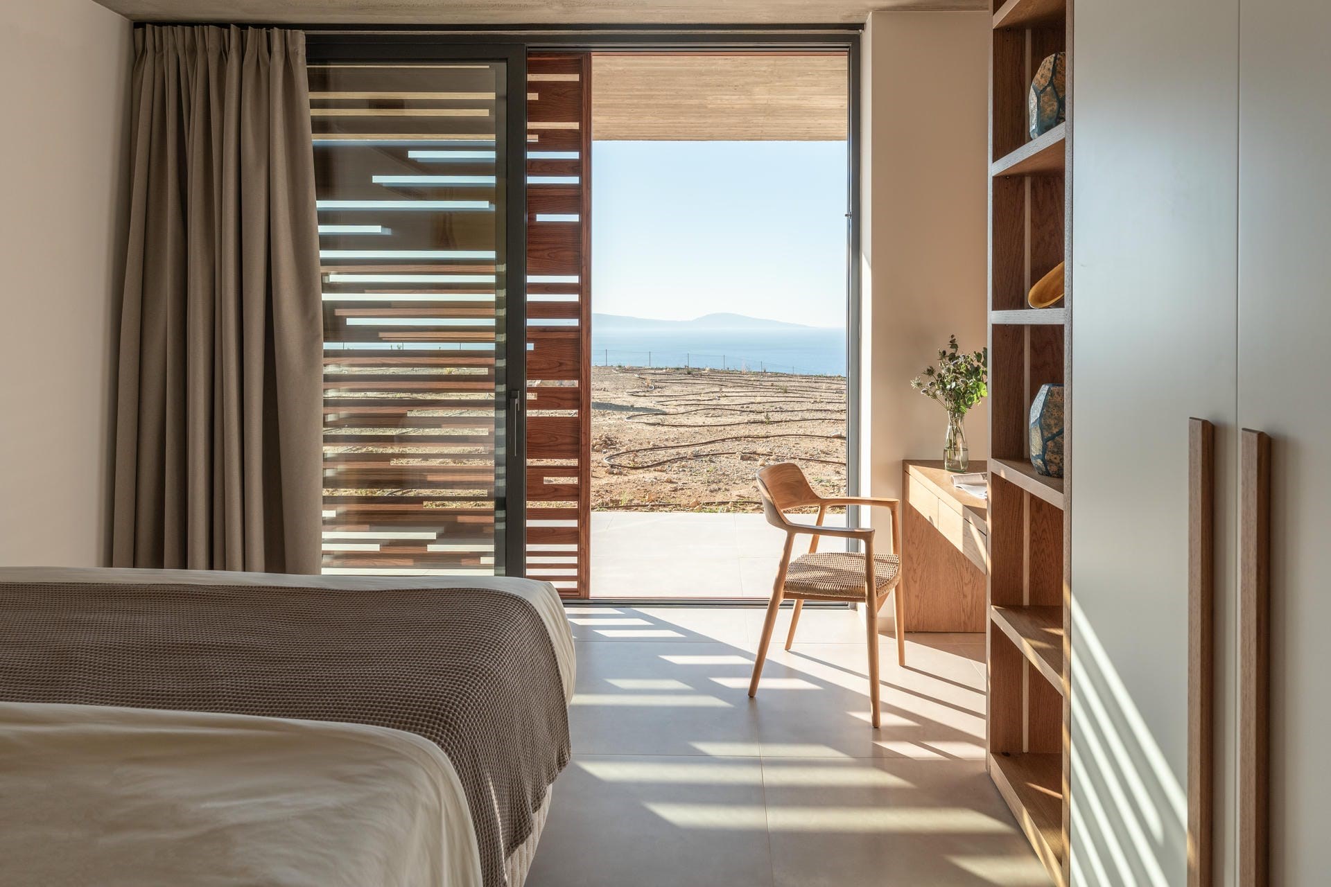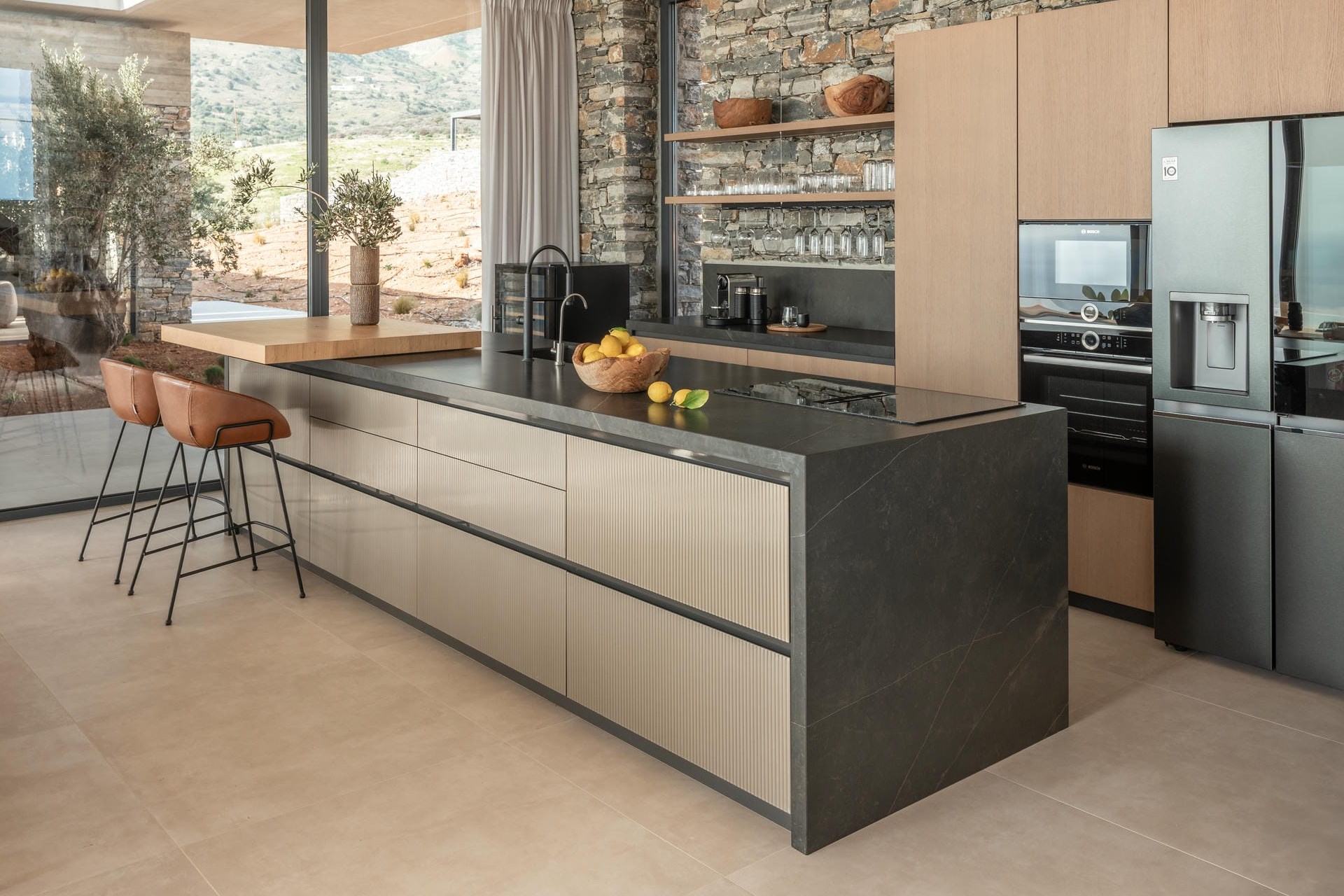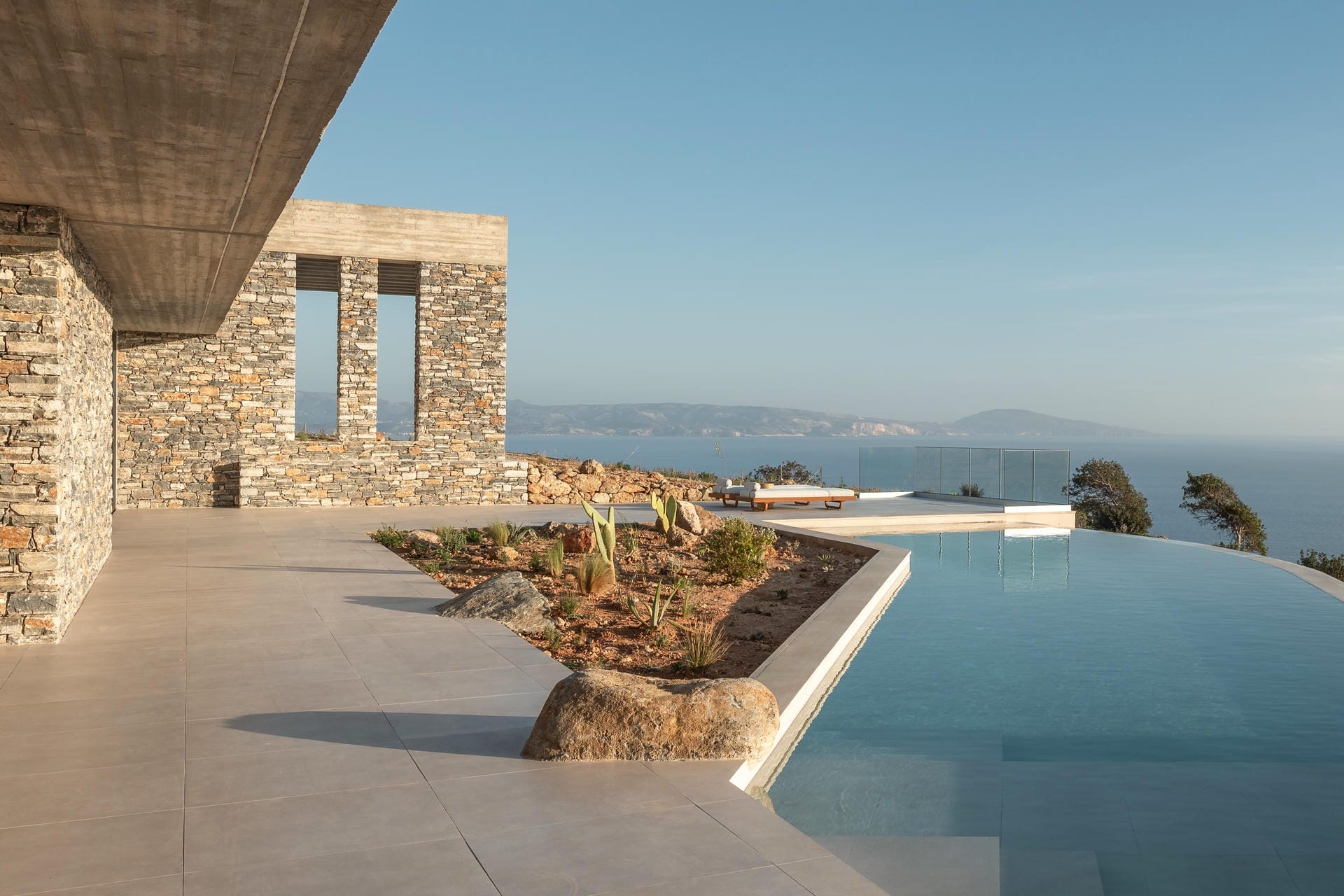 The villa is composed of two curved concrete wings – one dedicated to social living spaces and the other housing the private sleeping quarters – which artfully mimic the horn’s geometry. Expansive glass walls blur the line between the outdoor spaces and the contemporary interiors. Exposed, sculptural concrete provides a powerful geometric contrast to the natural stone walls, while warm wood detailing introduces a touch of Cretan authenticity and comfort.
