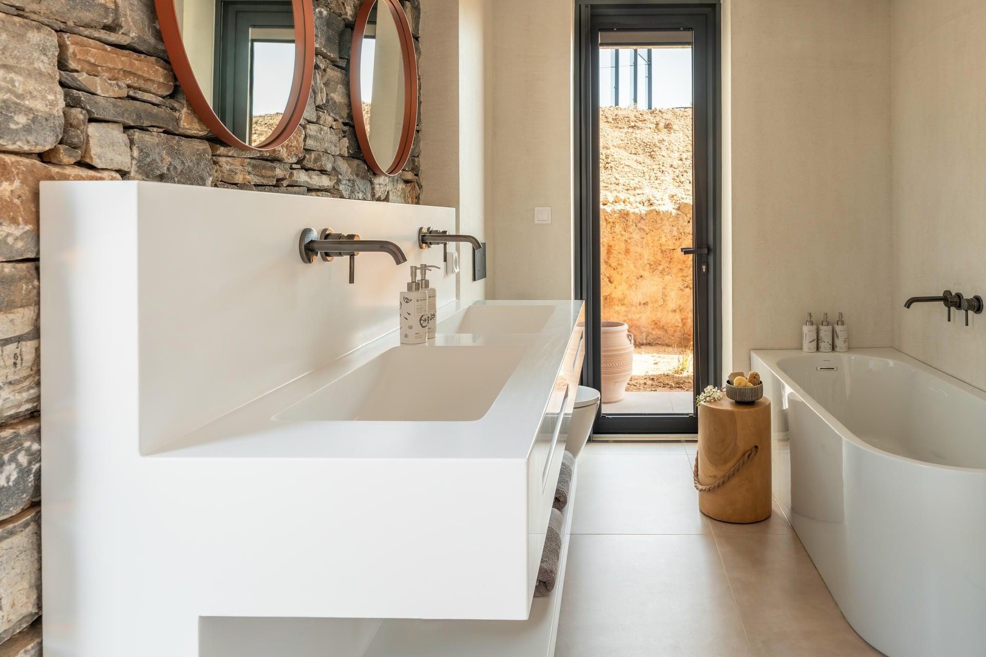 Bedroom 1 – king-size bed, en-suite bathroom with dual vanity, bathtub & outdoor shower, private terrace, and sea views