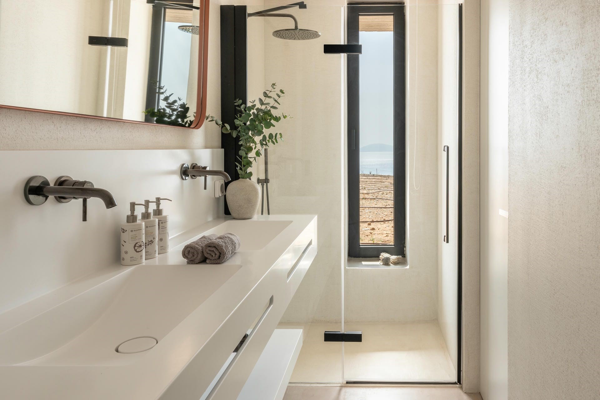 Bedroom 2 – king-size bed, en-suite bathroom with dual vanity & shower, private terrace, and sea views