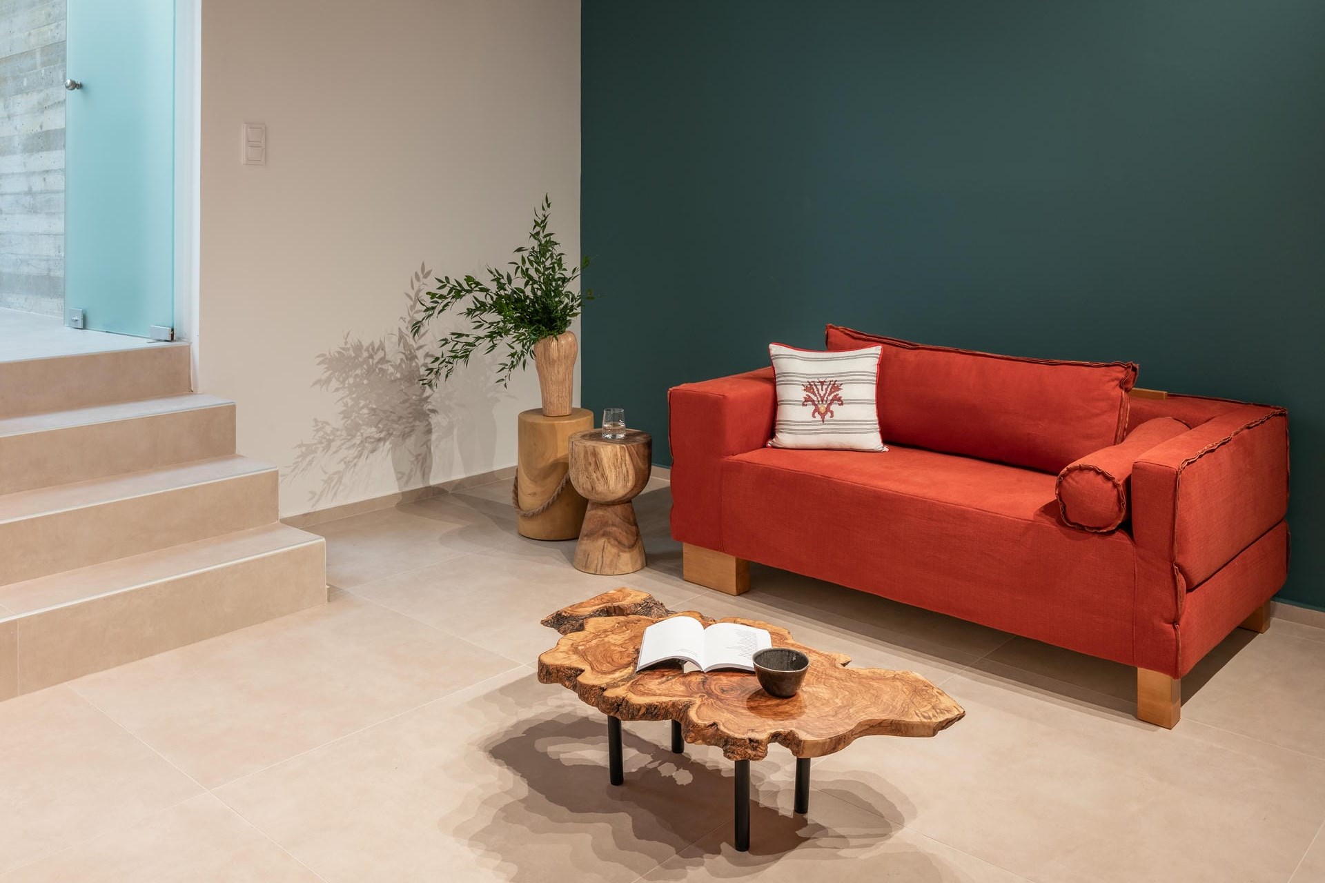The villa itself is an architectural masterpiece. Inspired by ancient Minoan forms, the design philosophy emphasises raw, natural materials that connect the building to its rugged environment. At the villa entrance, guests are greeted by an impressive sculpture of the Horns of Consecration, an iconic Minoan symbol of spiritual and religious significance.