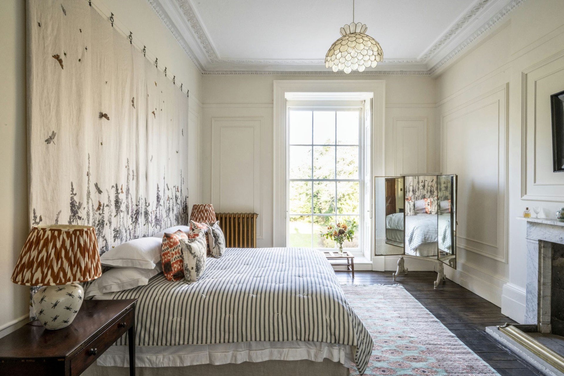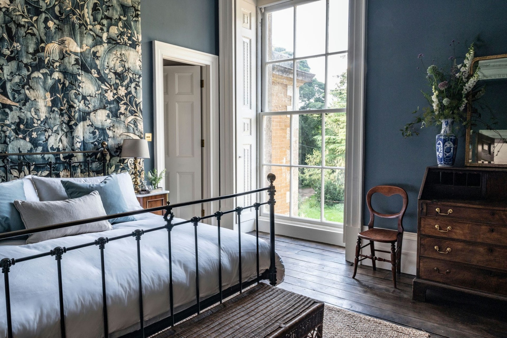 The manor sleeps up to 20 guests in 10 elegant bedrooms. The seven bedrooms in the main house all boast king-size beds (two of which can be arranged as twins), and most have en-suite facilities. Each room has a unique style, some with opulent detailing like textile wall hangings or claw-foot tubs; other details are a little quirkier, like the portrait of the 4th Lord Berners, Sir Thomas Knyvet, covering one shower wall!