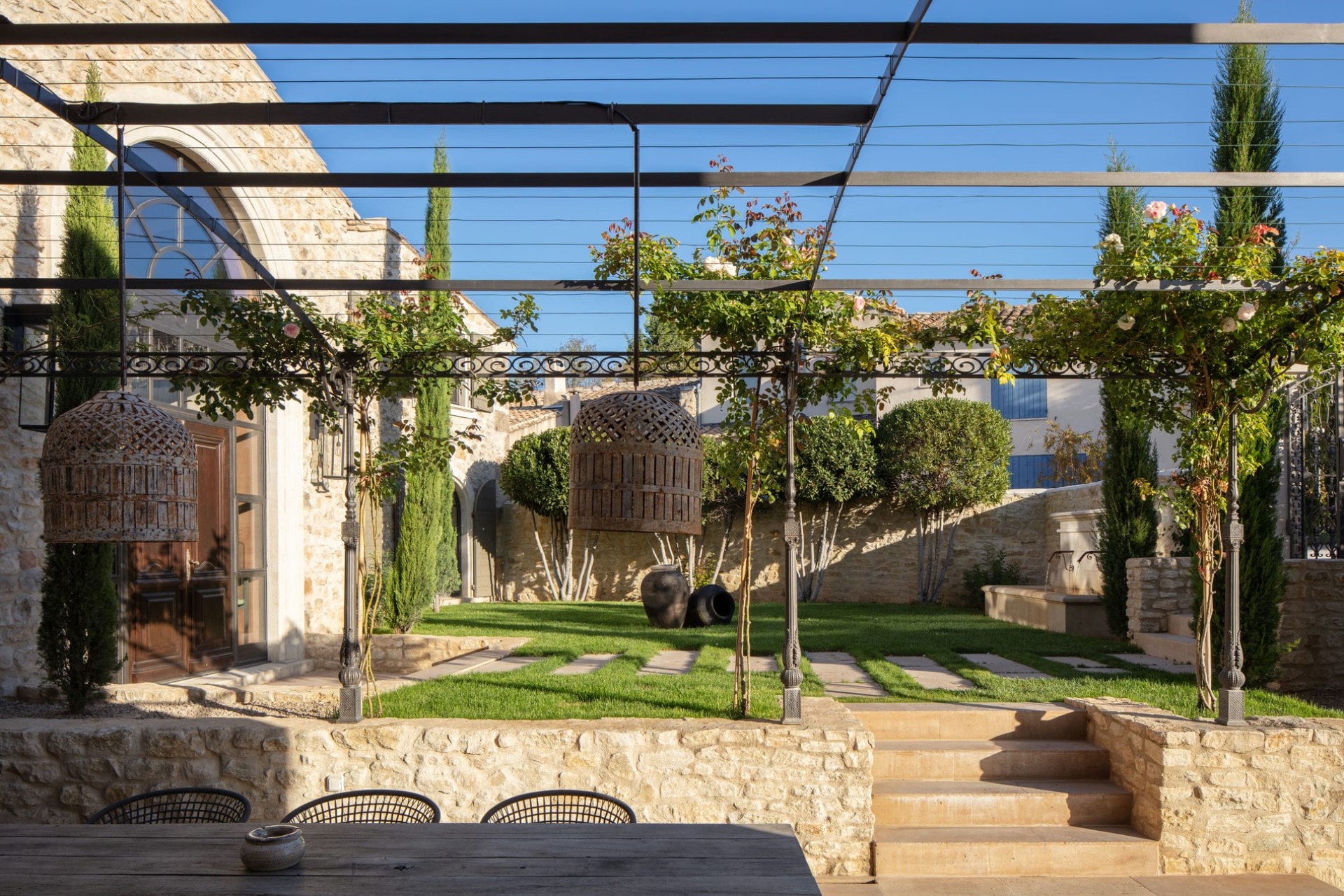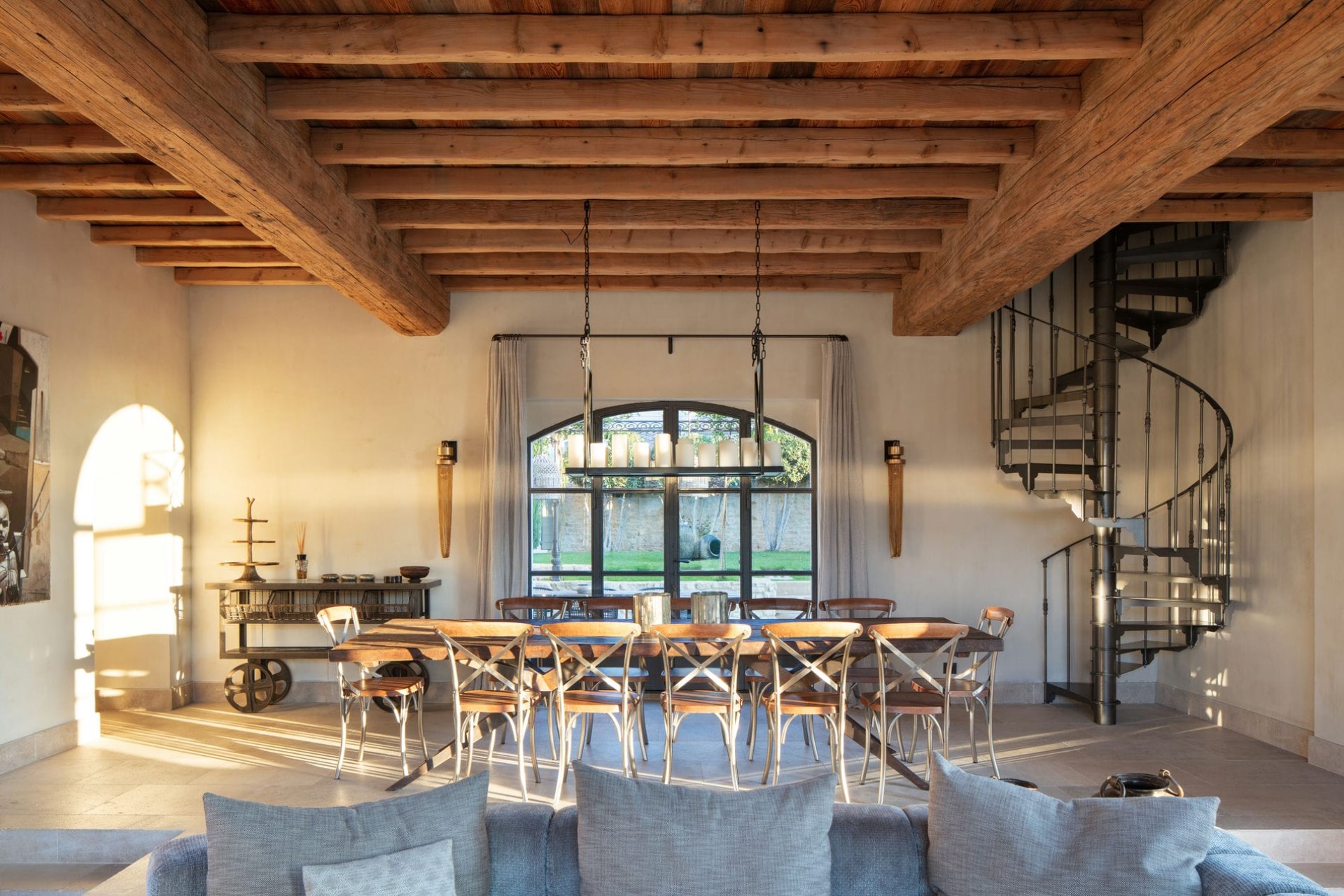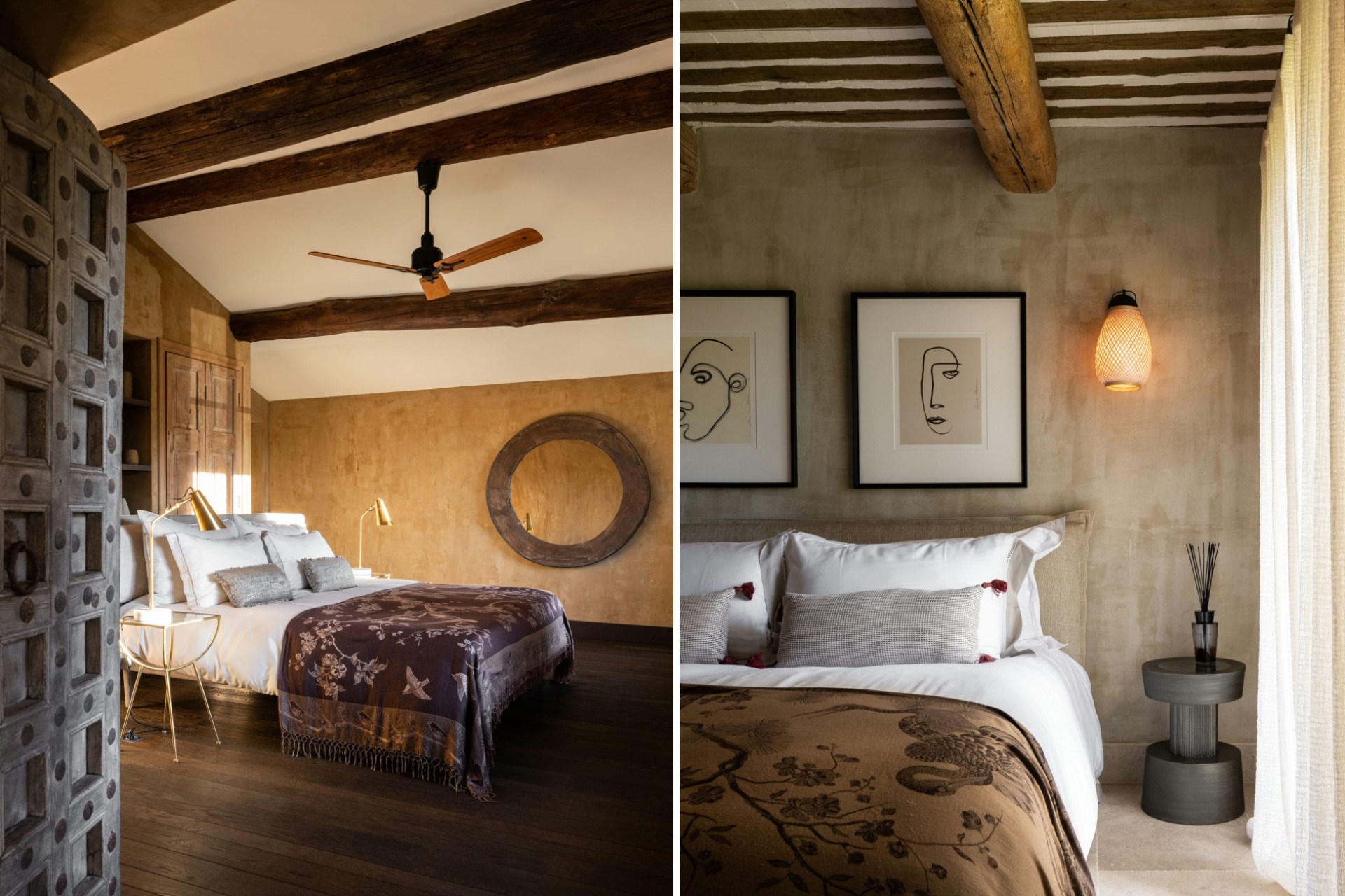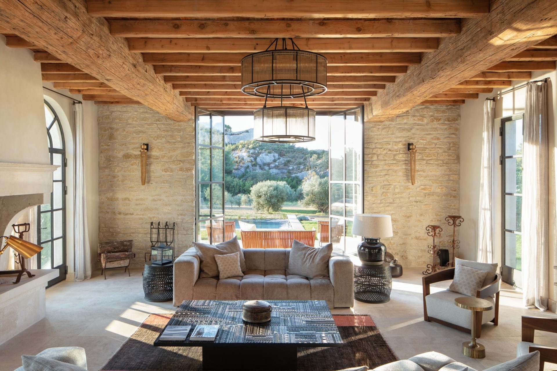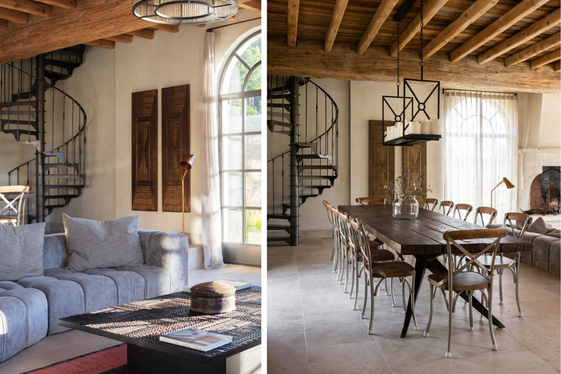 Indoors, the 18th-century bastide has been expertly restored. Floors laid polished local limestone or dark oak, exposed ceiling beams hung with pendant lighting, and cosy fireplaces create a modern farmhouse feel.