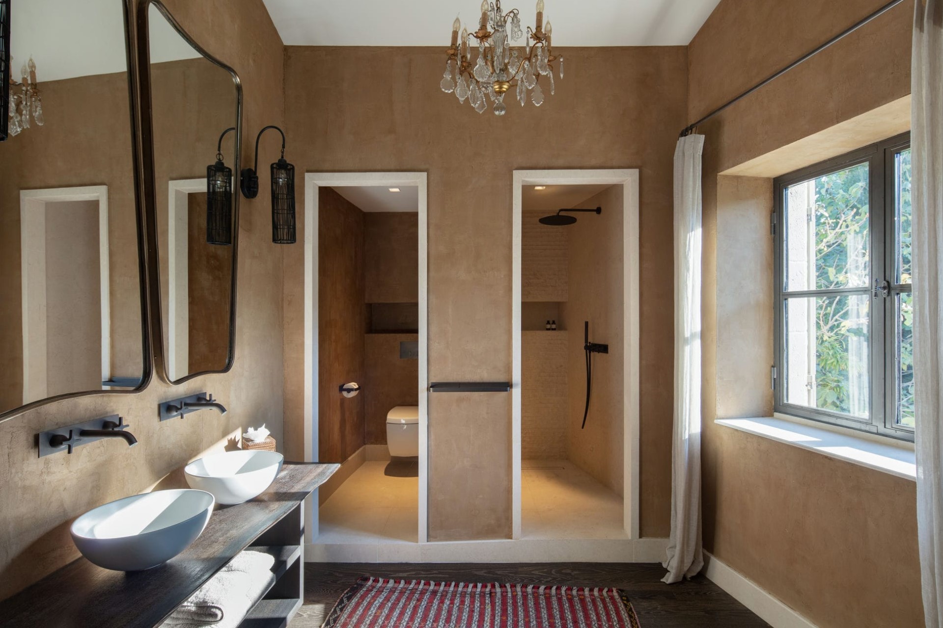 Within the sprawling grounds is a heated infinity pool, with sun loungers at one end, where guests can dry off and soak up the rays. At the other end is an outdoor lounge setting, perfect for enjoying the gardens dotted with century-old olive trees and taking in the panoramic countryside views.