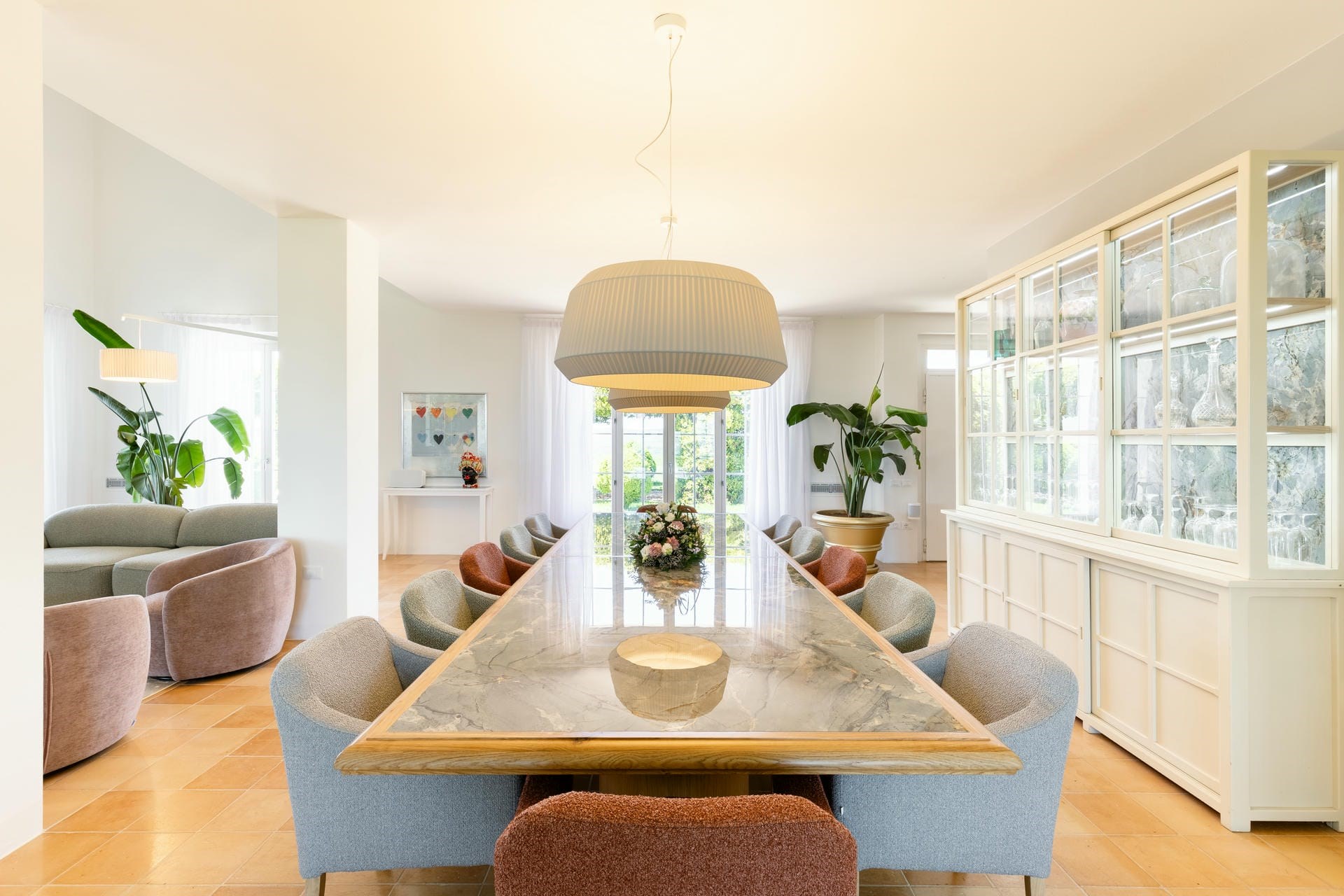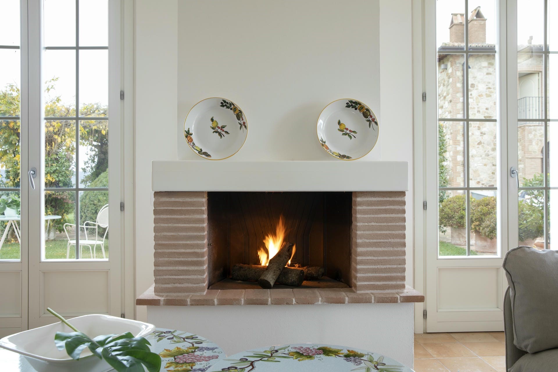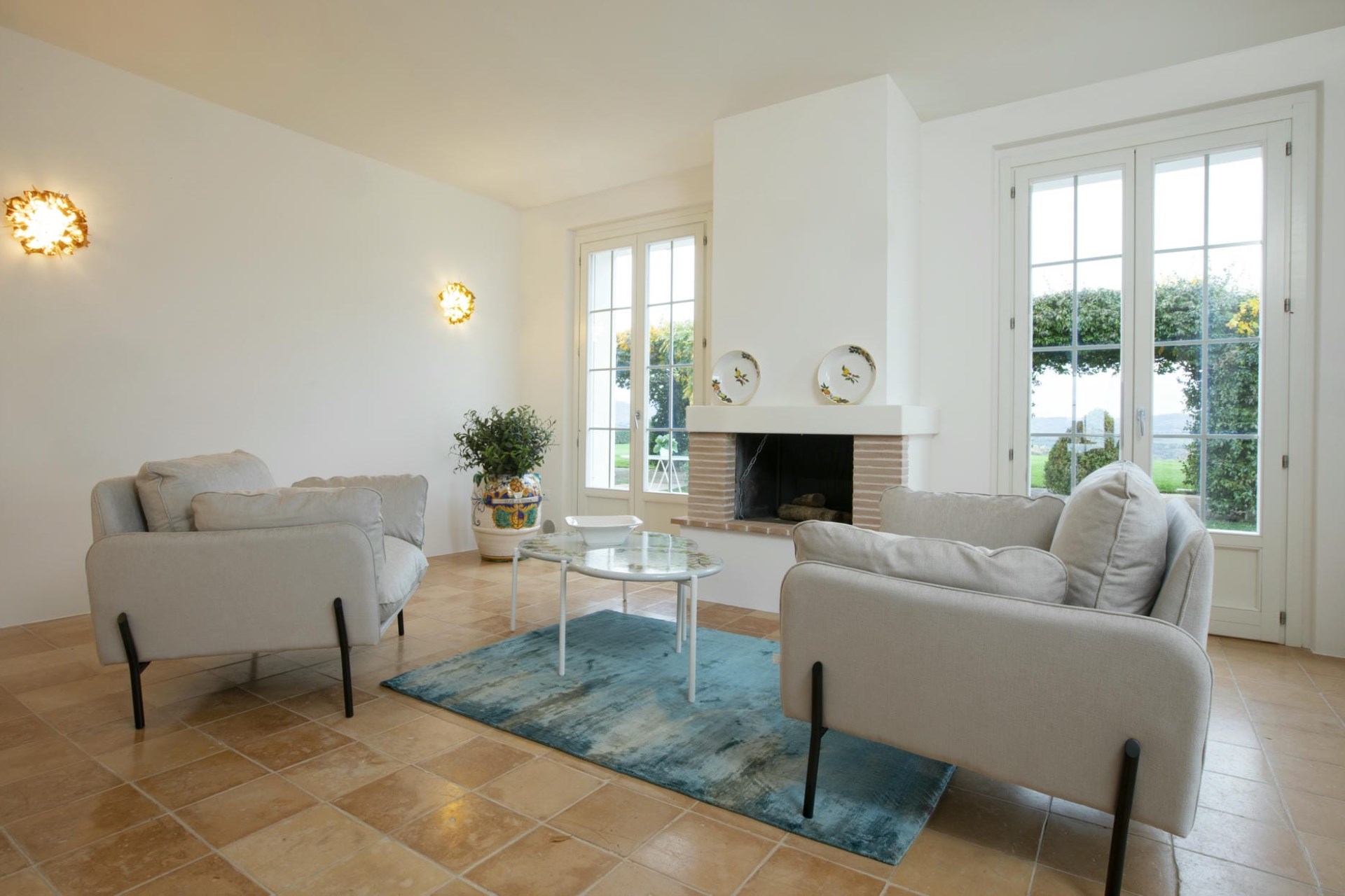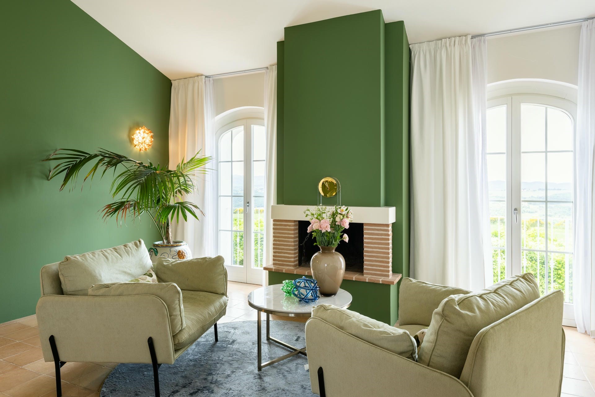 In the main villa, guests can relax in a spacious, open-plan living area. Plush sofas surround a crackling fireplace, an elegant 10-seater dining table is perfect for social meals, and large windows allow for views of the gardens and beyond on all sides. There is also a modern, fully-equipped kitchen for preparing tasty Italian feasts.