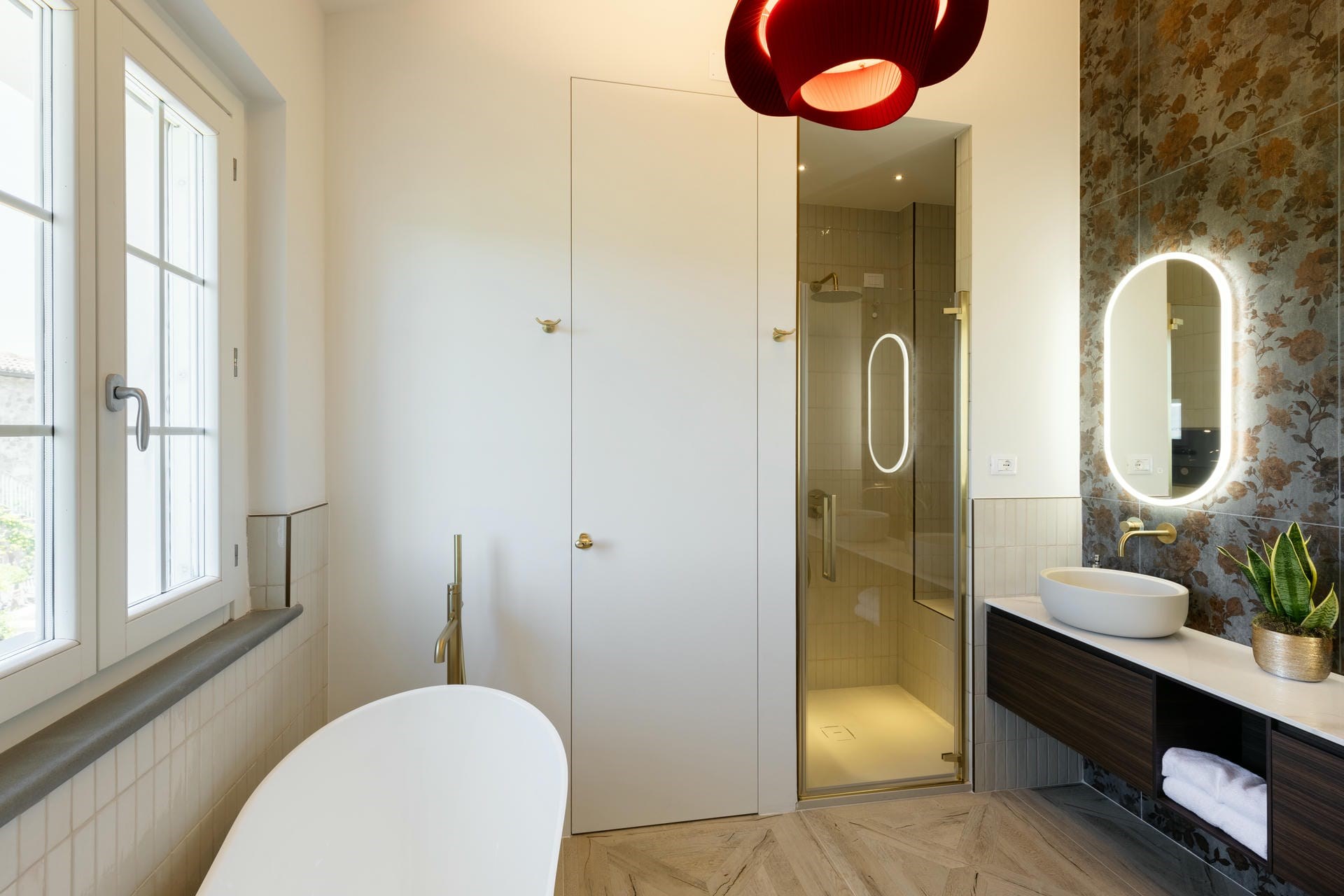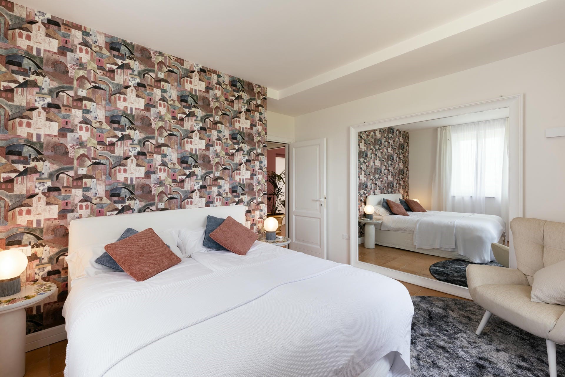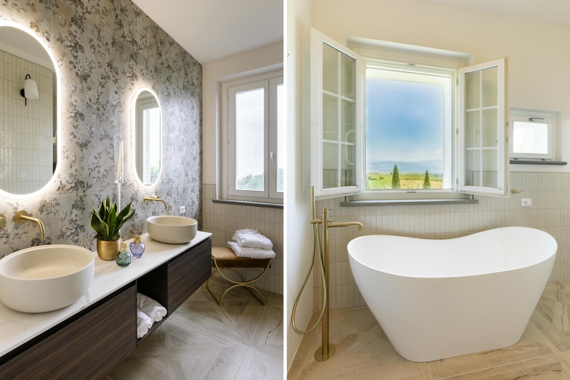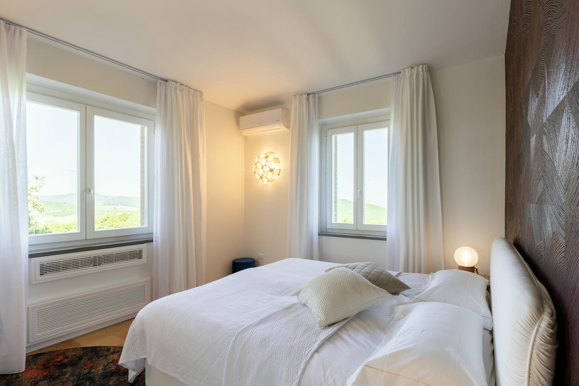 In the main villa, guests can relax in a spacious, open-plan living area. Plush sofas surround a crackling fireplace, an elegant 10-seater dining table is perfect for social meals, and large windows allow for views of the gardens and beyond on all sides. There is also a modern, fully-equipped kitchen for preparing tasty Italian feasts.
