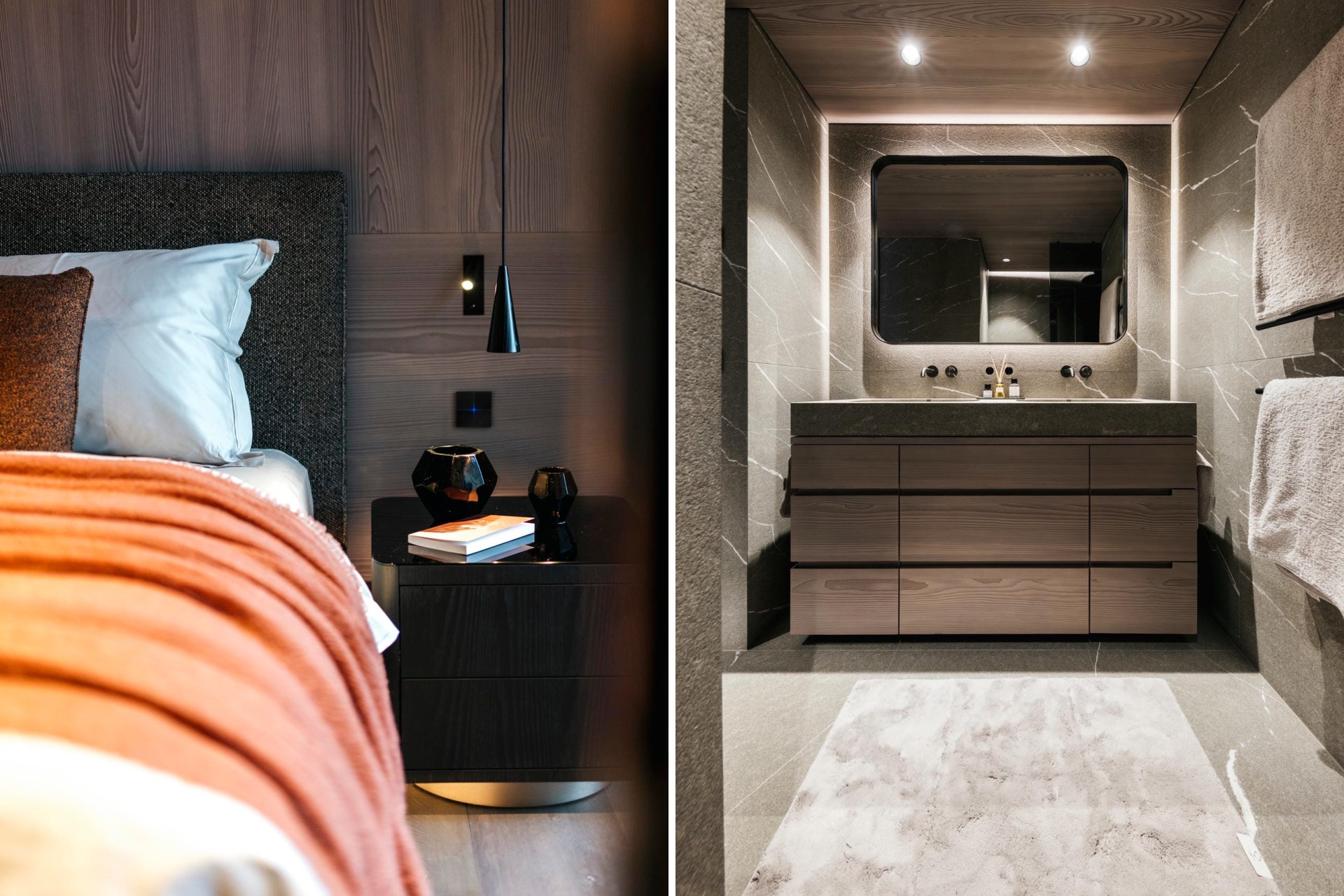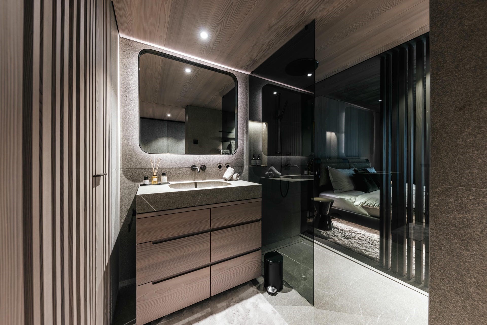 Indoors, the design is a masterful fusion of rustic elegance and modern comfort. Adjoining the terrace, the chalet’s top floor is home to the main living areas. Again, the use of natural materials, such as reclaimed wood and plush wool, creates a warm and inviting atmosphere, while designer furnishings and state-of-the-art technology ensure every modern comfort is provided. Large windows flood the space with natural light and perfectly frame the dramatic mountain scenery. The fireside lounge and bar area offers a cosy space to relax, while the elegant dining room is ideal for enjoying personalised chef-prepared meals.