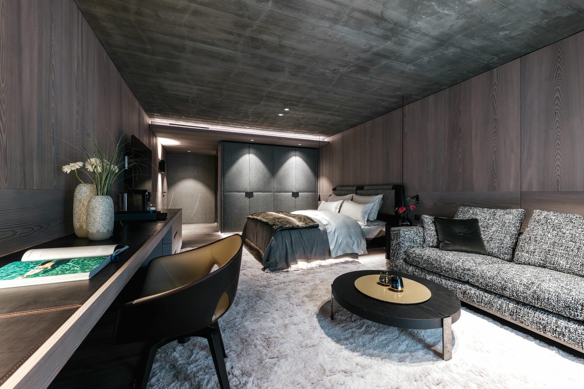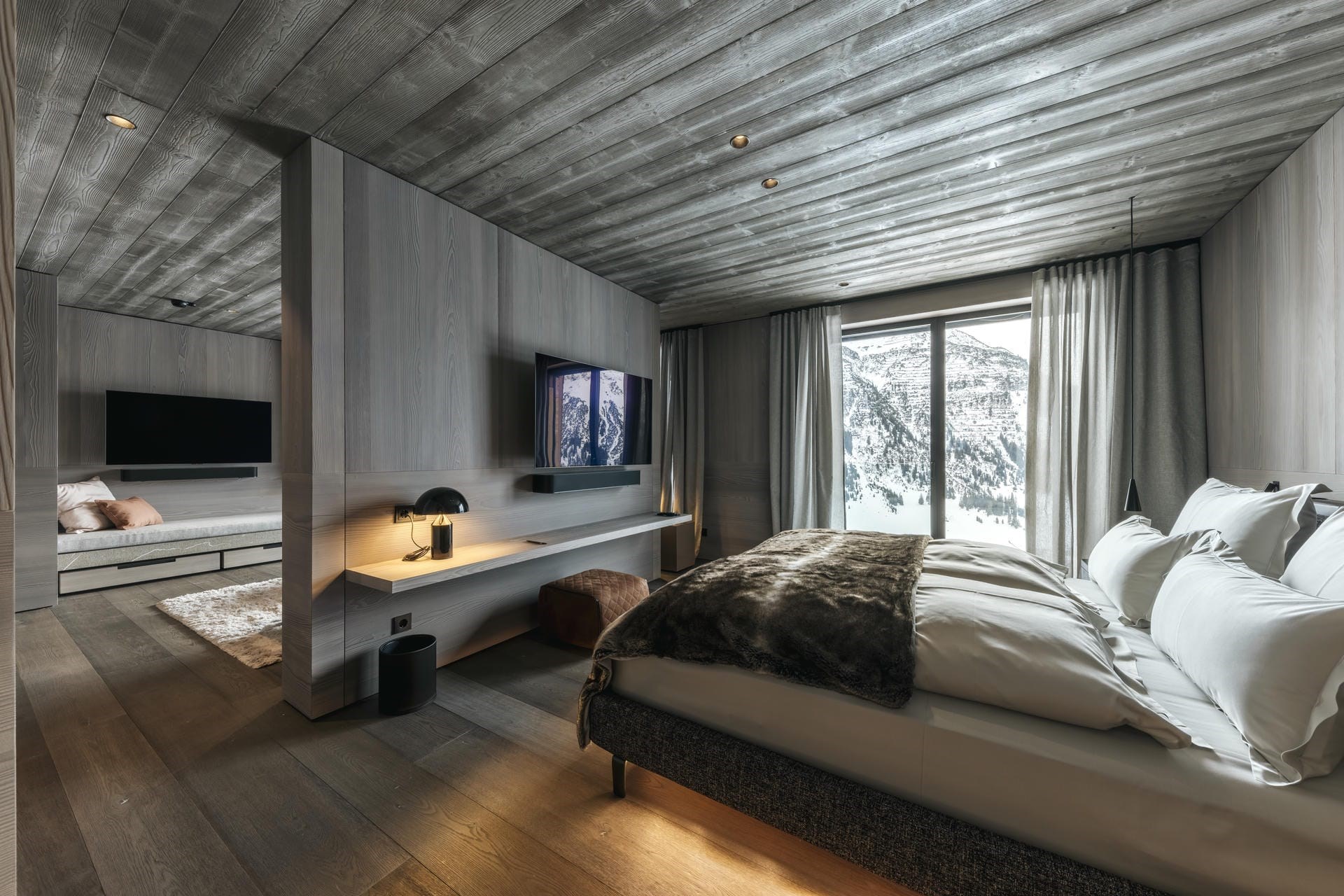 The chalet’s seven suites are spread out over the two middle floors, each a private sanctuary with luxurious bedding, en-suite bathrooms, and private balconies. The three second-floor suites have separate lounge rooms with fireplaces, and one first-floor suite has a spacious lounge area beside the bed.