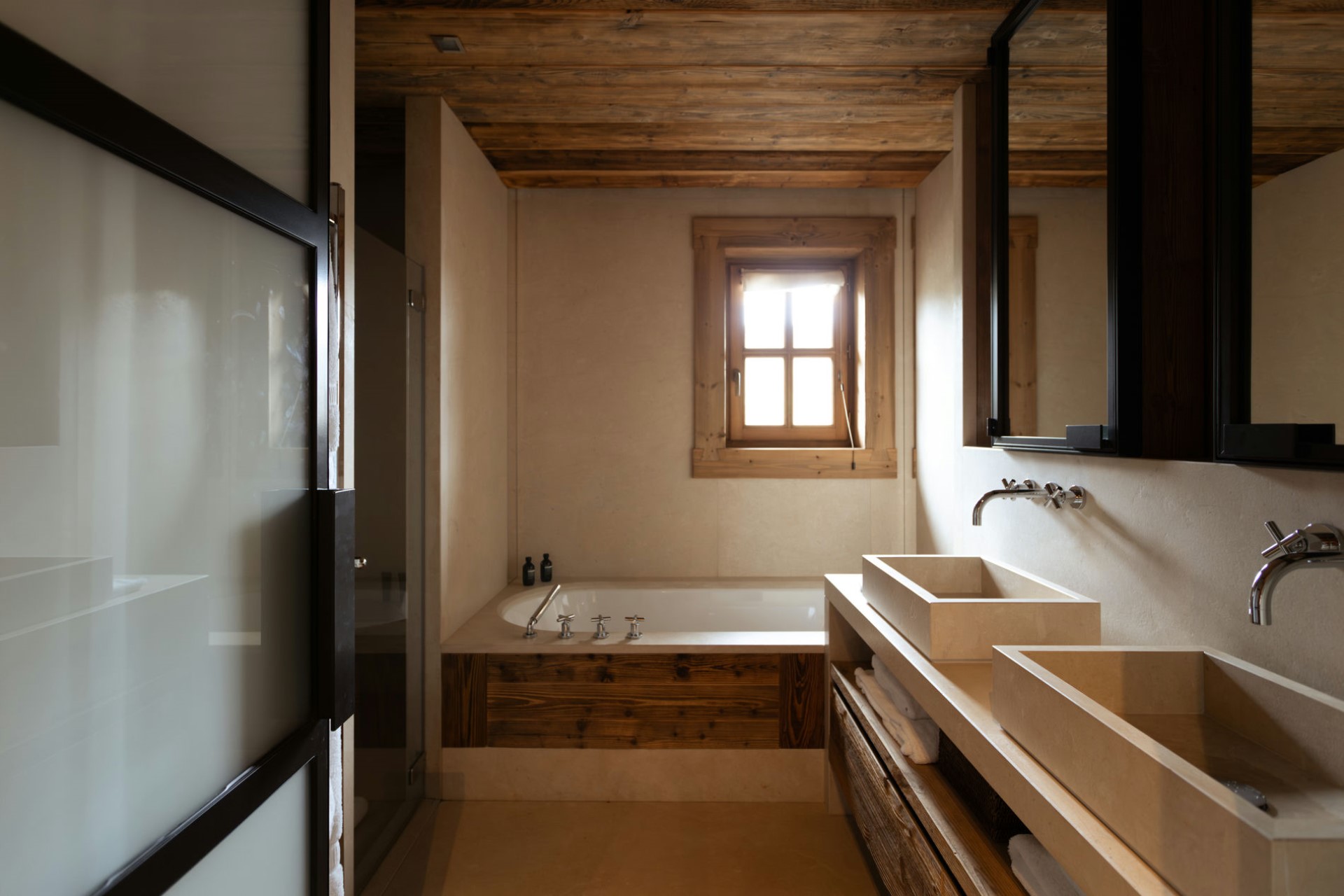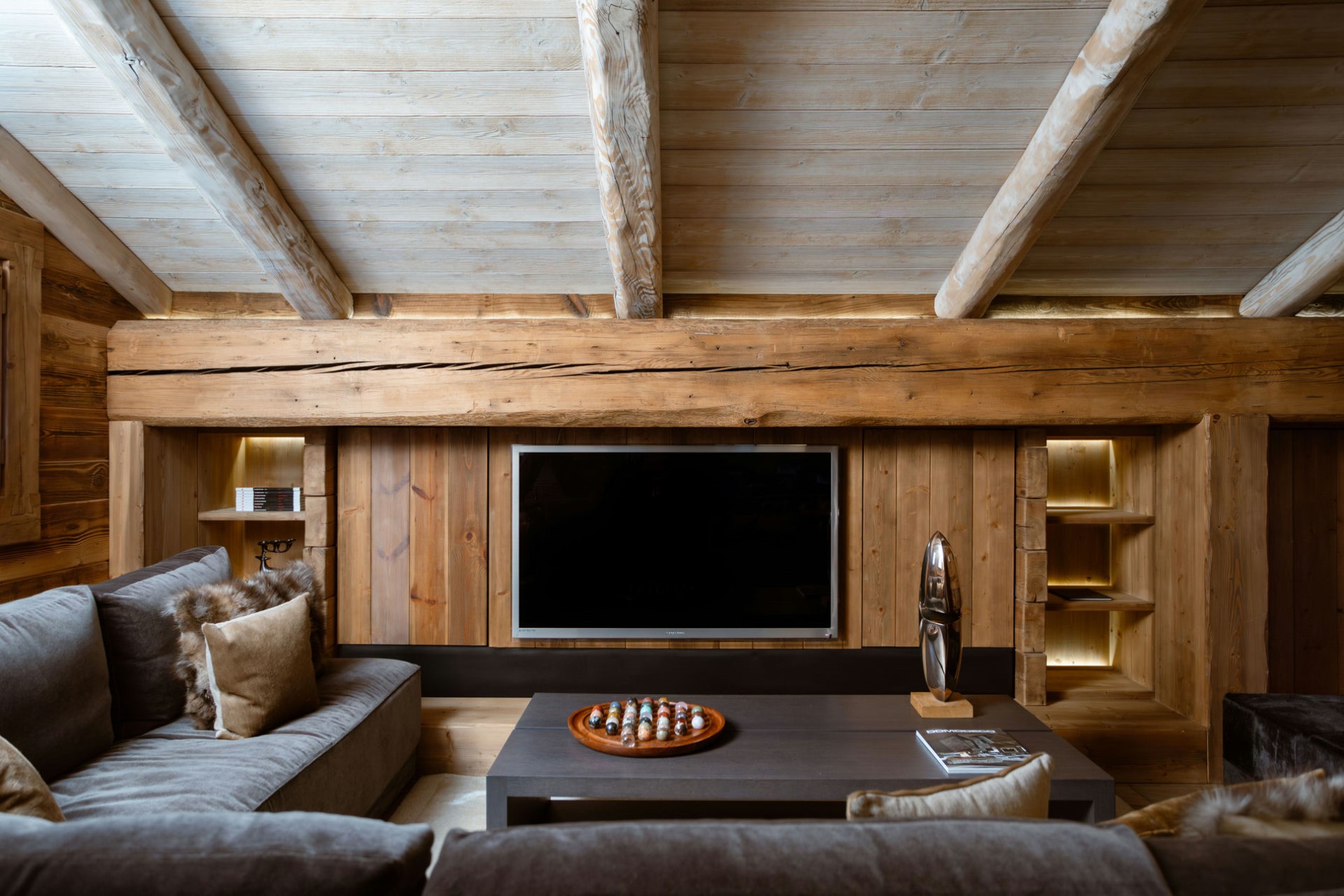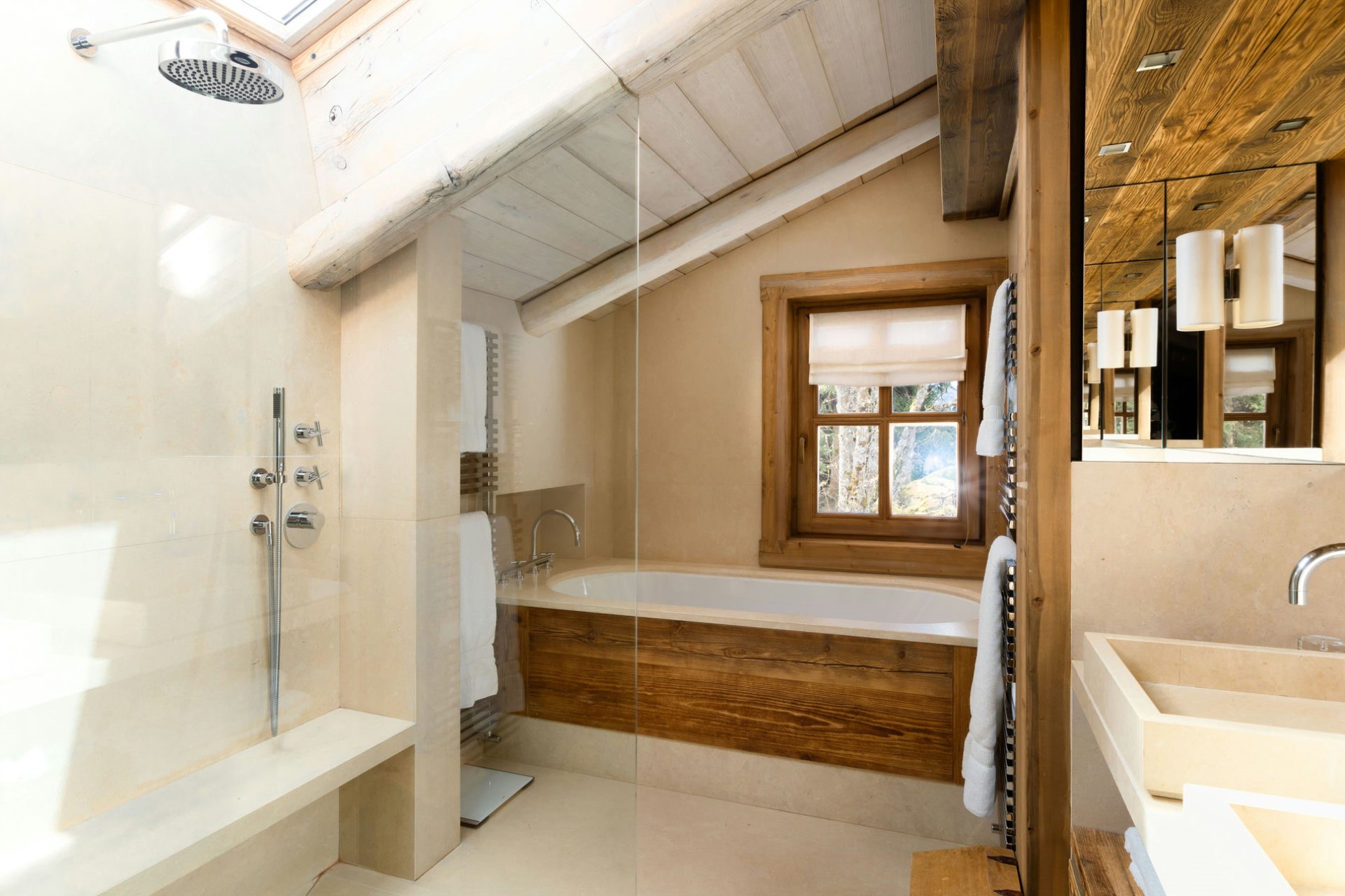 The interiors exude classic mountain style with a modern twist. Beamed ceilings, wood-panelled walls and an earthy colour scheme create a cosy alpine atmosphere. The main living area centres around a crackling fireplace. Large sofas offer plenty of space to relax, whilst the modern and elegant dining table is the perfect place to enjoy hearty mountain cuisine prepared in the semi-professional kitchen.