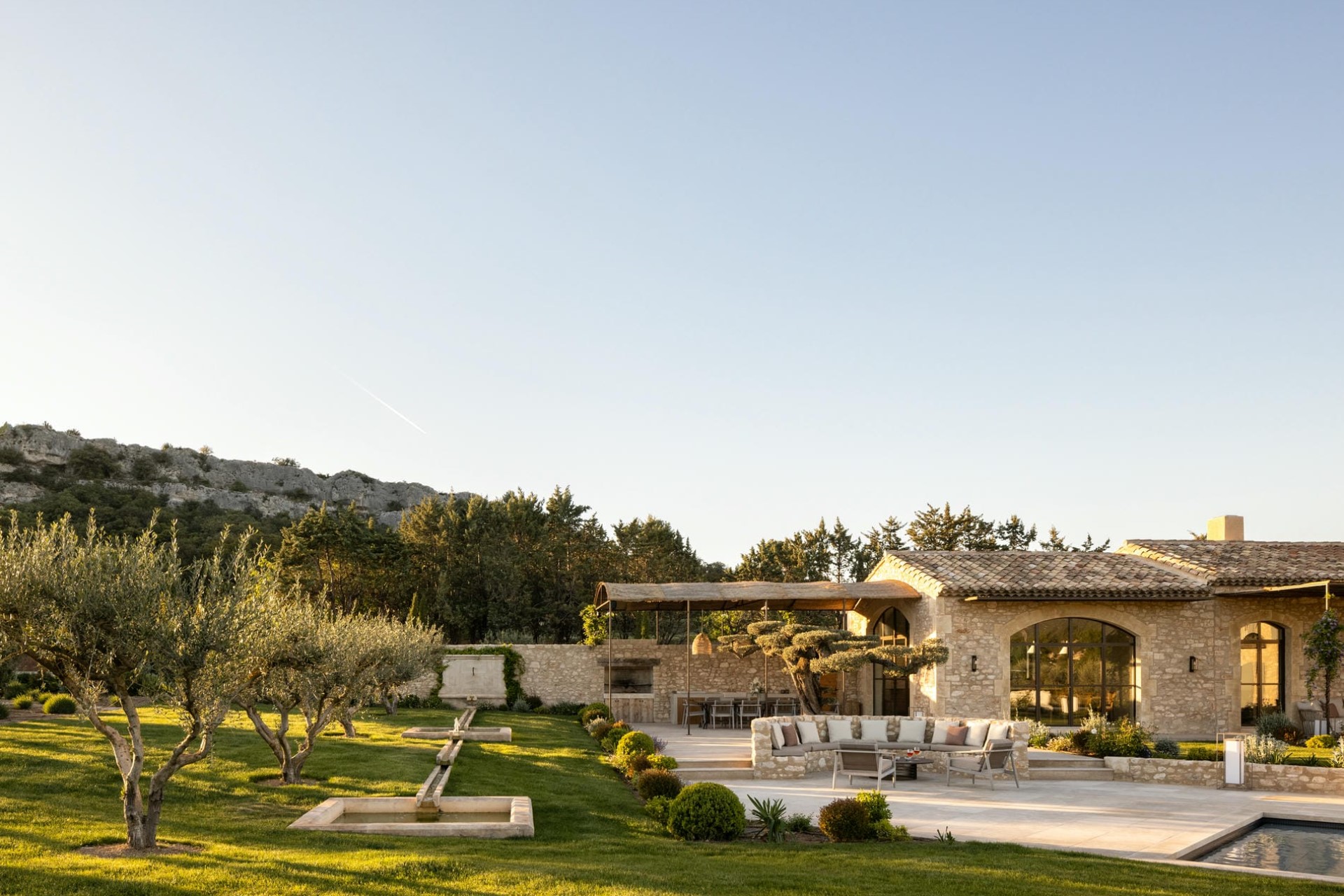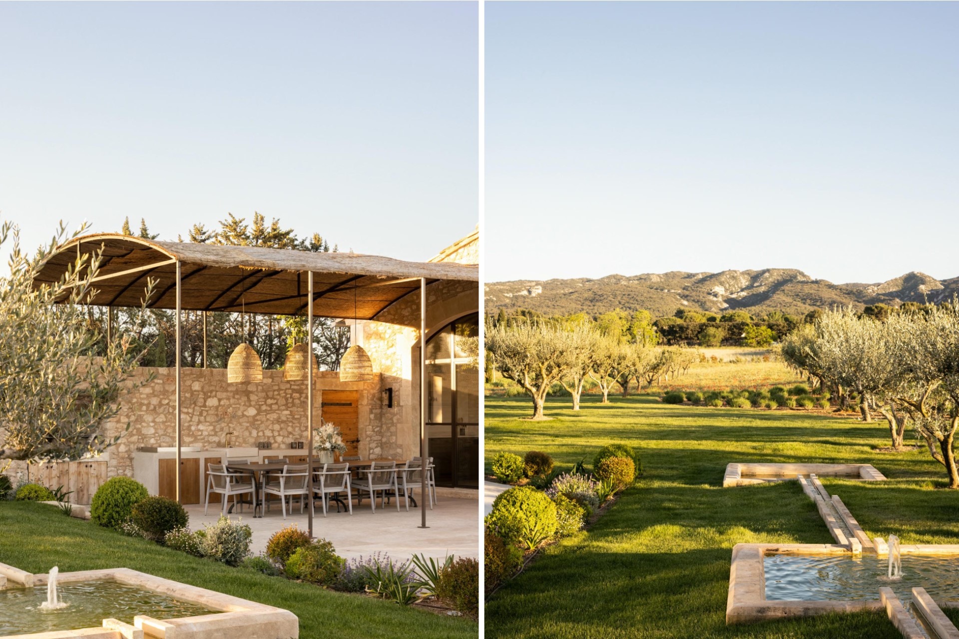 The meticulously designed gardens blend seamlessly with the surrounding countryside landscape and limestone hills, with a trickling water feature running along the olive tree-lined lawn.