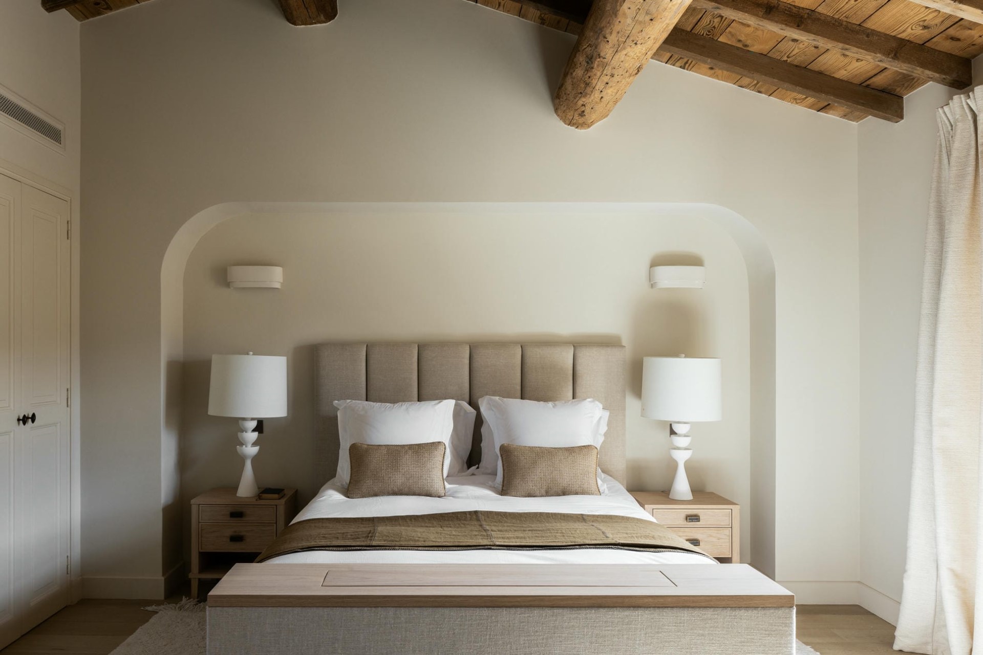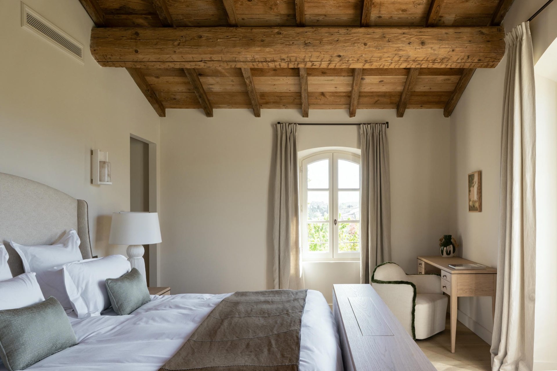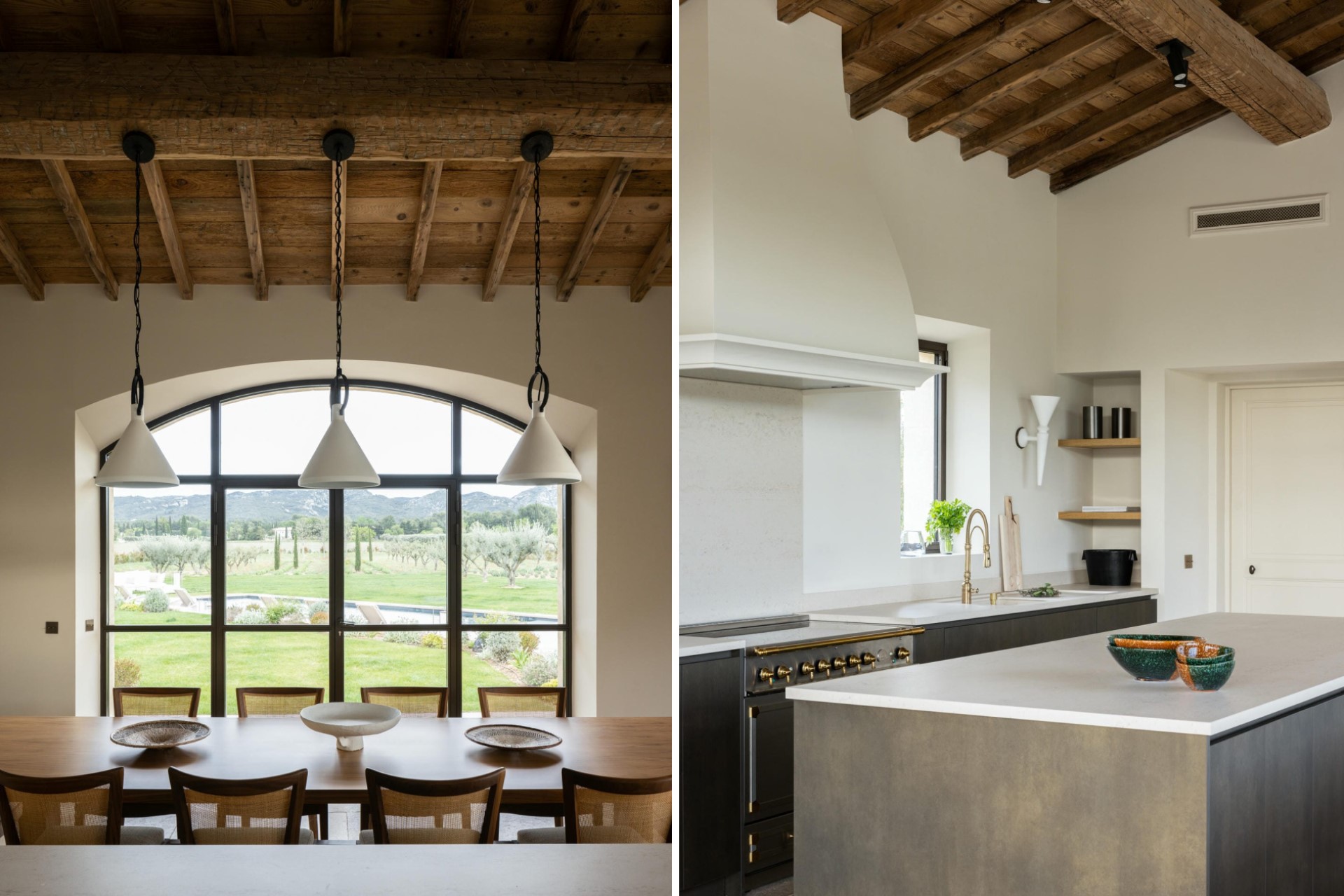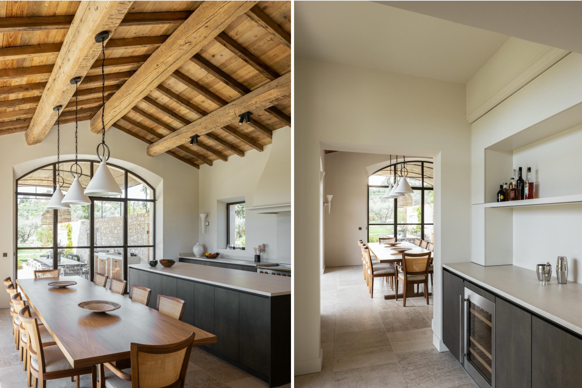 Inside the south-facing mas, the right wing is dedicated to the main living areas, bathed in natural light through large arched windows. The living room perfectly balances the old with the new with its exposed wooden beams, elegant fireplace, and understated modern décor, creating a welcoming space for socialising and relaxation. Adjacent is a large, open-plan kitchen featuring sleek modern units and a dining area comfortably seating up to twelve guests. Glass doors lead seamlessly from the kitchen and dining space to the outdoor dining area, perfect for creating lasting memories around delicious local fare.