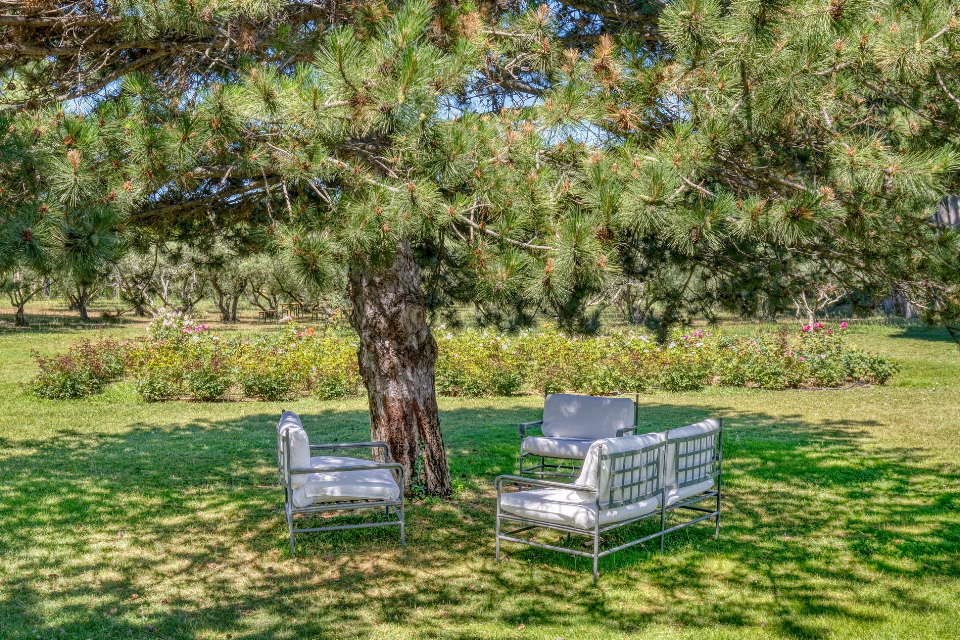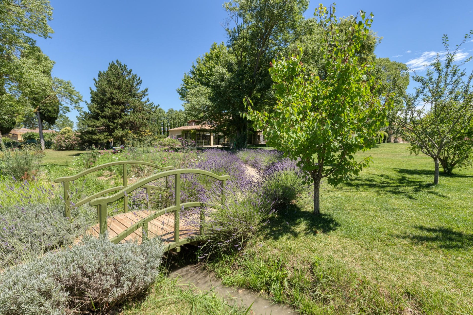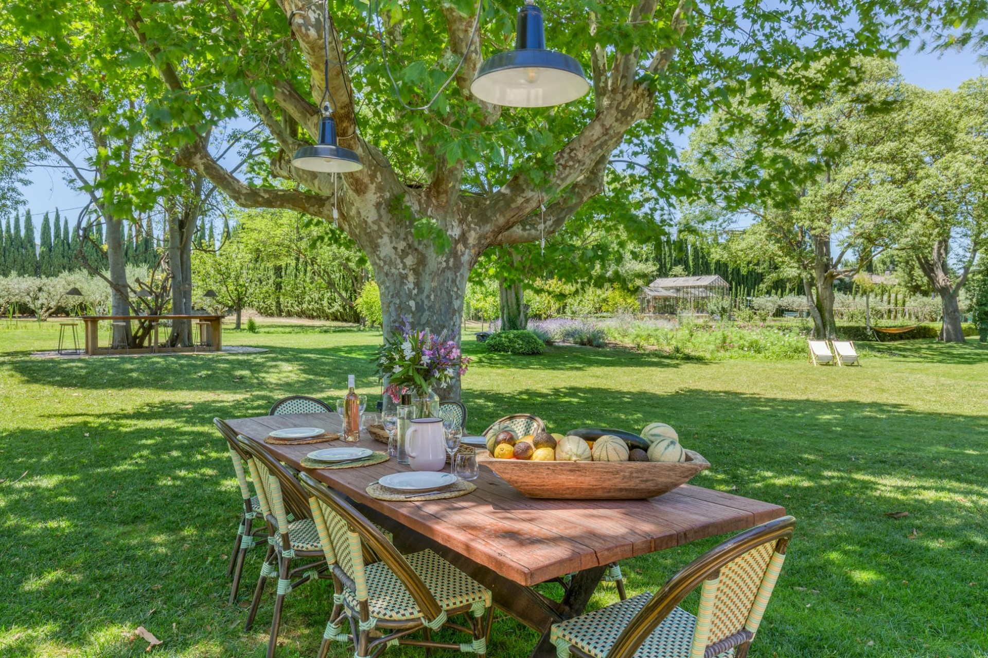 Expansive lawns and meticulously maintained gardens provide a serene backdrop for relaxation, allowing guests to bask in the tranquil Provençal sunshine. Across the lush lawns are various seating and dining options, including a dining table under the shade of plane trees and an aperitif area with bar seating wrapped around tree trunks.