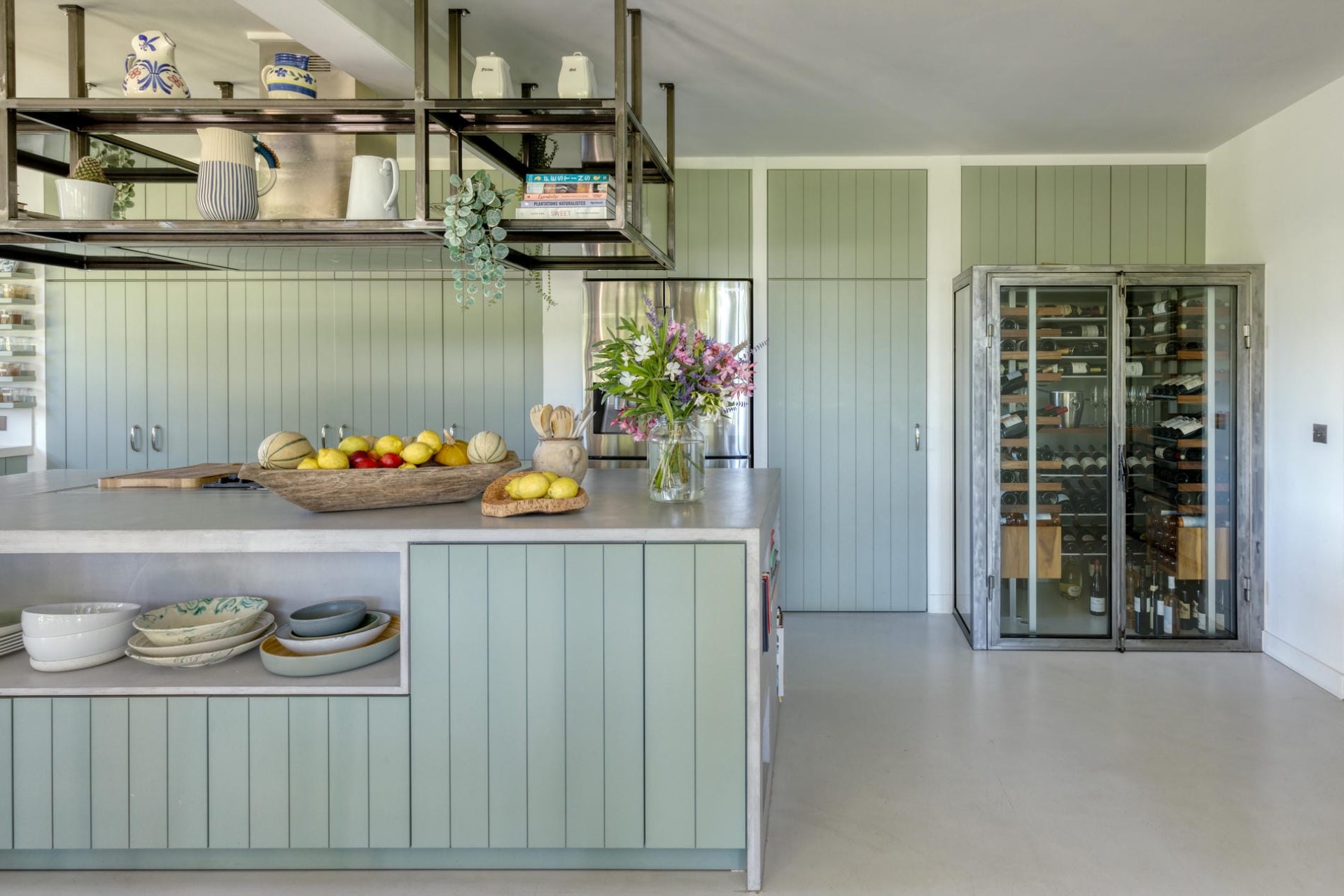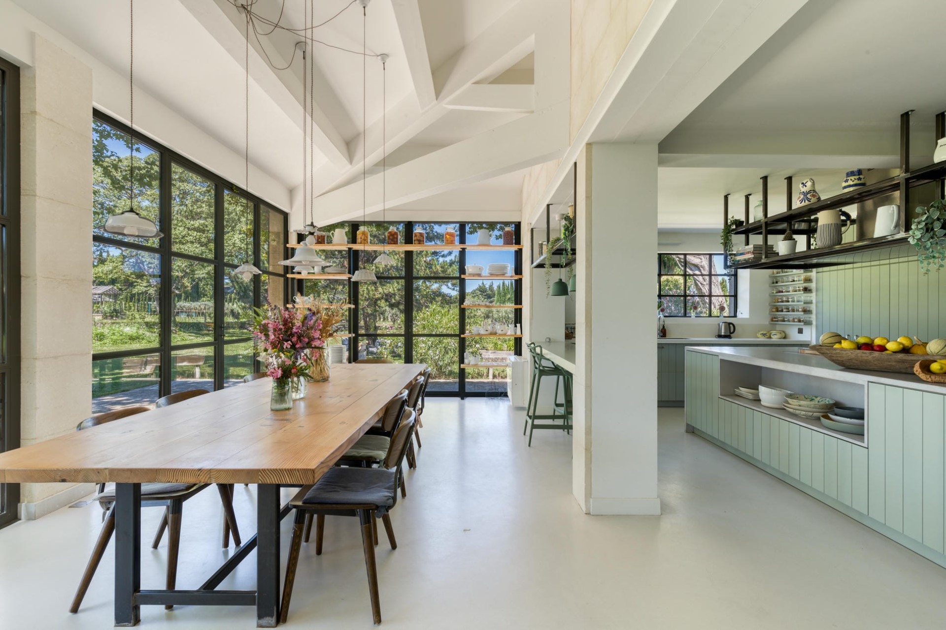 Adjoining the lounge is a modern country-style kitchen and dining room with floor-to-ceiling windows that flood the space with light and offer beautiful garden views.