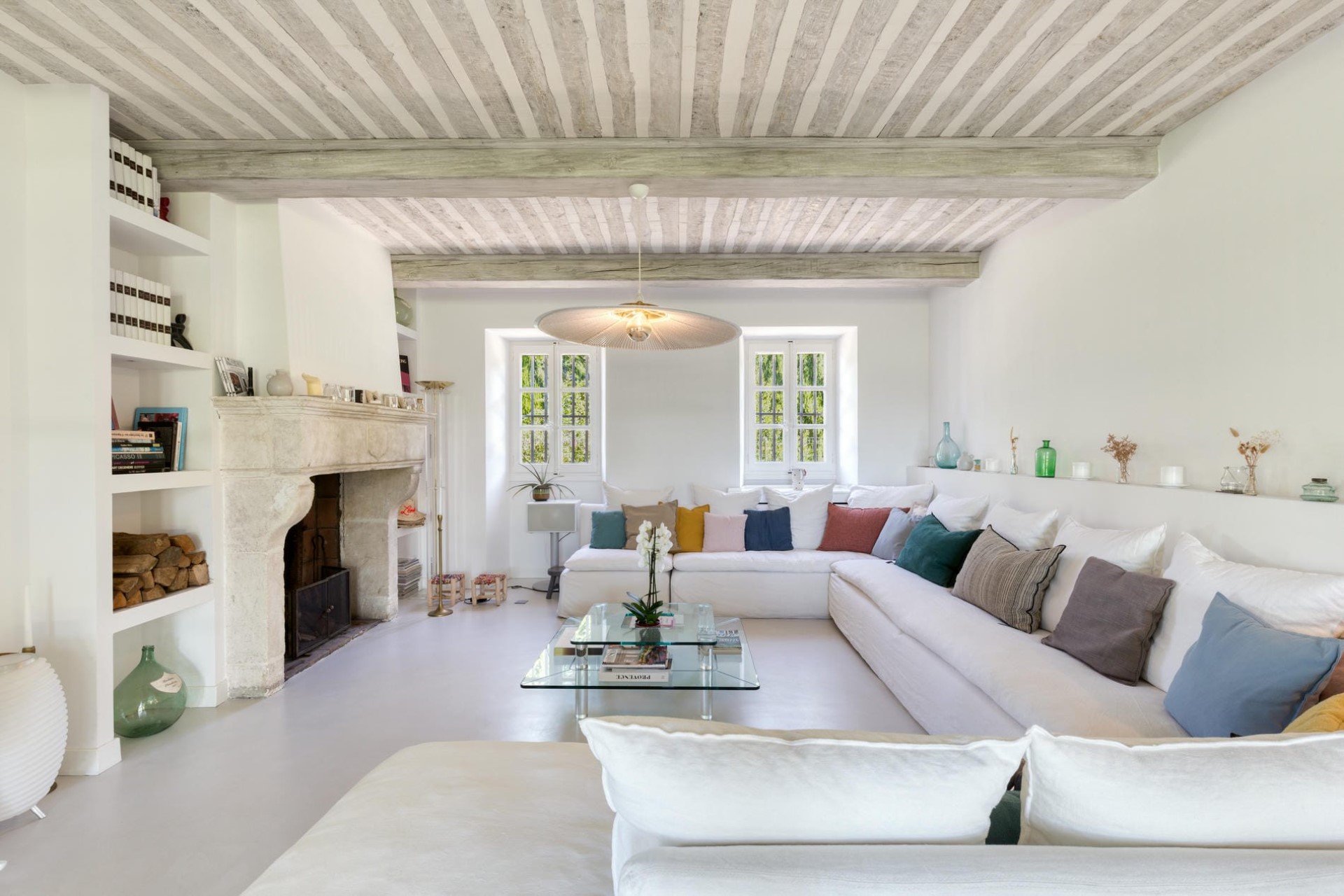 Indoors, there is plenty more space for relaxation. The heart of the home is the vast living room with plush white sofas around a traditional fireplace, a retractable wide-screen TV, and a shiny black piano.