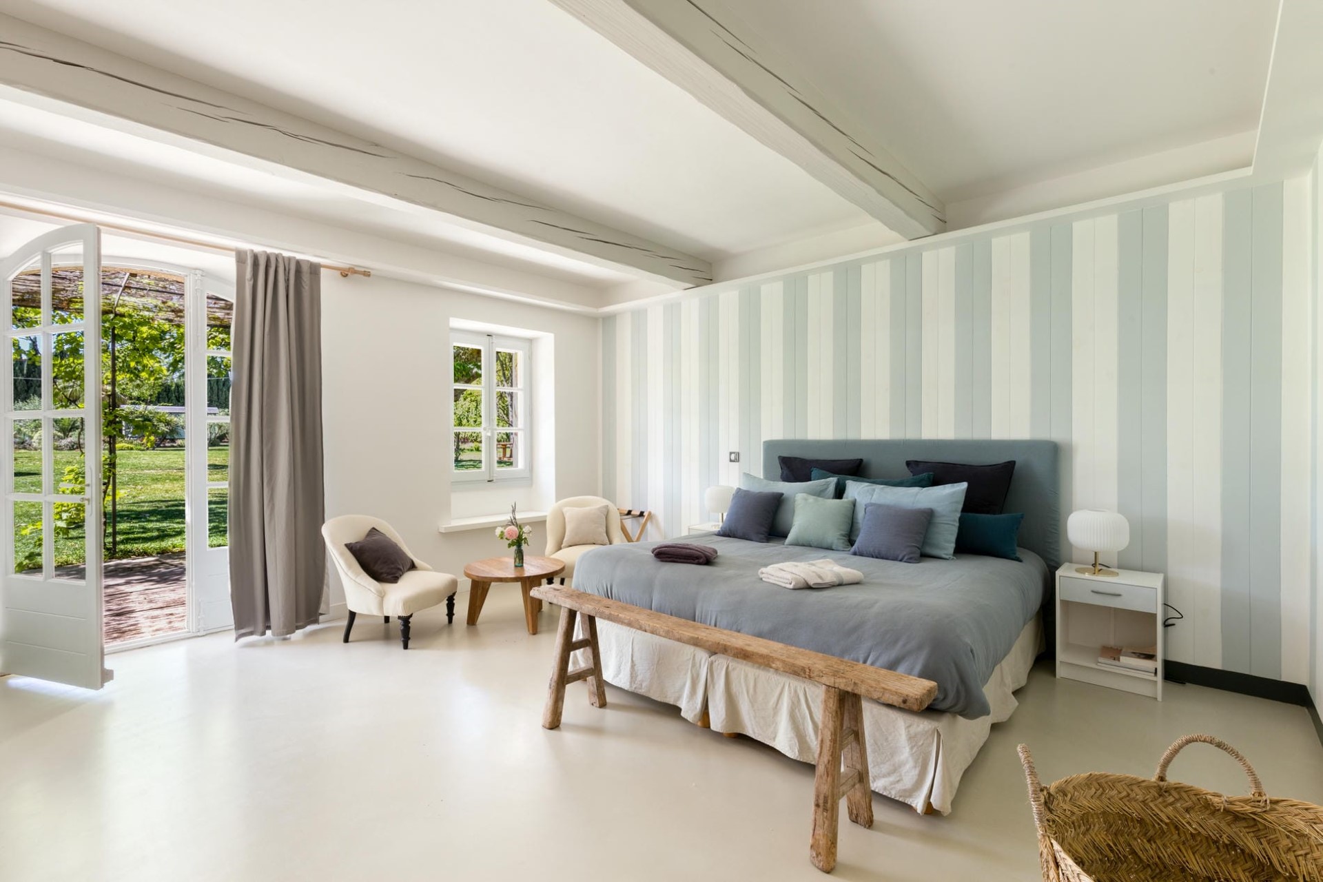 Bedroom 1 – king-size bed (converted to twins on request), en-suite bathroom with bathtub/shower, and garden access