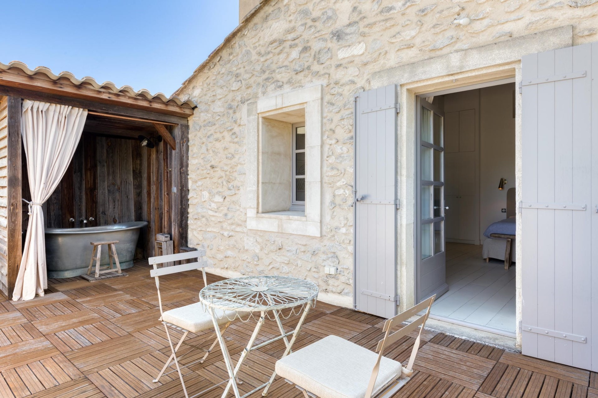 Bedroom 3 (Master) – queen-size bed, en-suite bathroom with shower + private terrace with bathtub, and shared terrace access