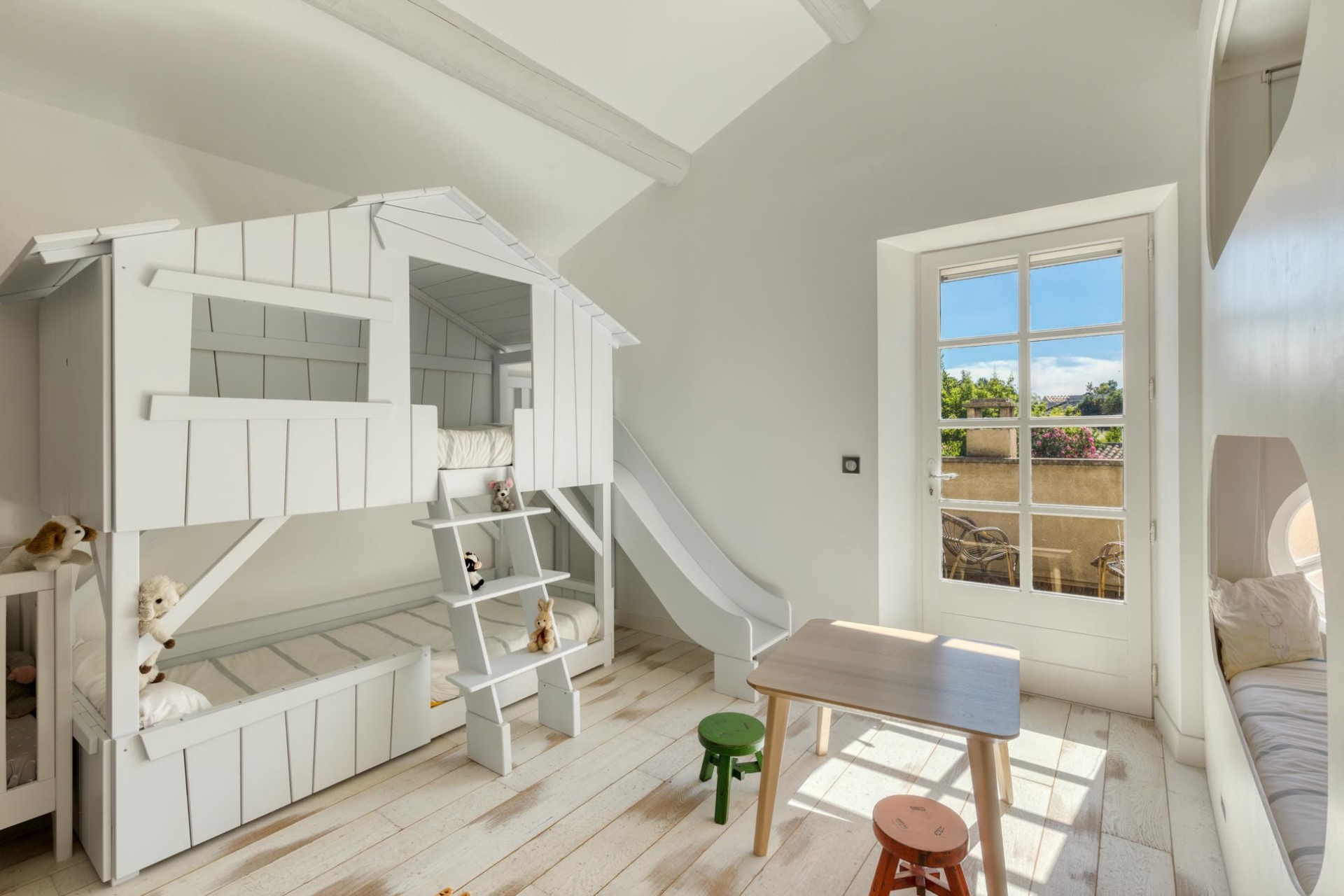 Bedroom 5 (Family Suite) – 2 x bunk beds (sleeps 4) + baby cot, shared bathroom with bathtub & separate shower, and shared terrace access