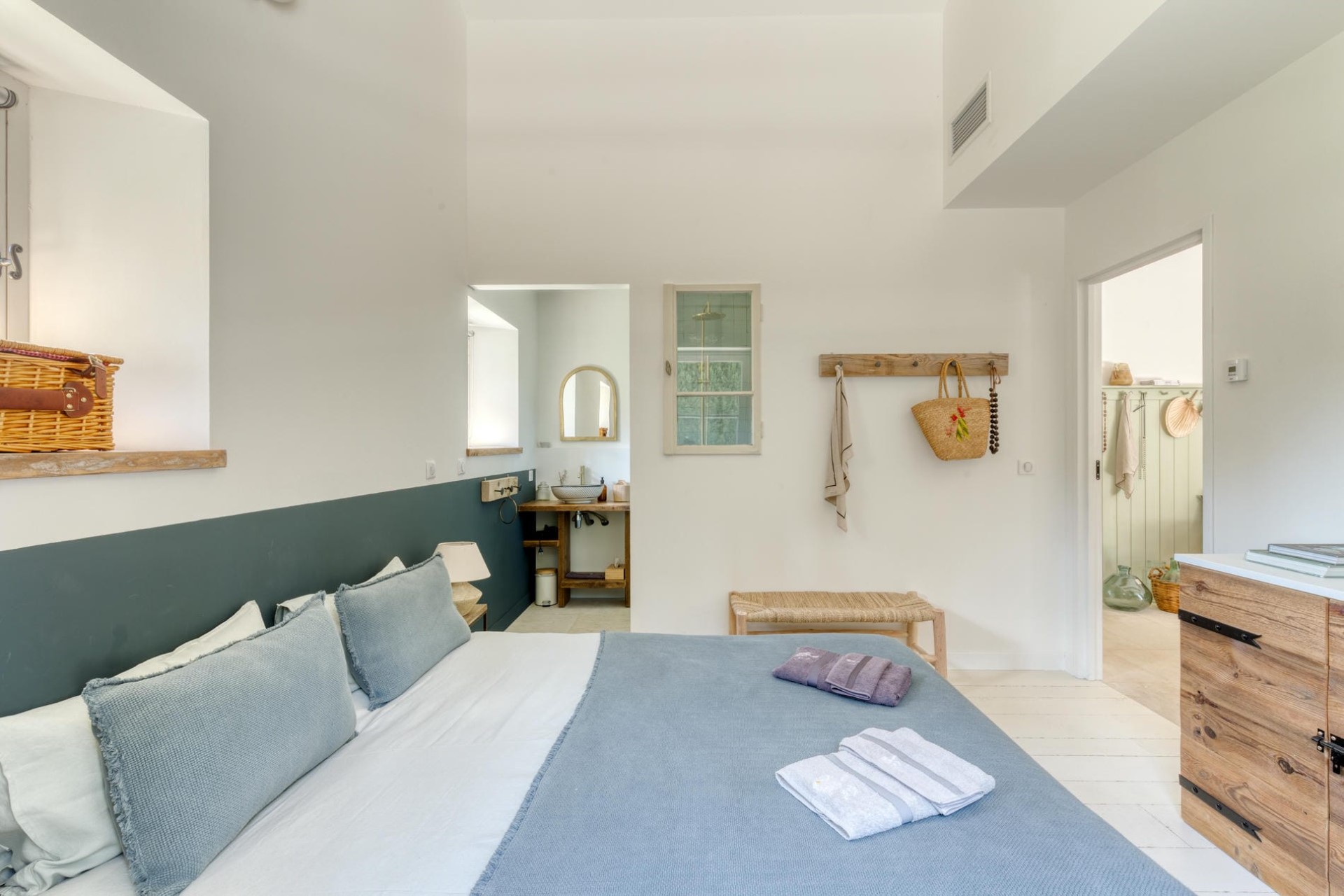 Bedroom 2 – king-size bed (converted to twins on request), en-suite bathroom with shower, and garden access
