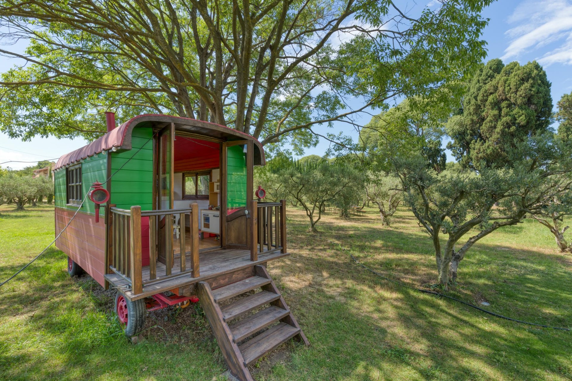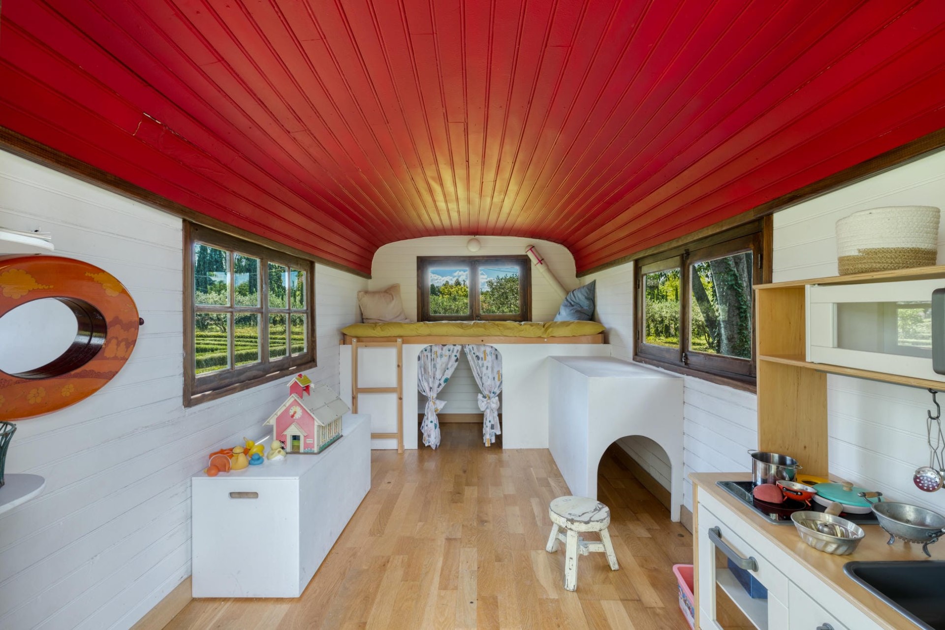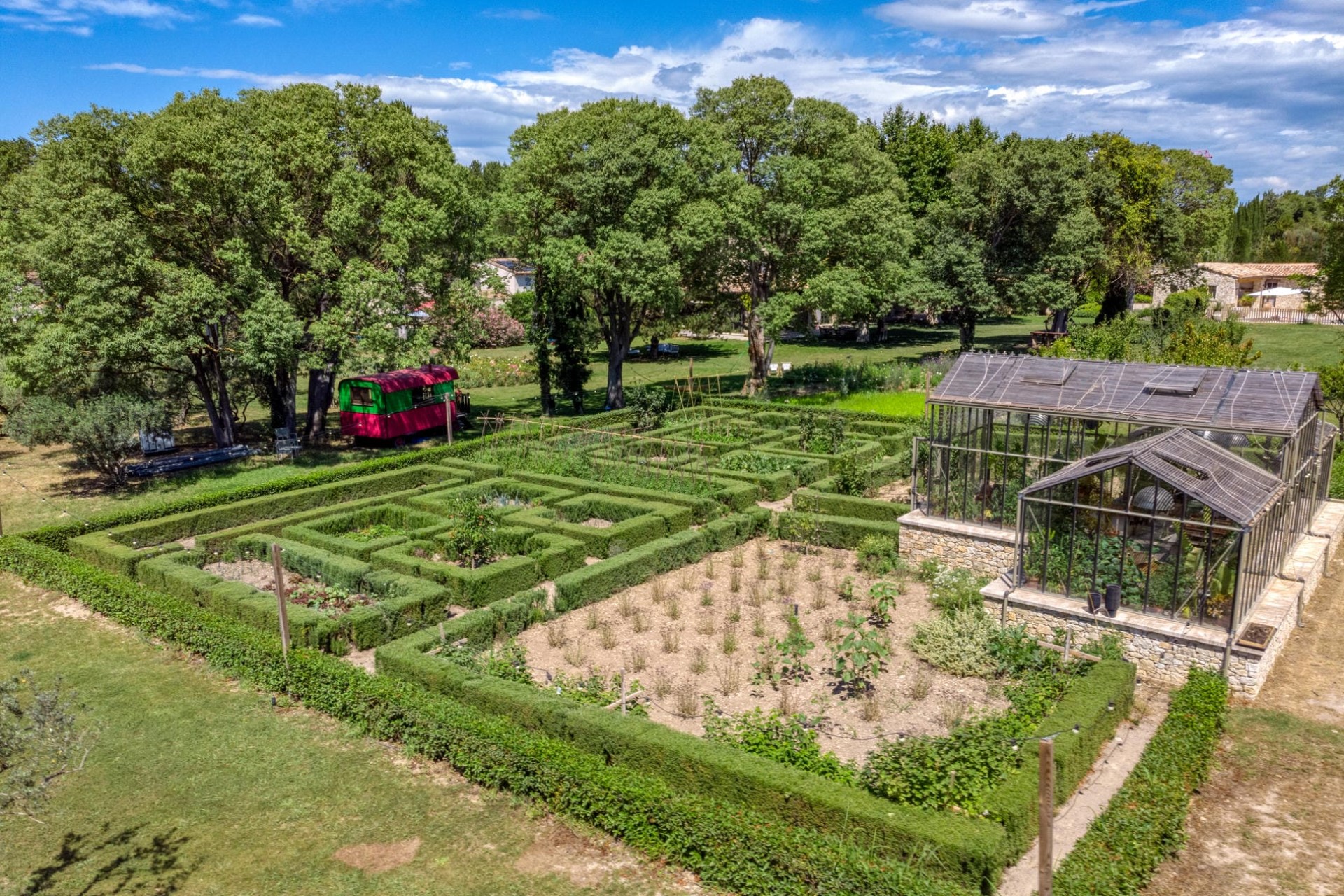 Stepping across a trickling stream to the other side of the grounds, guests will find a large greenhouse, perfect for a morning coffee, a stunning rose garden for picturesque walks, and a vegetable garden providing plenty of fresh produce. Moreover, a unique playhouse within a Bohemian caravan is perfect for families with children.