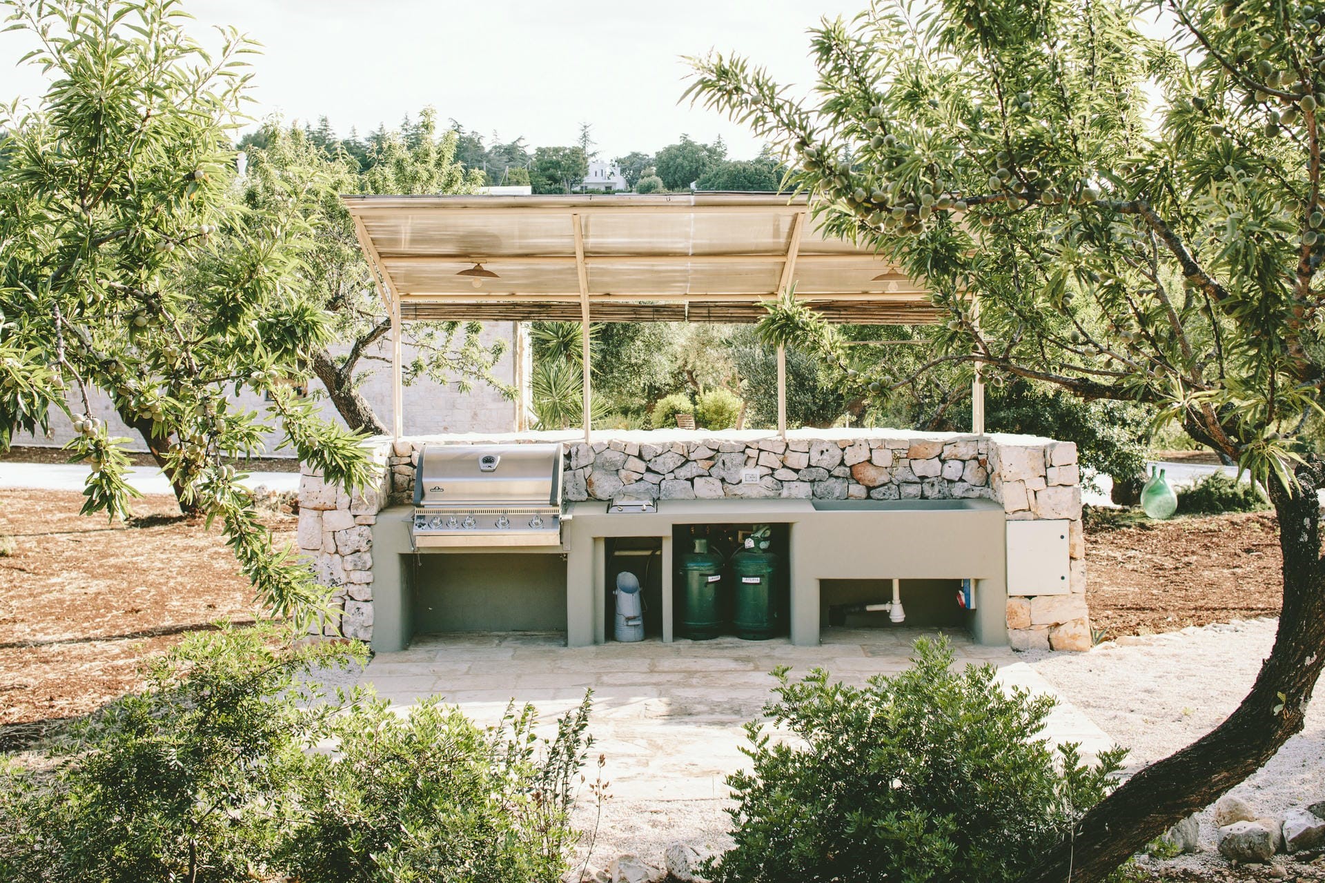 At the heart of the masseria lies a large, heated swimming pool, bordered by expansive terraces, sun loungers, and shady pergolas for cooling off in the heat of the day. The extensive gardens are thoughtfully landscaped, with open lawns, gravel paths and quiet corners for rest or reading beneath mature olive trees. A rooftop terrace offers panoramic countryside views, while a traditional dining gazebo is served by the outdoor kitchen with a built-in barbecue and wood-fired pizza oven, ideal for long lunches or gatherings as the sun sets. Generous outdoor lounge areas complete the open-air setup, and younger guests can enjoy the space to roam or bounce on the garden trampoline.