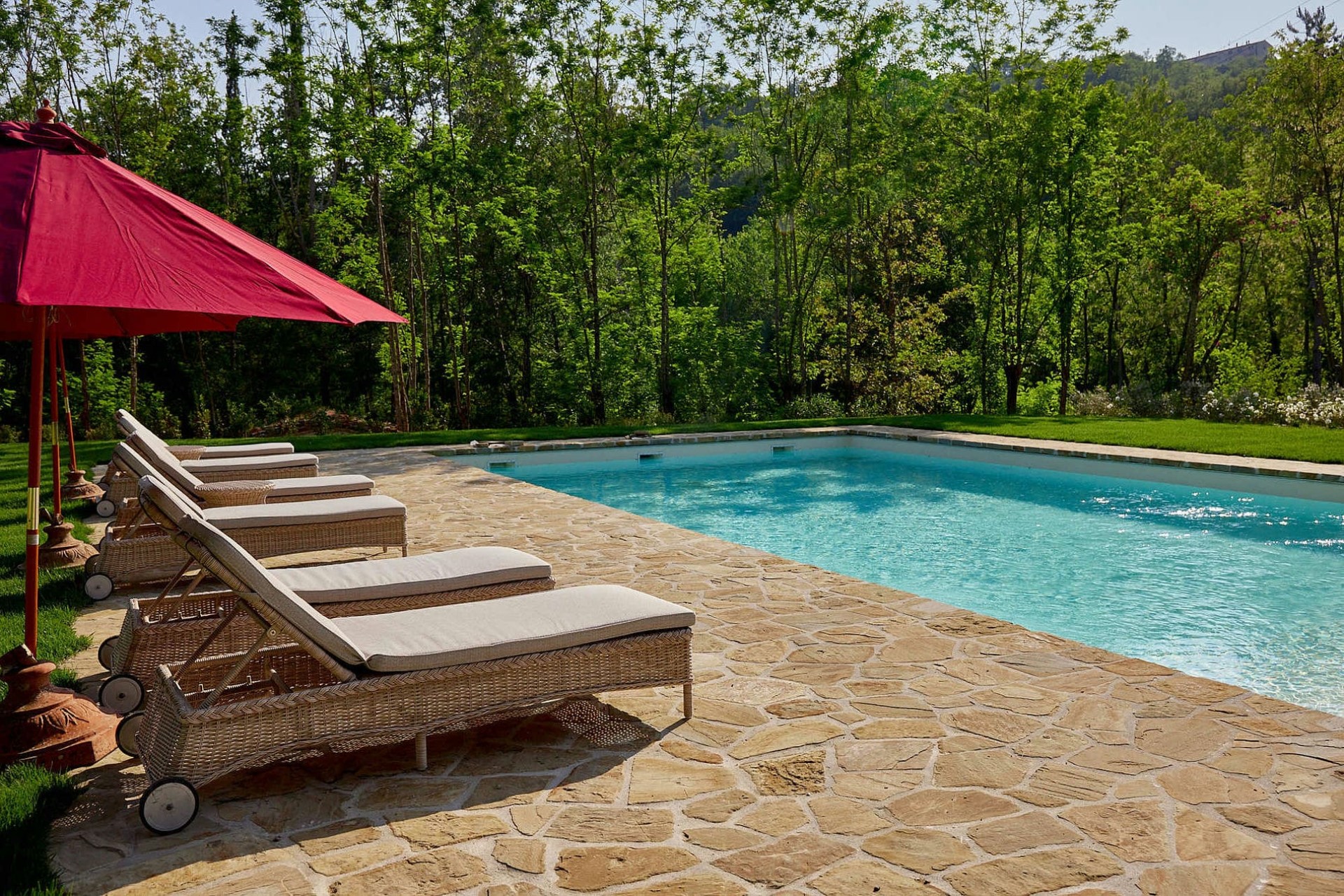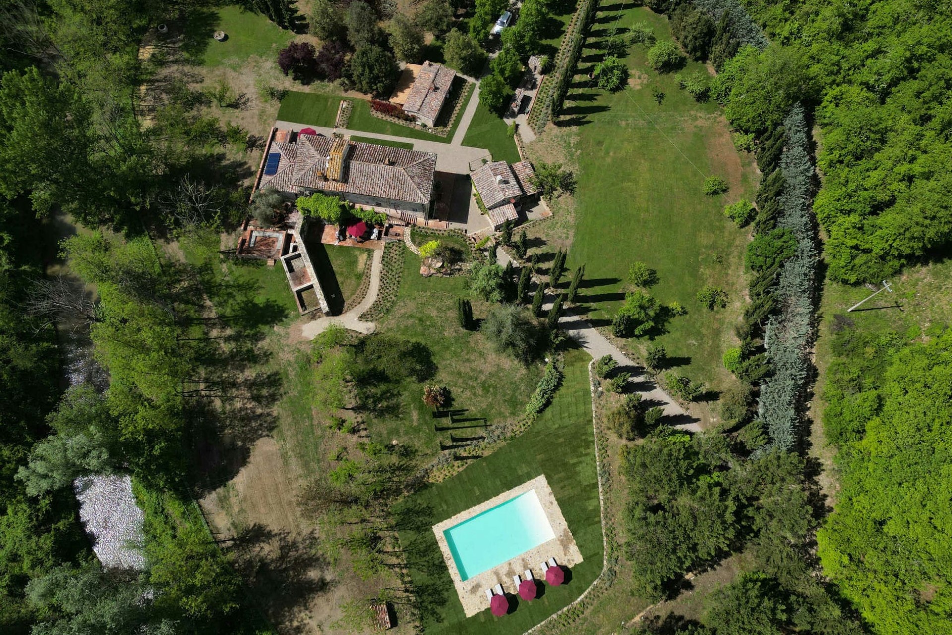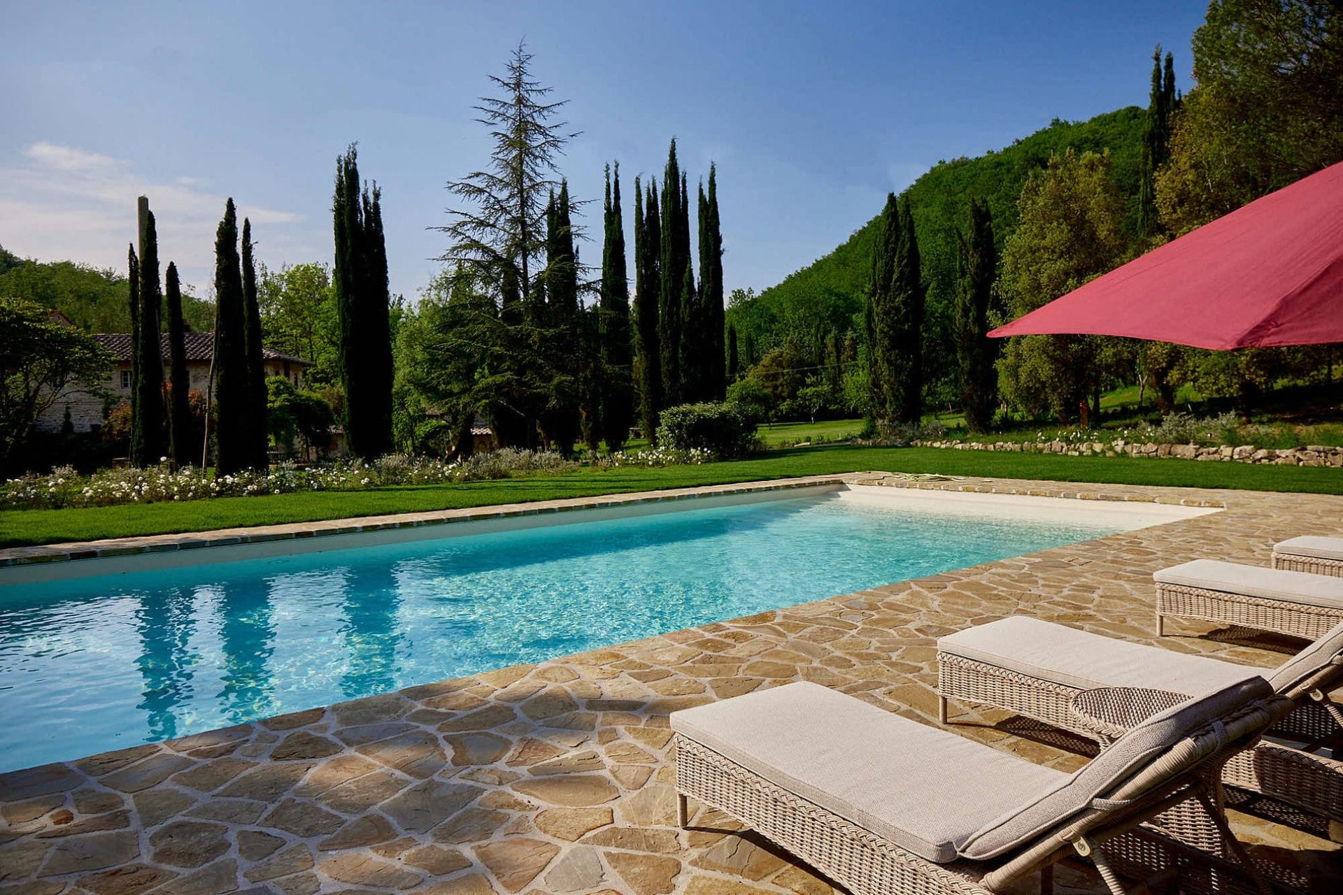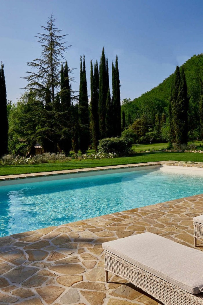 The sprawling grounds offer plenty of space for guests to relax surrounded by lush vegetation. The scent of cypress trees fills the air, whilst the trickling of the nearby river serves as a peaceful soundtrack to afternoons spent lazing by the pool, taking in the views from a sun lounger.