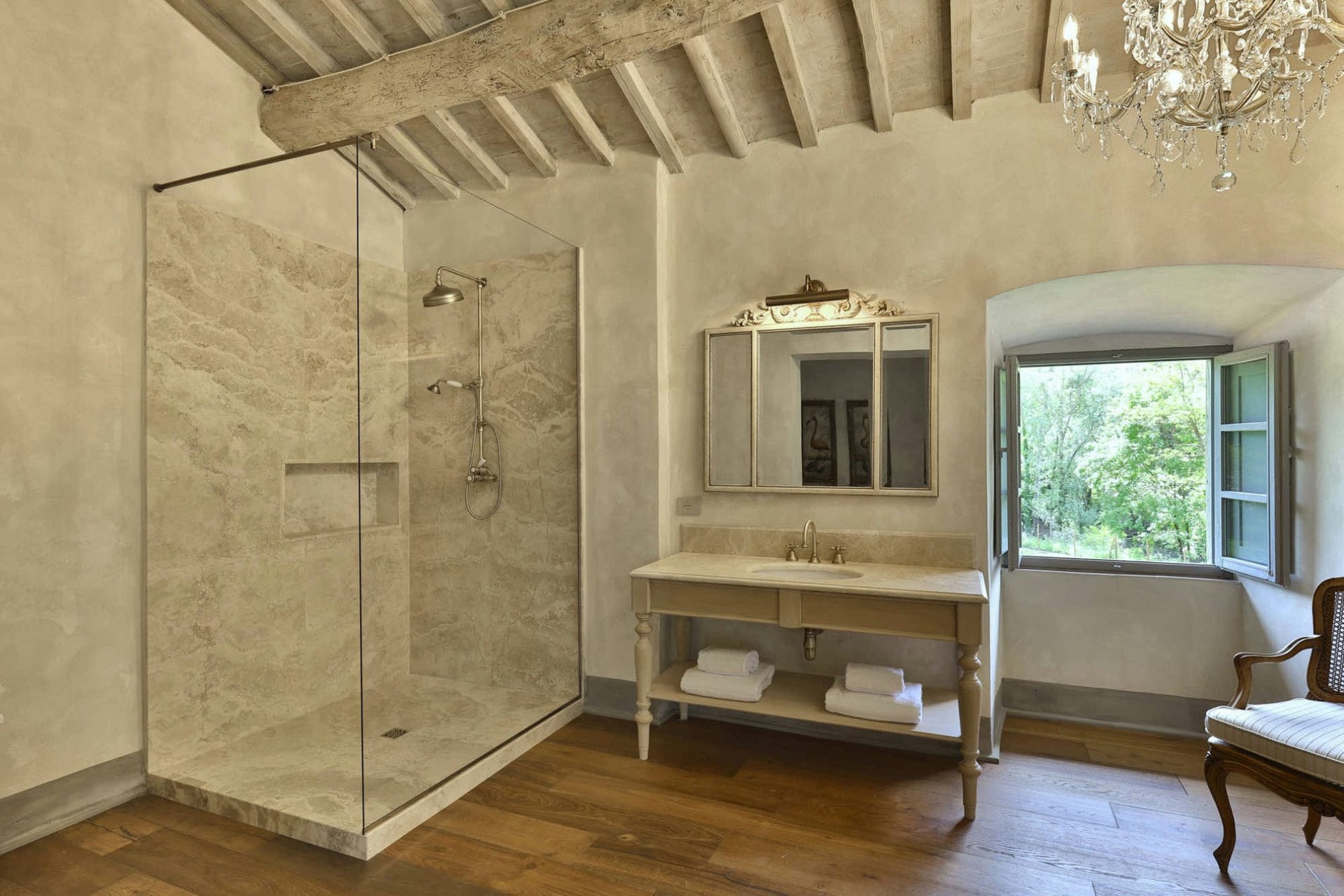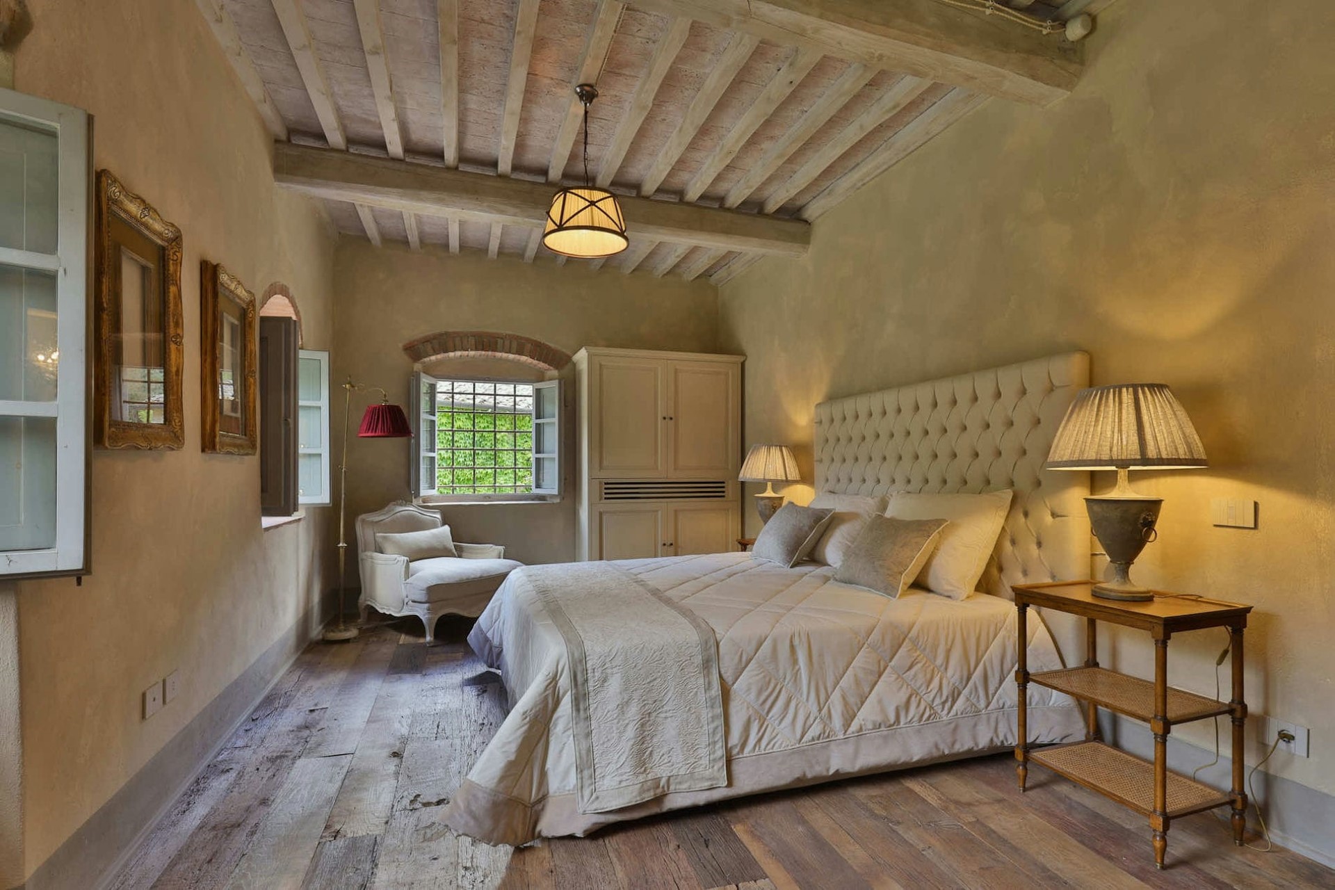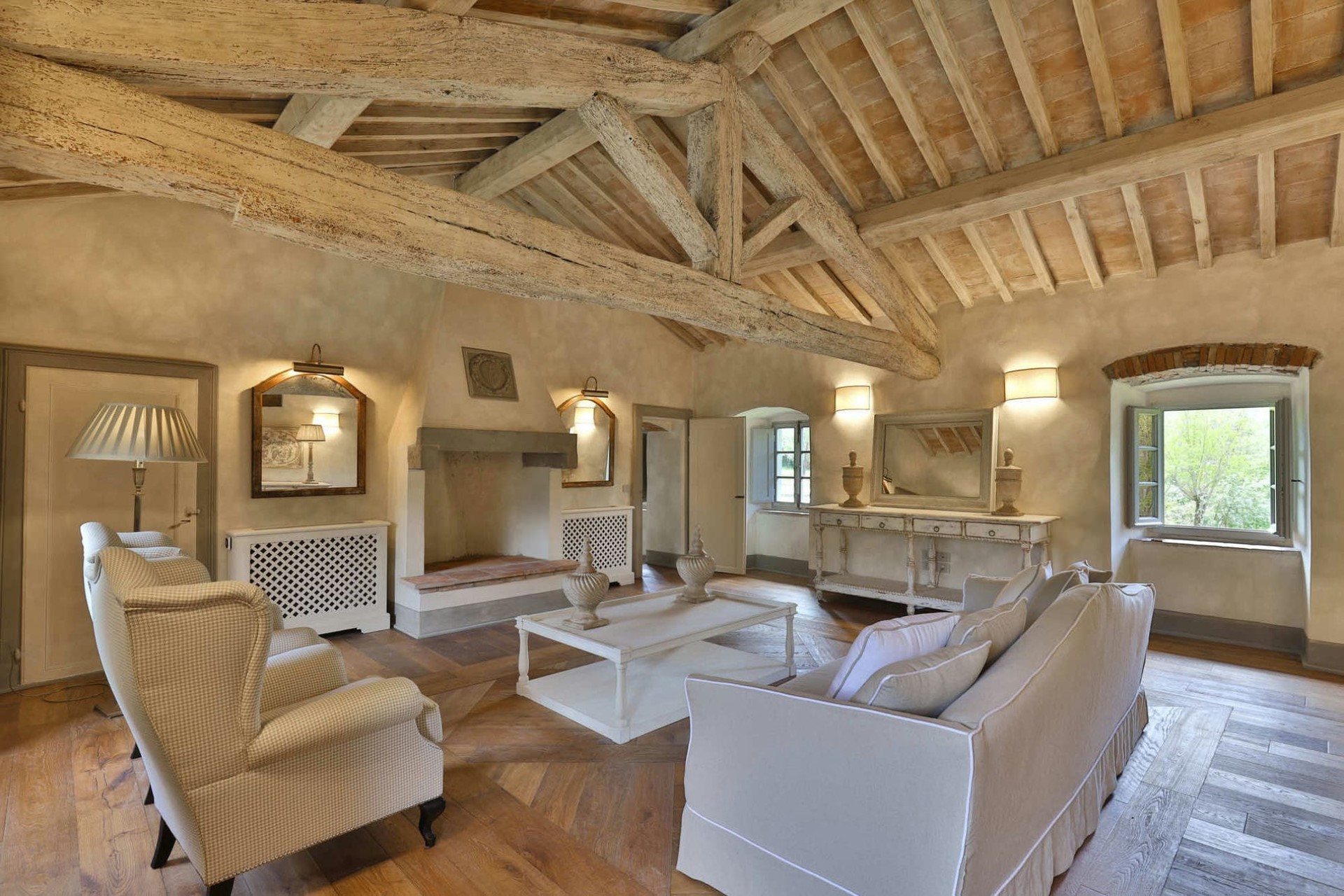 On the first floor, there is another spacious lounge room. The exposed beams of the central truss and the impressive fireplace create a welcoming atmosphere, whilst shuttered windows offer stunning views over the estate’s gardens.