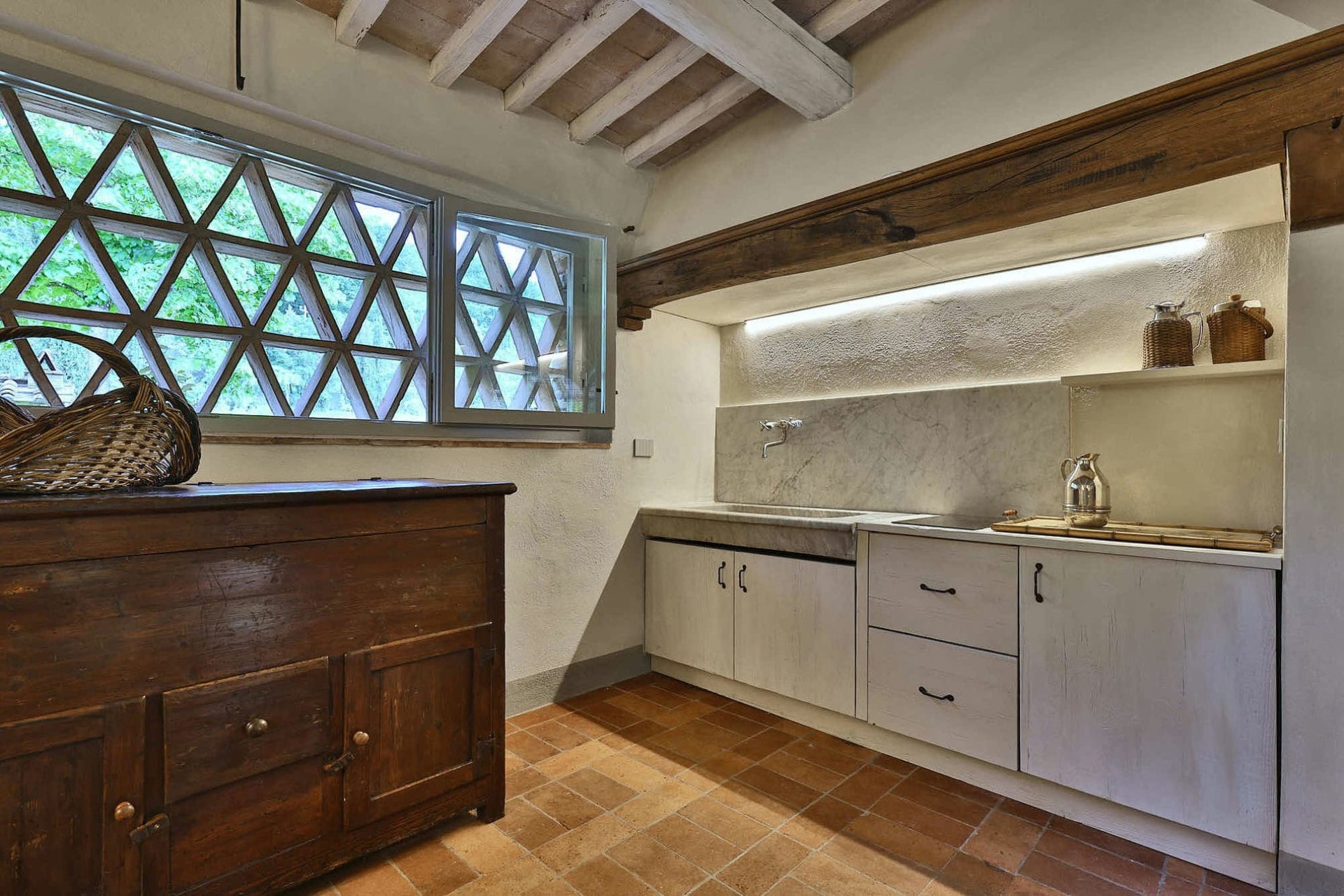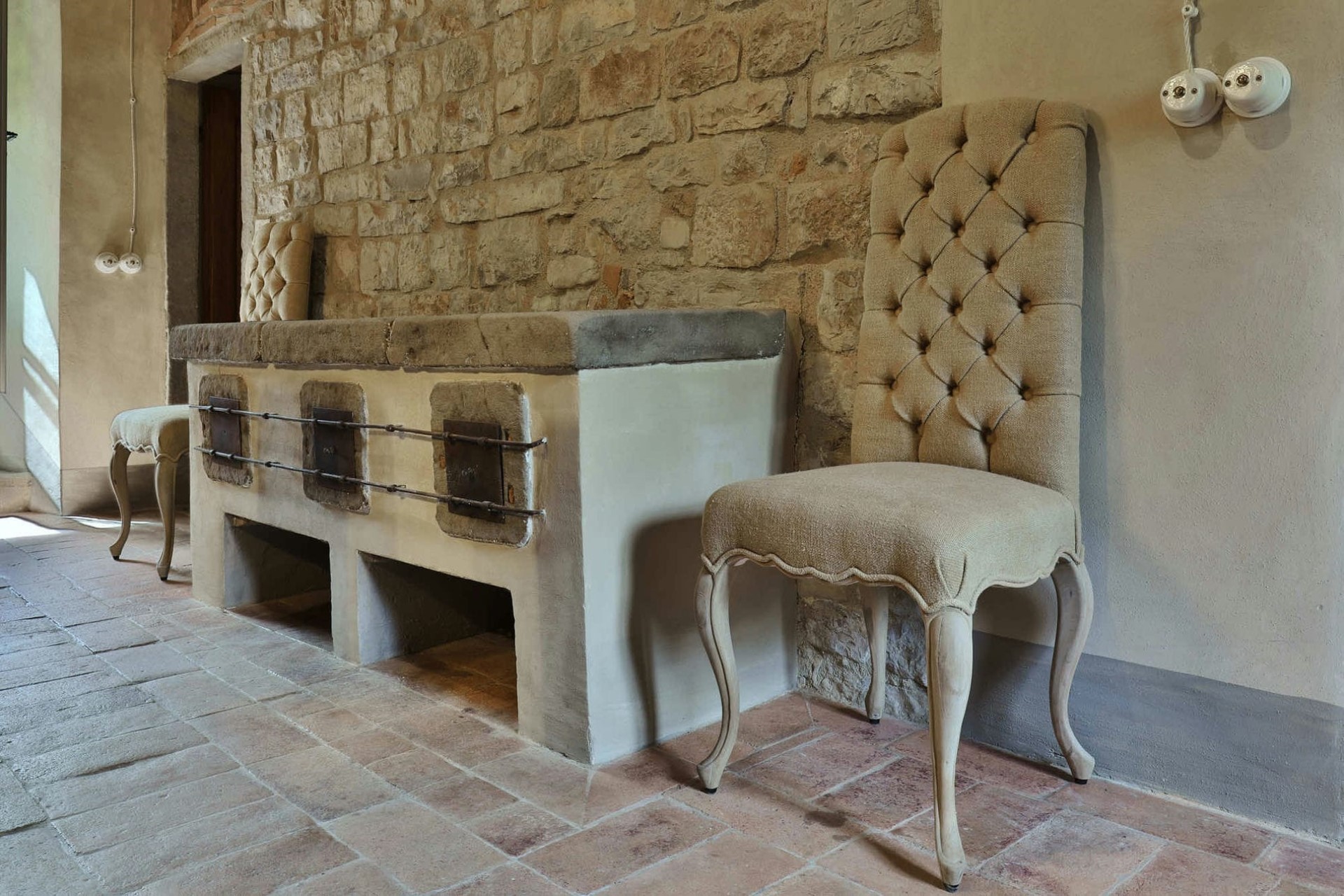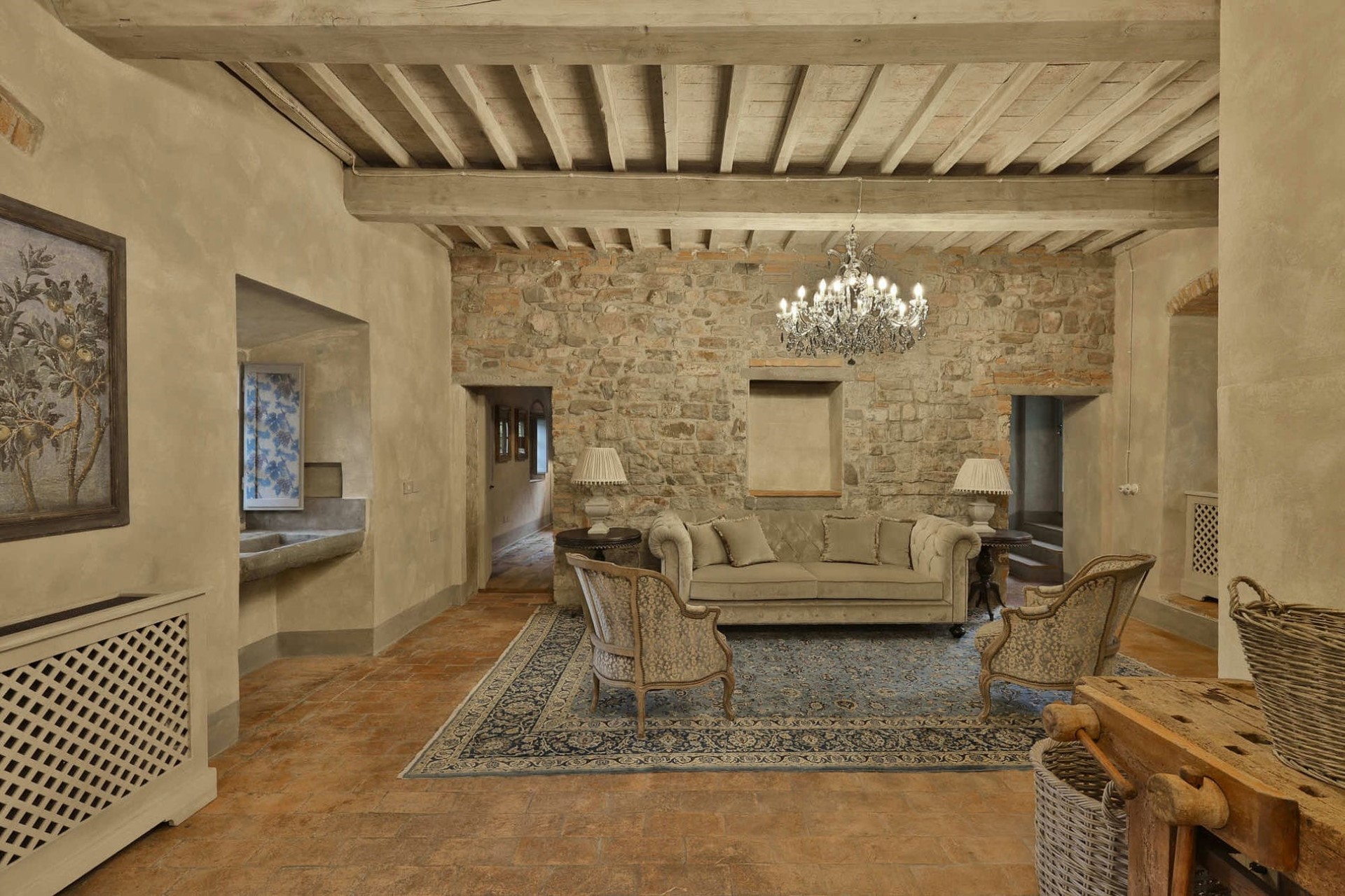 Indoors, exposed wooden beams, parquet flooring, and stone walls create an authentic country house feel. Within the main villa, the cosy ground floor lounge is heated by a crackling fireplace, perfect for cooler evenings spent indoors. The grand dining room boasts a fireplace and the perfectly preserved remains of the original kitchen, dating back to the 4th Century AD.