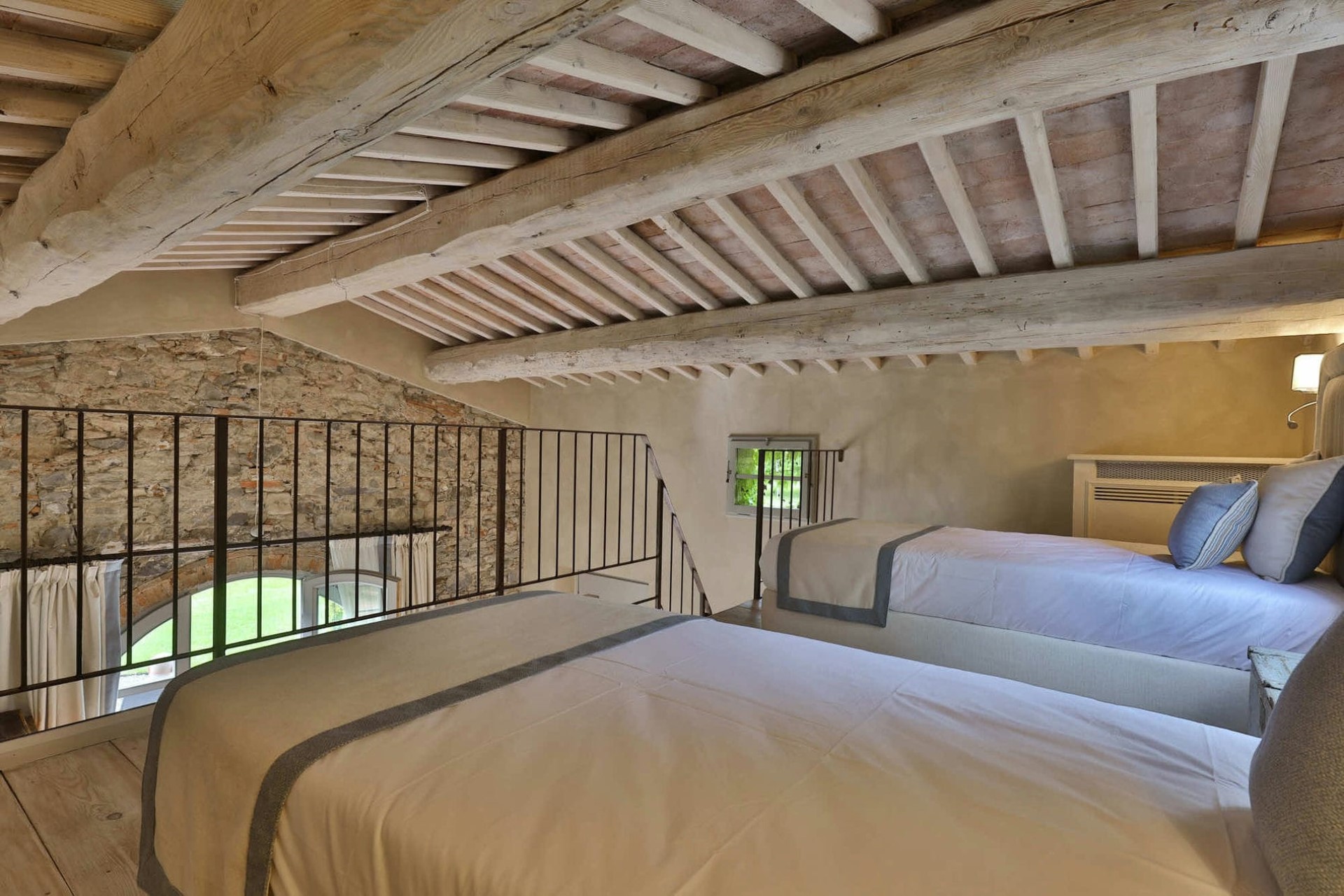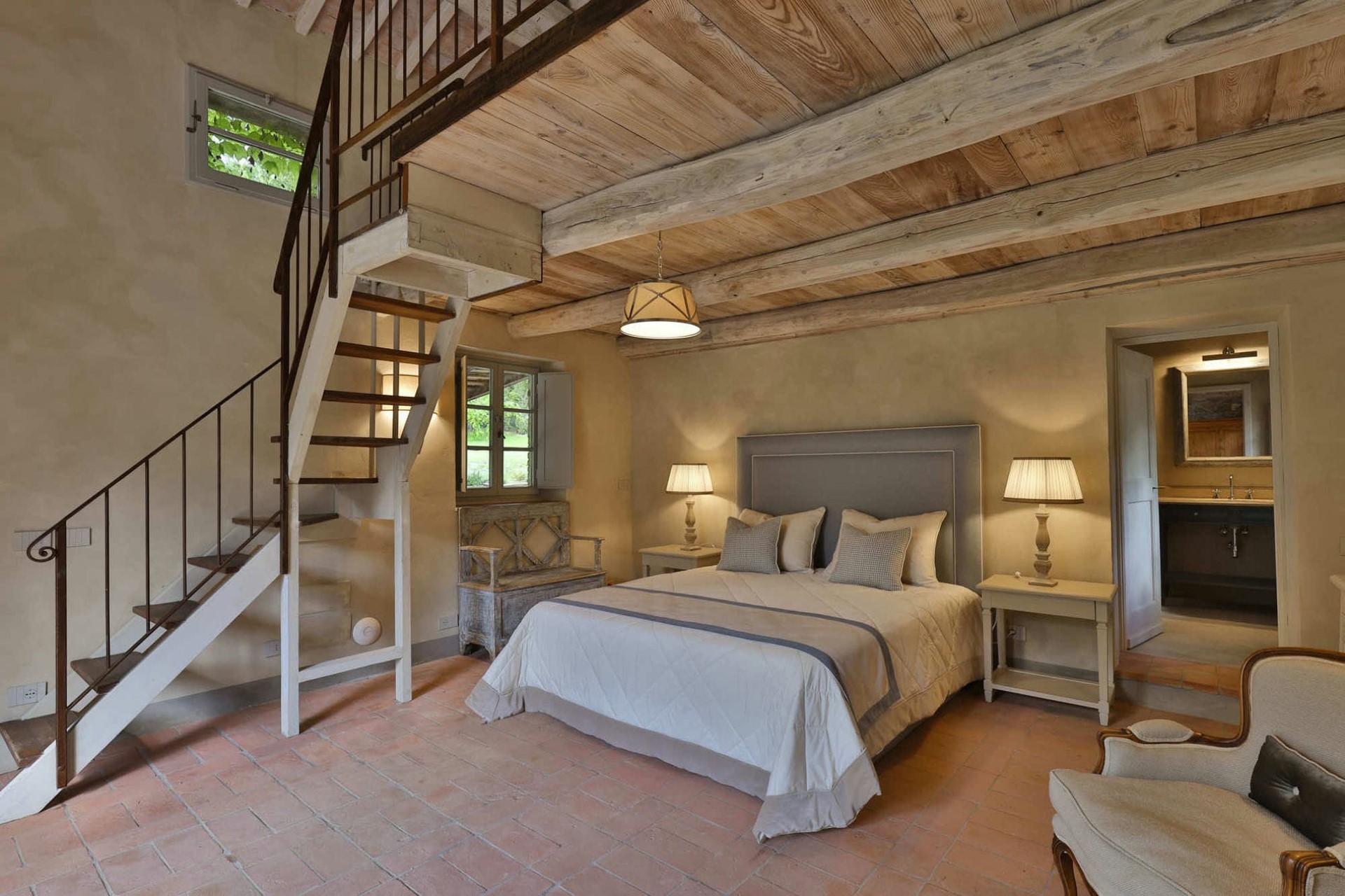 Il Rosmarino – king-size bed + mezzanine with twin beds, en-suite bathroom with shower, and private patios with garden views