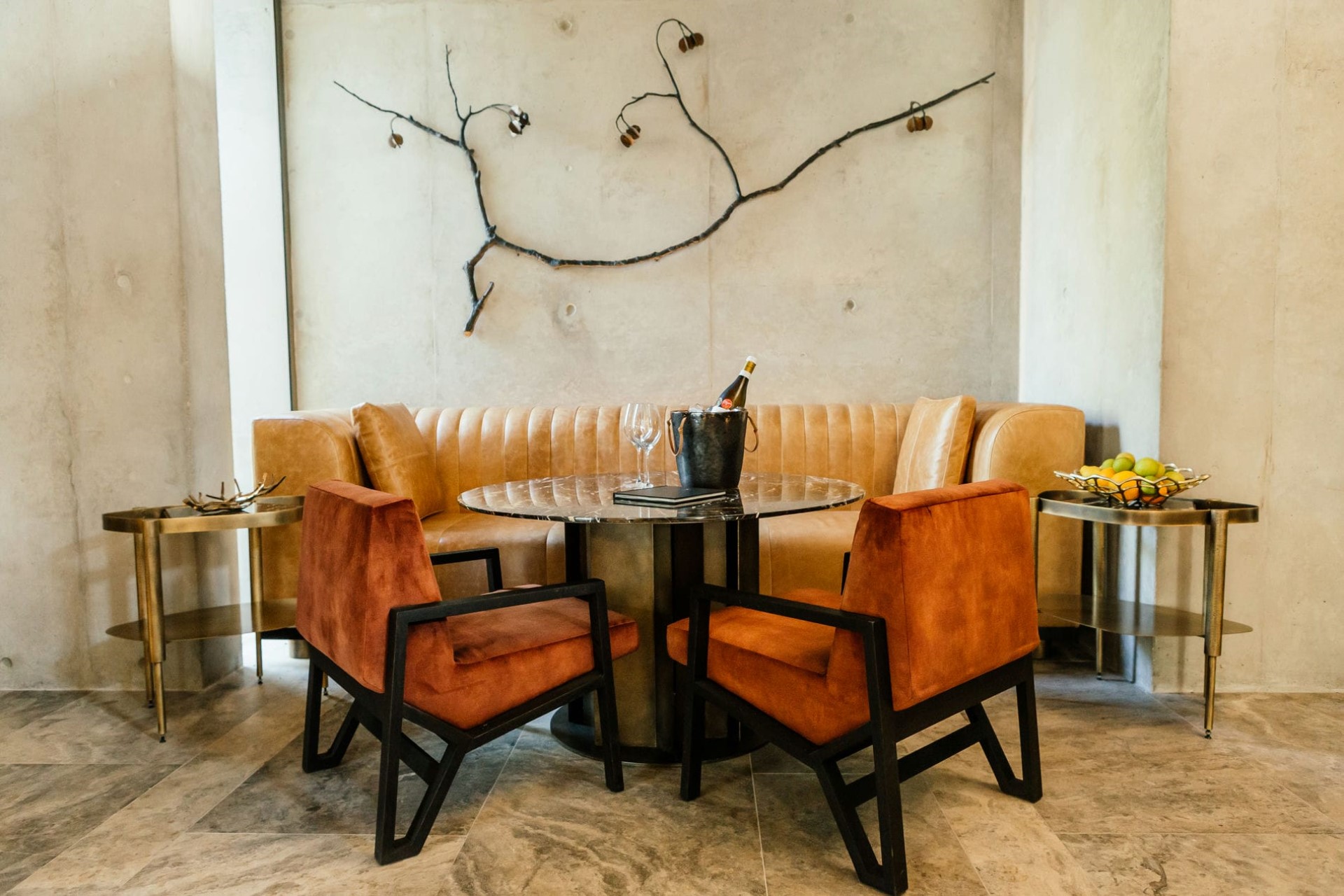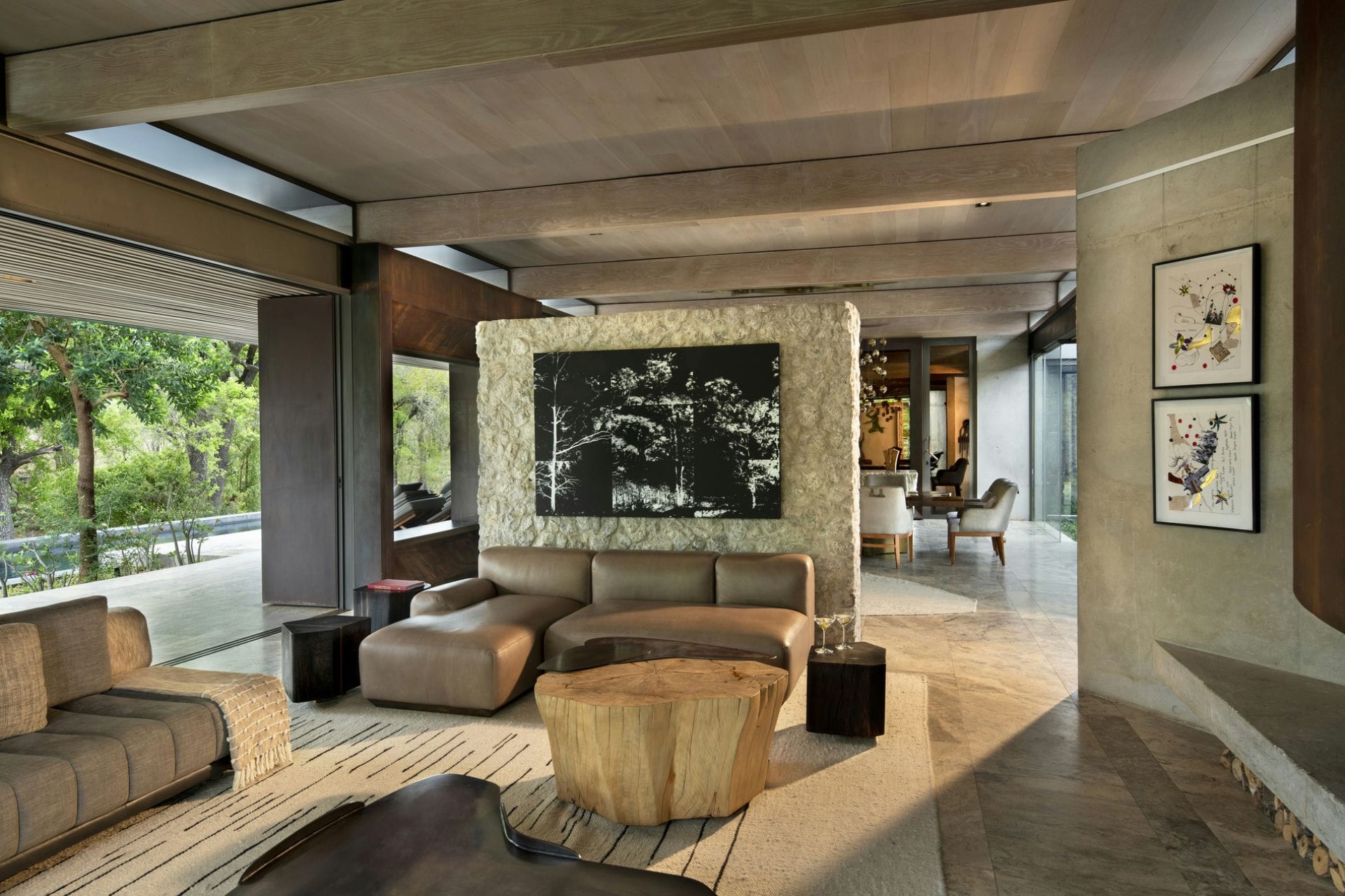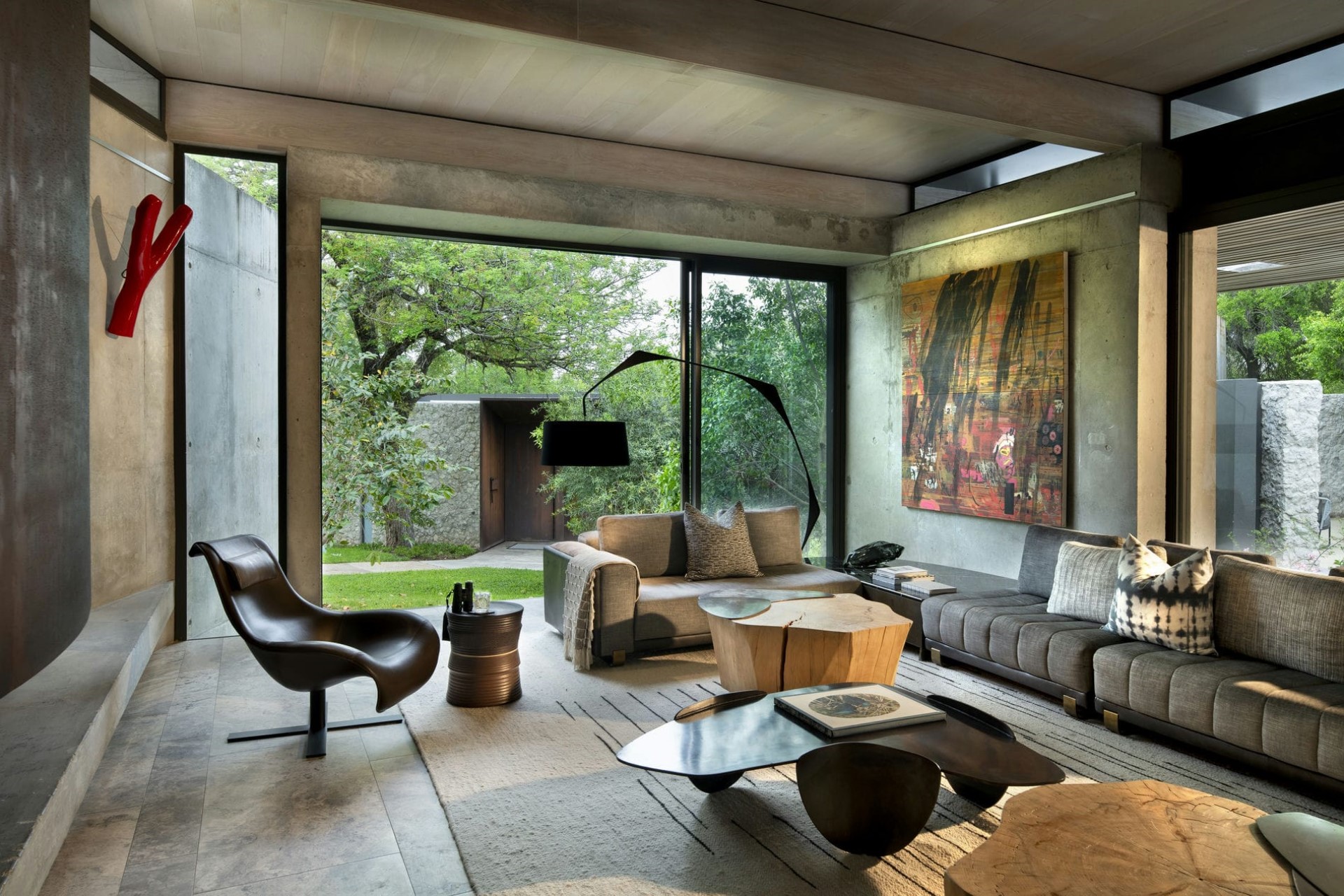 Floor-to-ceiling windows seamlessly blur the lines between the exterior and interior living spaces. Custom furniture and soft furnishings in earthy tones create a connection with nature, while designer lighting and cosy fireplaces add warmth and ambiance. A curated collection of modern South African art and exquisite bronze sculptures adorn the interiors.