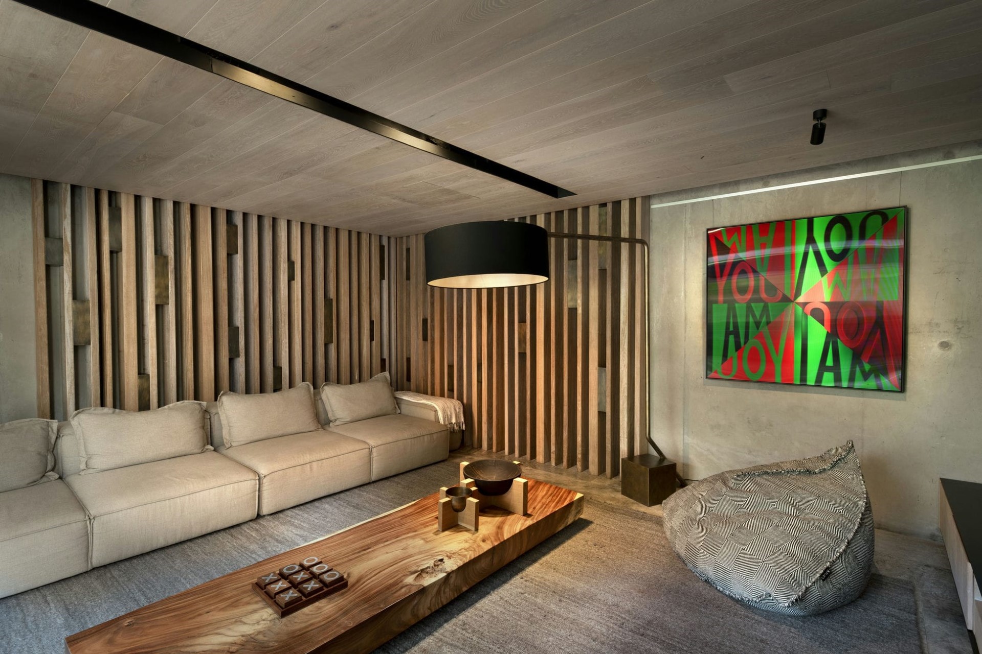 A second cosy lounge with plush seating and a large flat-screen TV provides the perfect setting for movie nights. Adjoining the living spaces are a well-stocked wine gallery, a bar, and a fully-equipped chef’s kitchen.