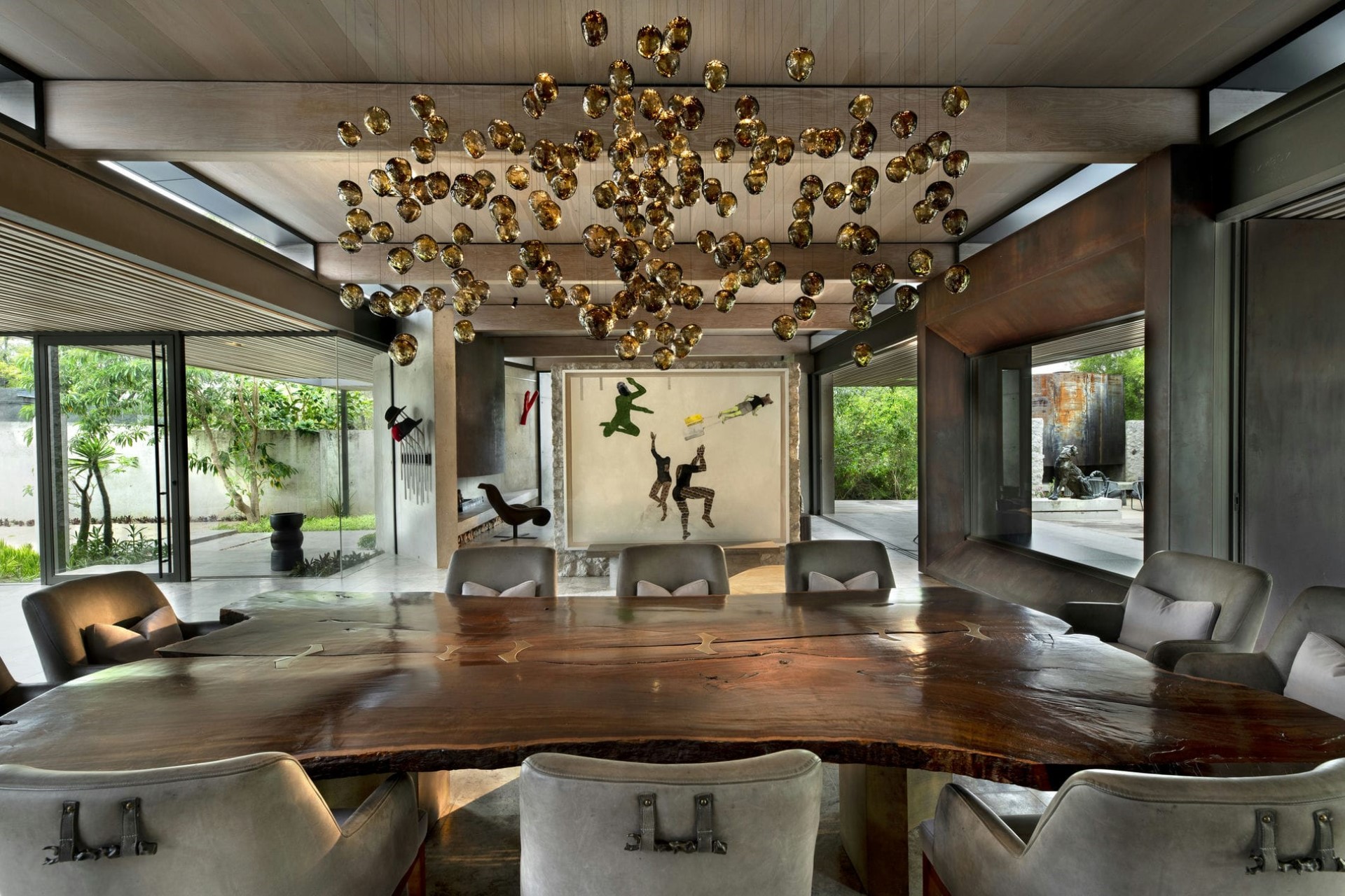 The open-plan living area invites relaxation. Guests can curl up by the fireplace in the spacious lounge, or gather around the grand carved wooden dining table illuminated by a statement lighting piece.