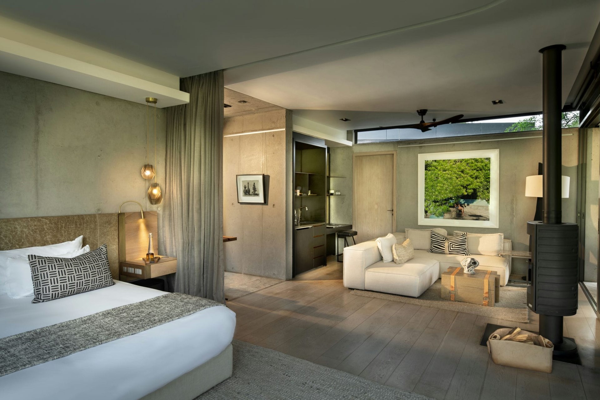 Bedroom 3 – king-size bed (converted to twins on request), lounge area with fireplace, minibar & coffee station, dressing room, en-suite bathroom with double vanity, bathtub & separate double shower, private deck with day bed, and bush views