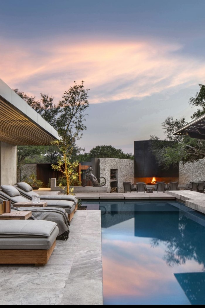 Award-winning architecture and natural materials seamlessly blend modern design with the surrounding landscape, whilst indigenous gardens envelop the property. The expansive terrace boasts a stunning infinity pool lined with inviting daybeds and sun loungers, while a shaded outdoor lounge offers a cool respite and the perfect place to soak up the views after an exhilarating safari.