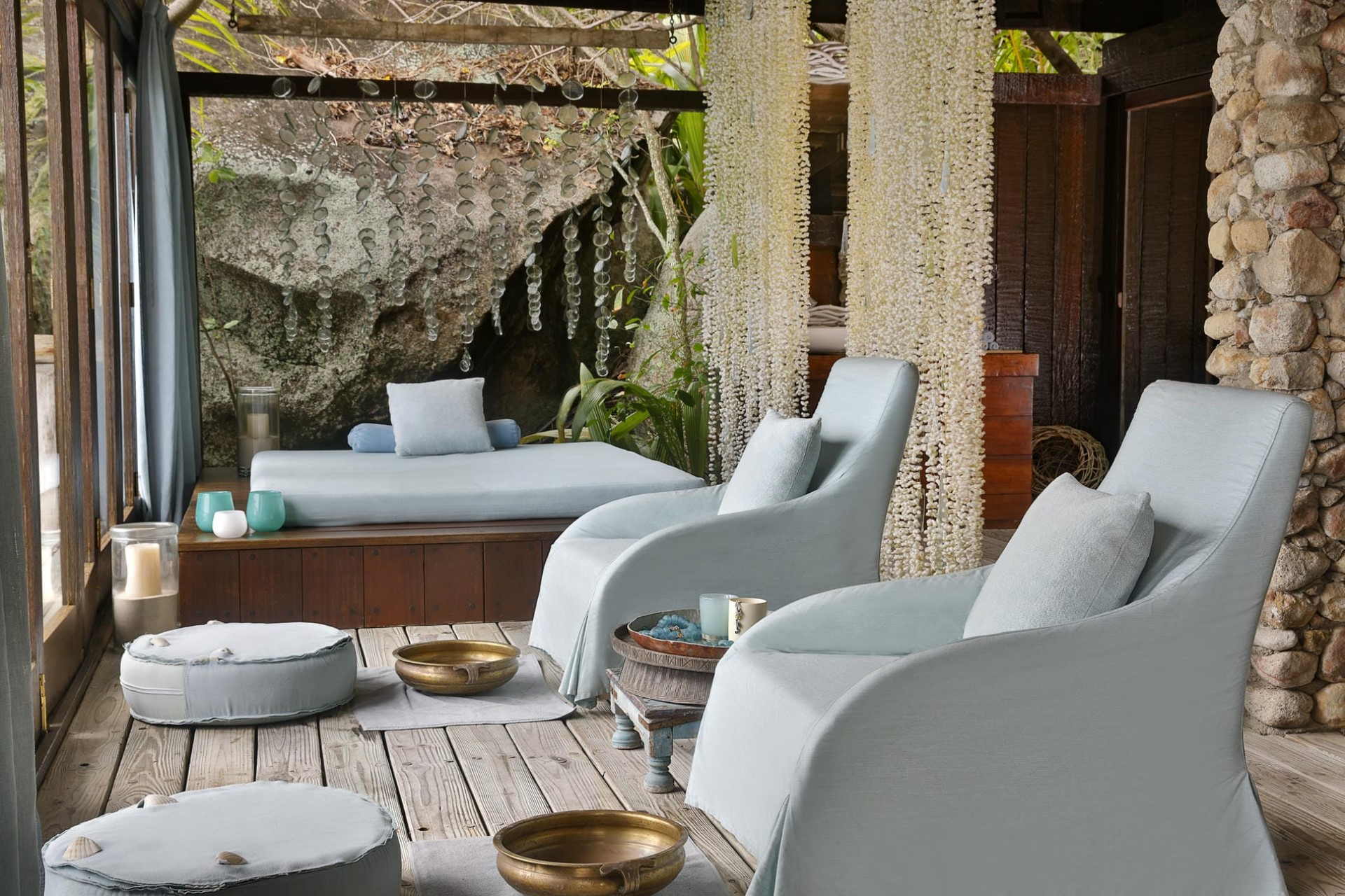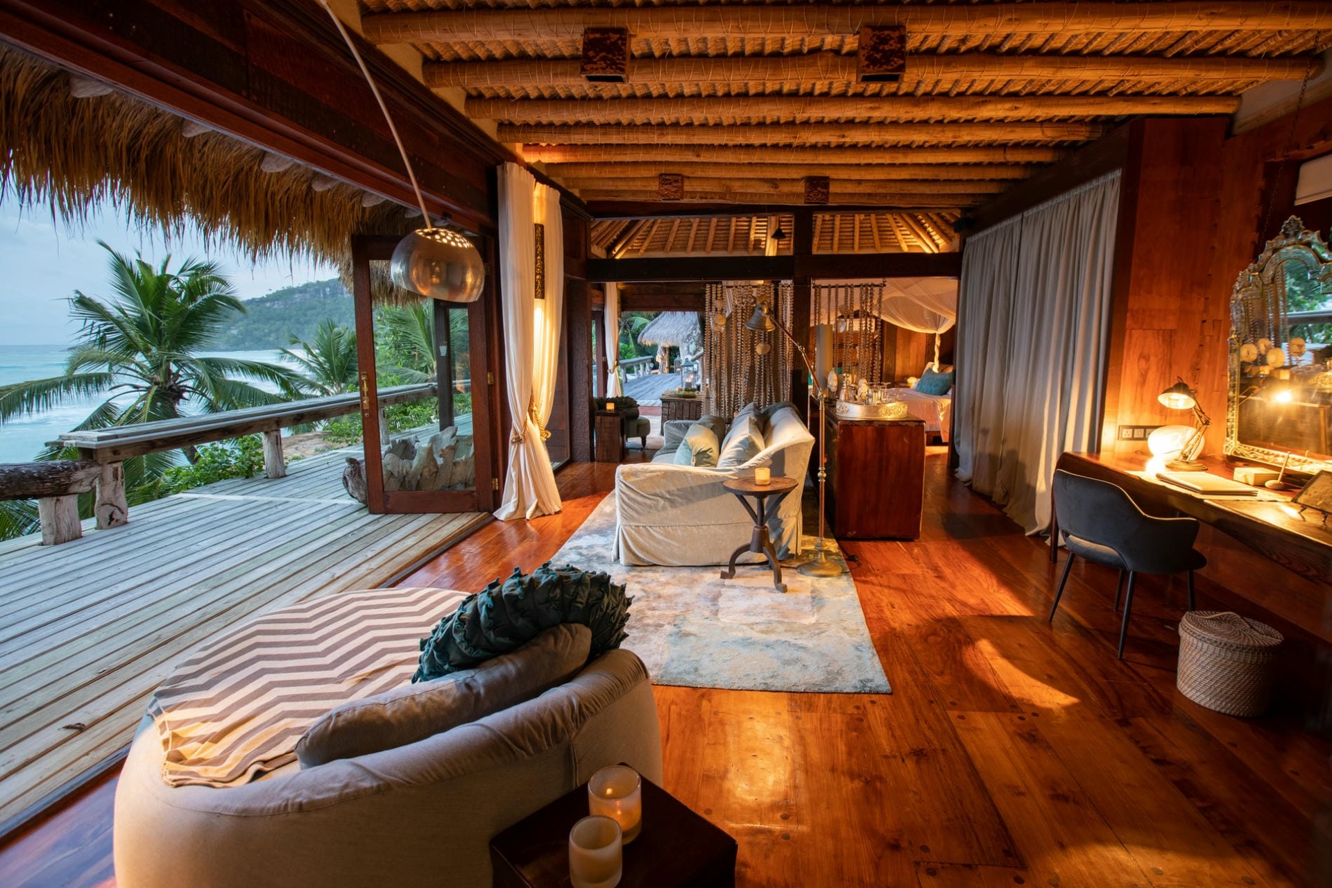 The island’s flagship villa is the spectacular North Island Villa. Hidden away on a granite cliff on the northern side of Anse d’Est, it enjoys an elevated position with panoramic views. Measuring 750 square metres, it comprises a huge en-suite bedroom, a spacious lounge with an adjoining kitchenette, and a study.