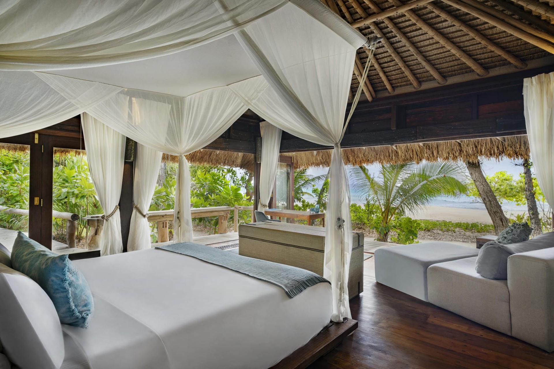 Villa 11 – master bedroom with king-size bed, dressing room, and en-suite bathroom with bathtub & separate shower + outdoor shower, study (converted to guest room with en-suite shower room on request), lounge room with minibar, kitchenette, private terrace with plunge pool, ocean views & direct beach access