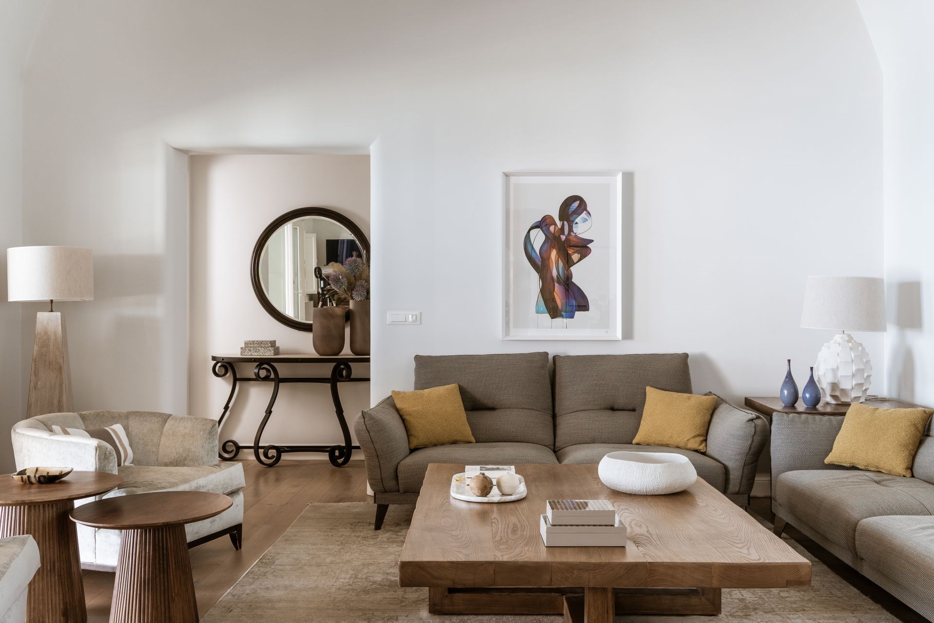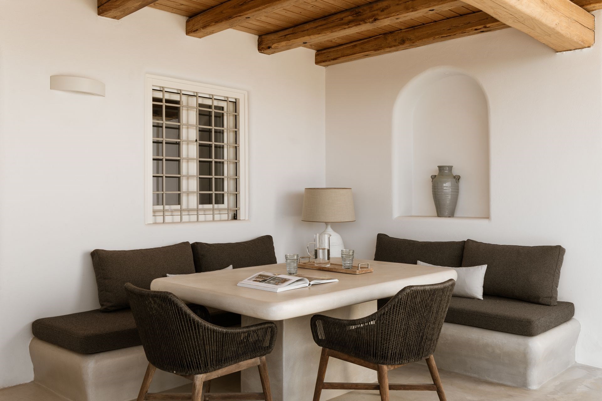 Indoors, white walls and wooden floors create a spacious yet homely feel, whilst large windows allow cool breezes to flow through the living spaces. Luxurious furnishings in earthy colours add to the homely feel and provide an elevated level of comfort.