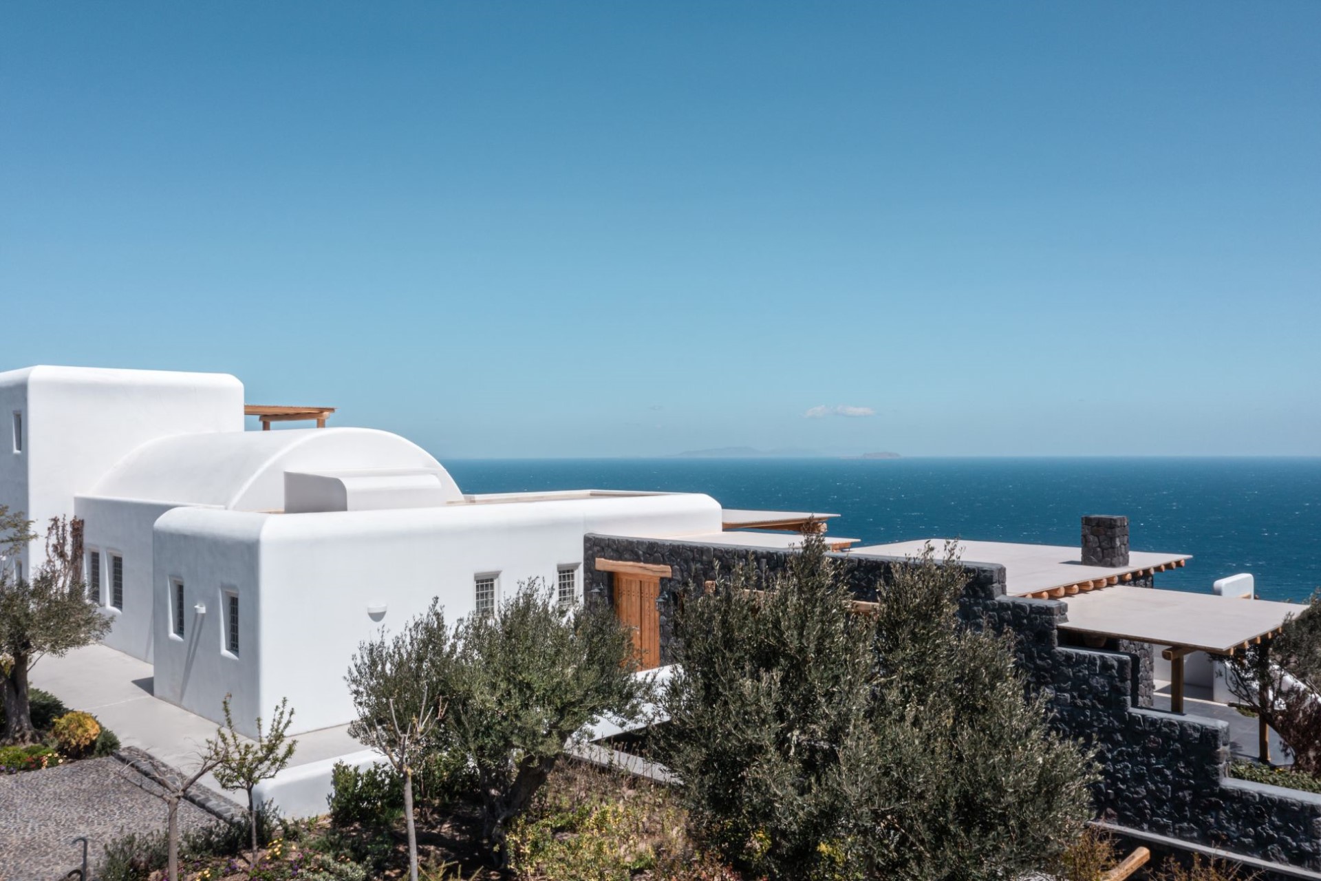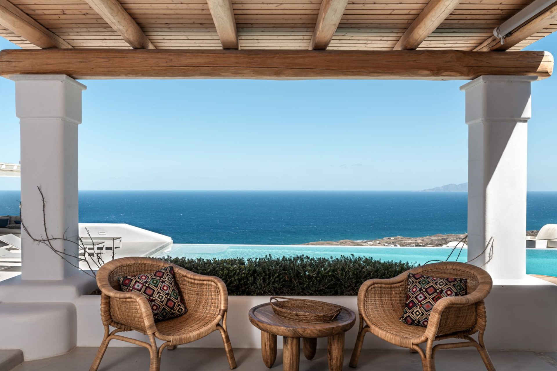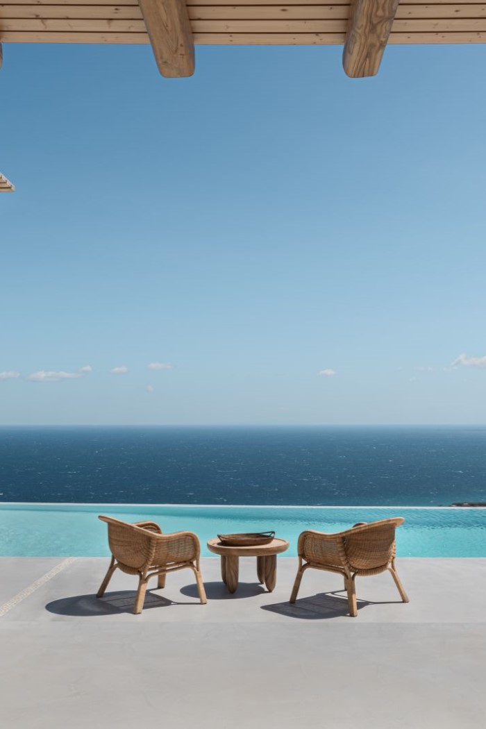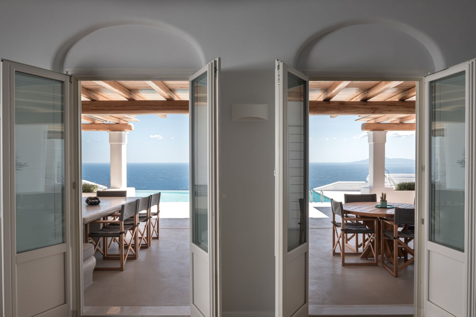 Large, wooden doors lead to the main terrace and pool area, surrounded by beautifully-landscaped gardens. The terraces offer stunning vistas over the Aegean Sea, offering unique sunrise views.