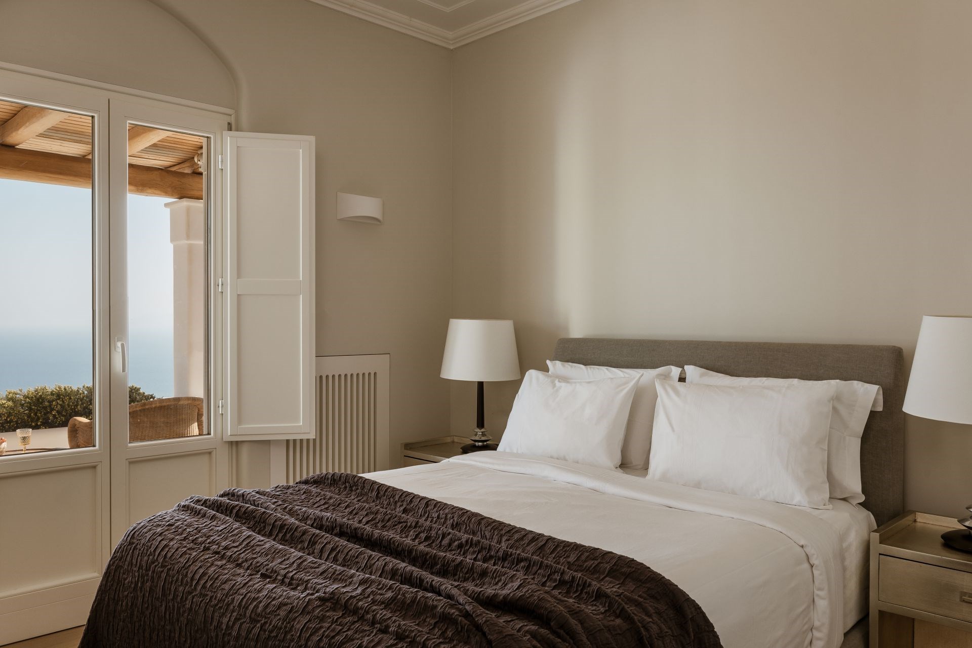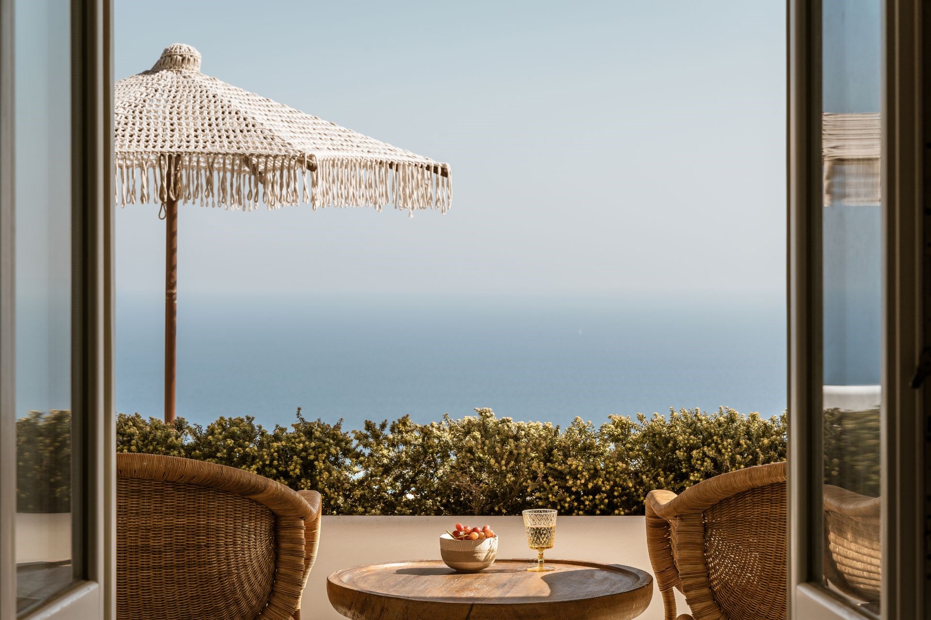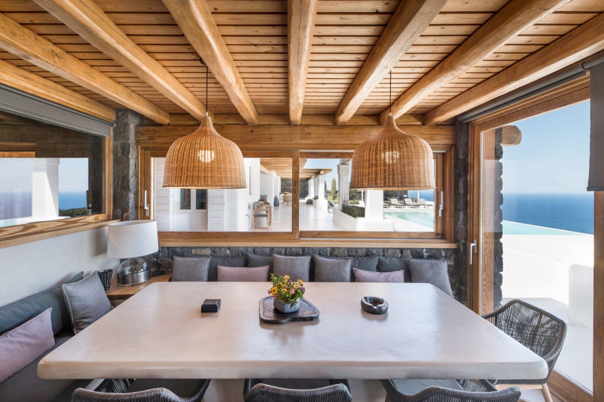 Large, wooden doors lead to the main terrace and pool area, surrounded by beautifully-landscaped gardens. The terraces offer stunning vistas over the Aegean Sea, offering unique sunrise views.