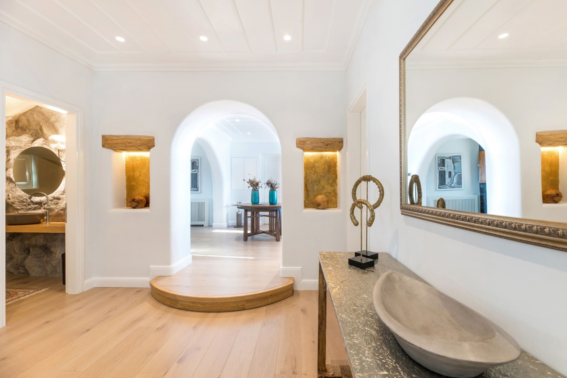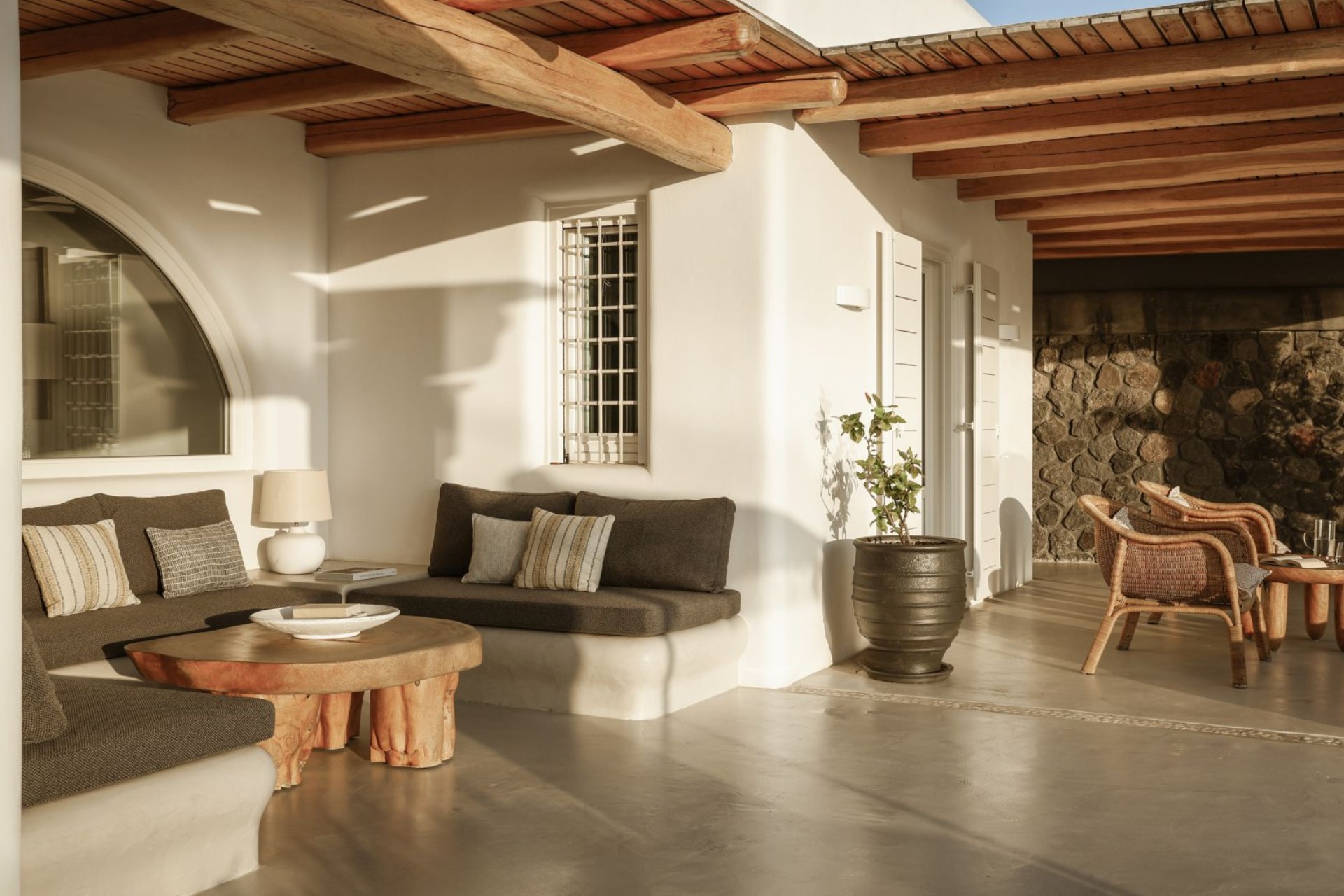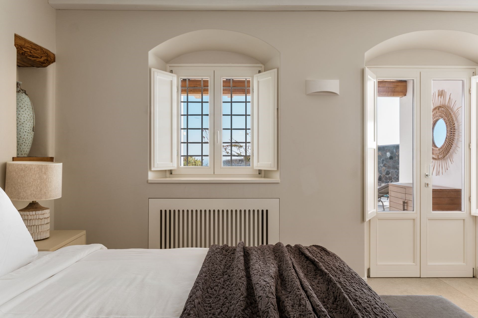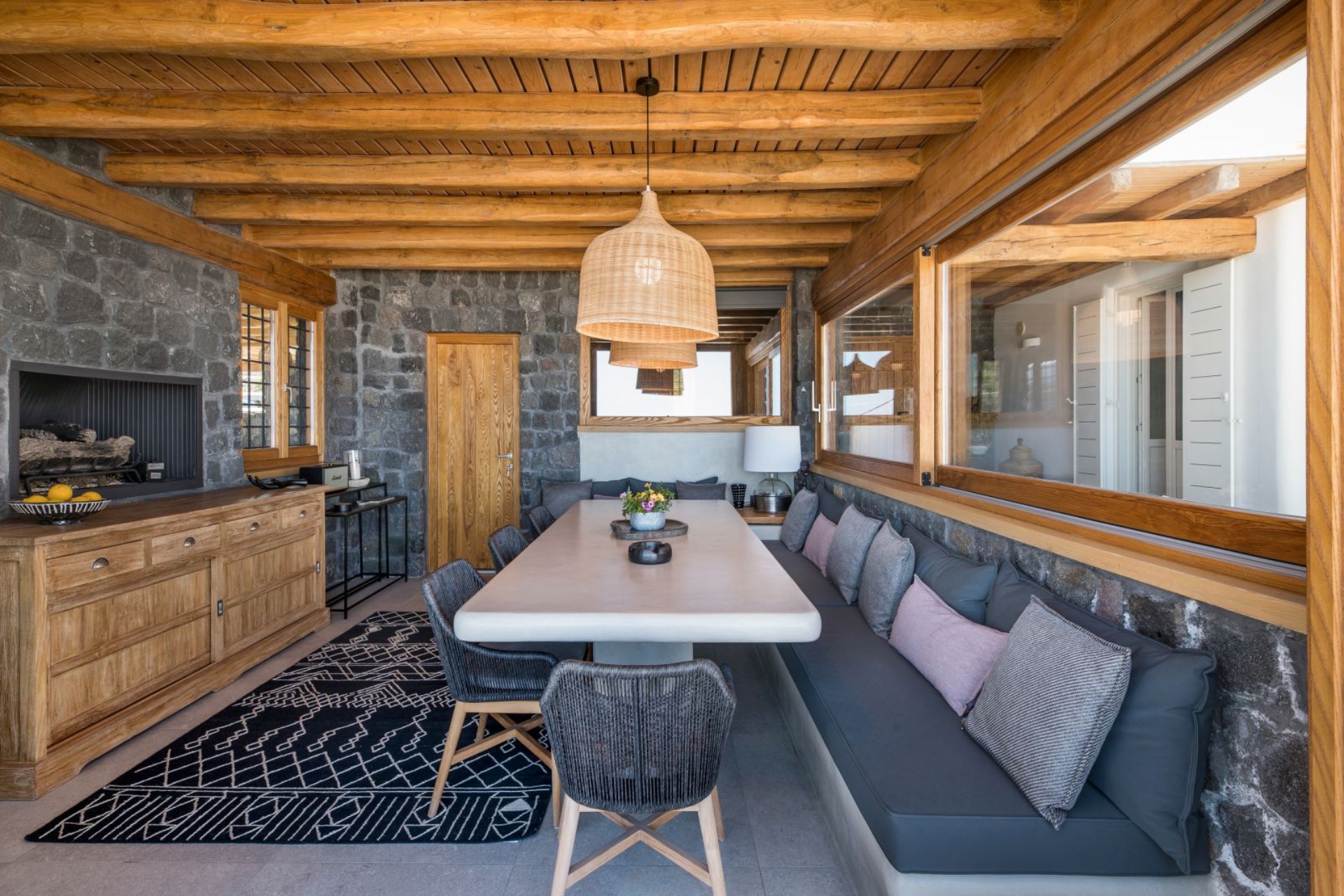 Large, wooden doors lead to the main terrace and pool area, surrounded by beautifully-landscaped gardens. The terraces offer stunning vistas over the Aegean Sea, offering unique sunrise views.