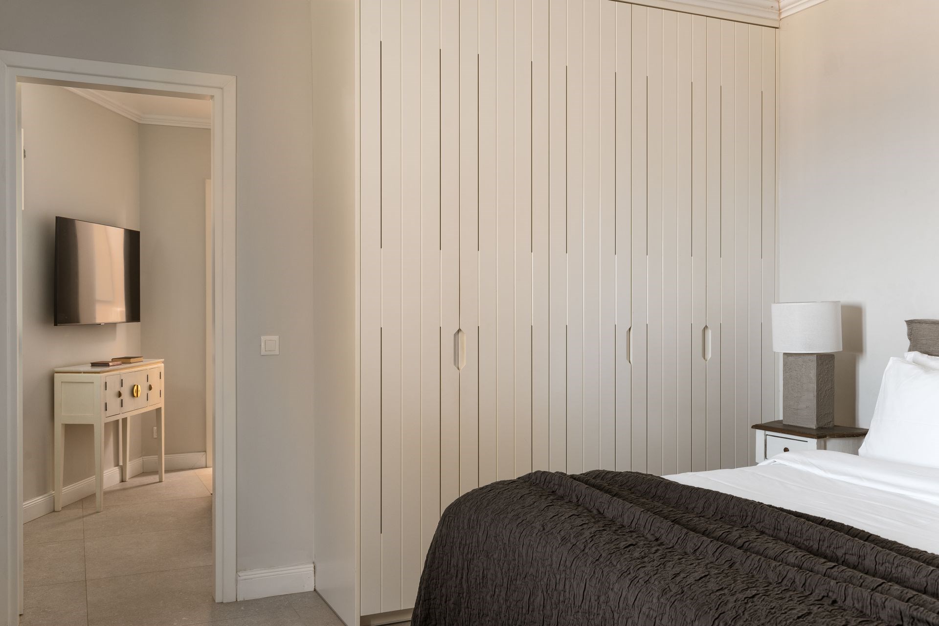 Bedroom 2 (Master) – king-size bed, walk-in wardrobe, en-suite bathroom with shower, and terrace access