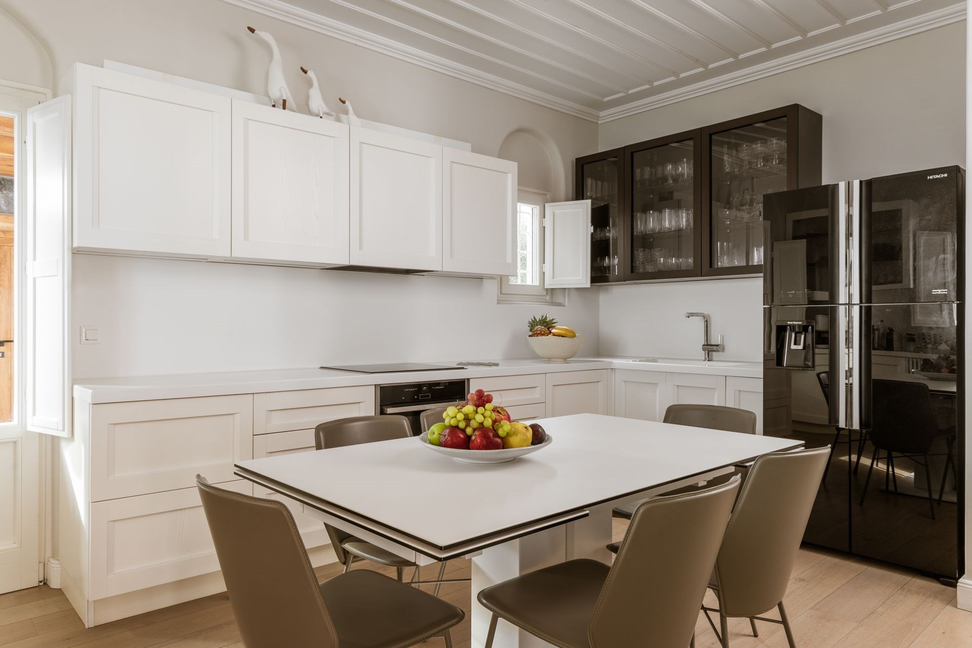 On the main floor, guests can relax in the spacious lounge area, cook up delicious feasts in either of the two fully-equipped kitchens, and enjoy sociable meals at the elegant dining table. One kitchen also features a smaller breakfast table, perfect for more relaxed meals.