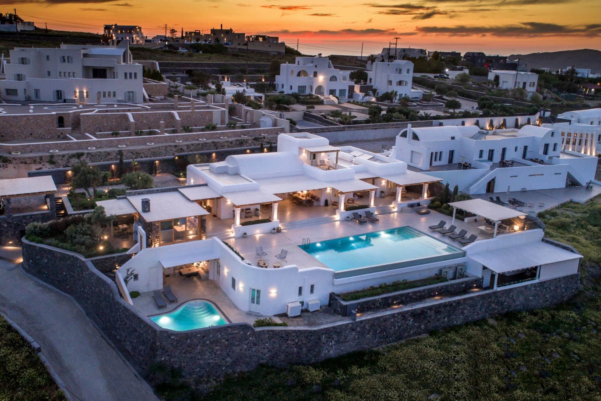 O’Santo Villa is located in the village of Imerovigli on the north side of the island of Santorini. The village lies at the highest point of the caldera cliffs, offering panoramic views of the spectacular sunsets the island is famous for.