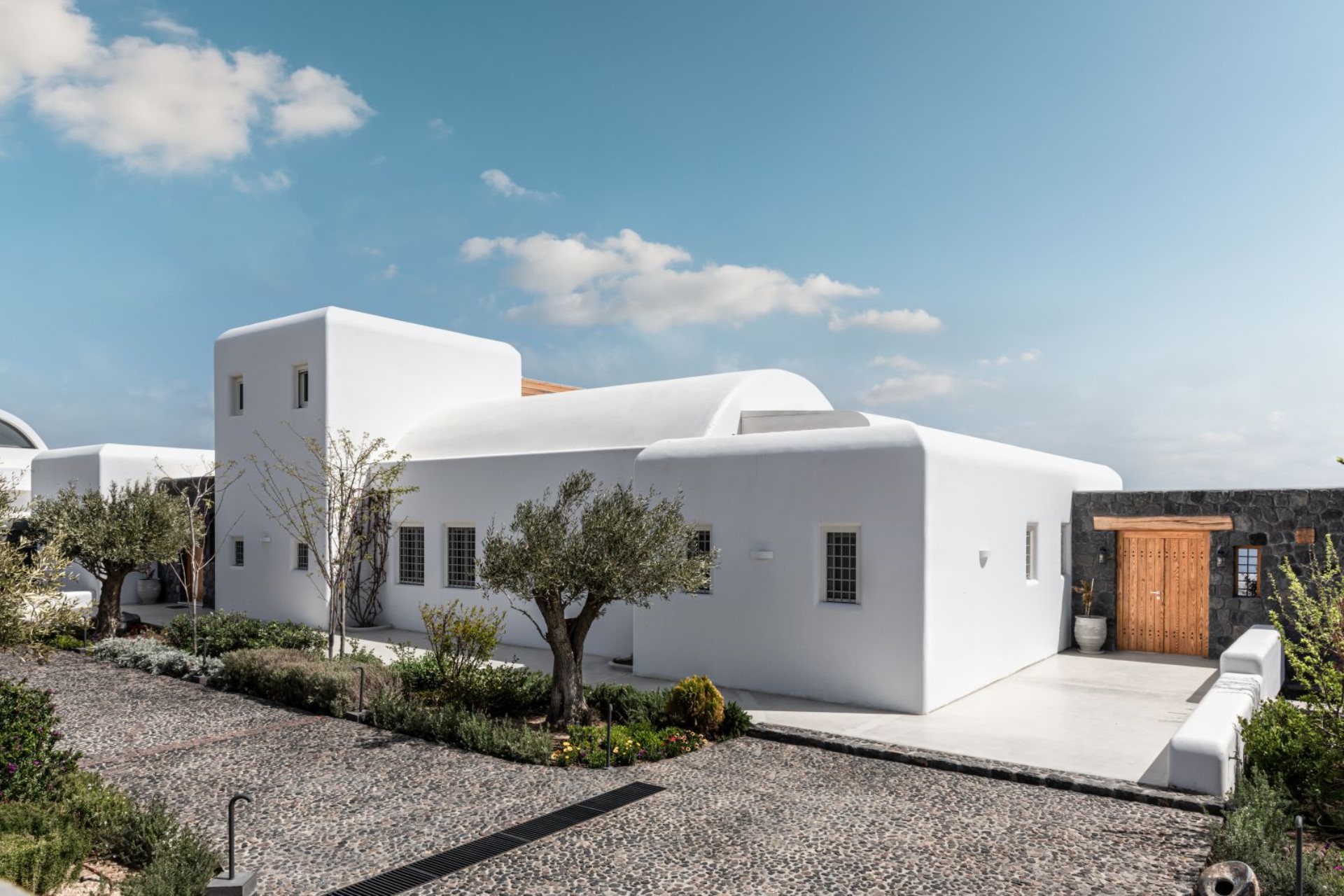Cobbled pathways lined with olive trees lead to a traditional whitewashed building, fitting perfectly within the rustic, Cycladic landscape.