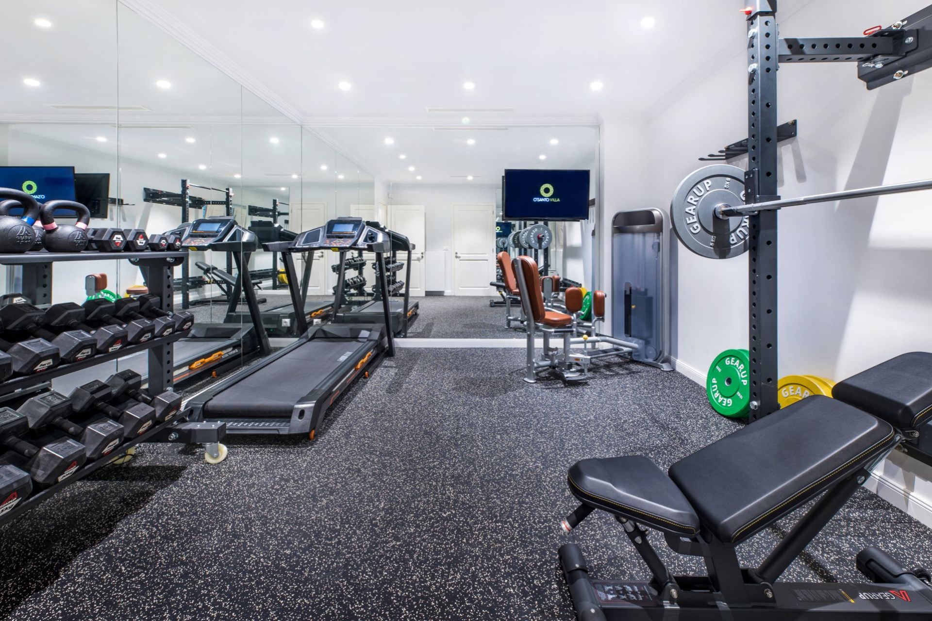 On the lower level is a second sitting room with direct access to the lower terrace, as well as a fully-equipped gym for those maintaining their workout schedule.