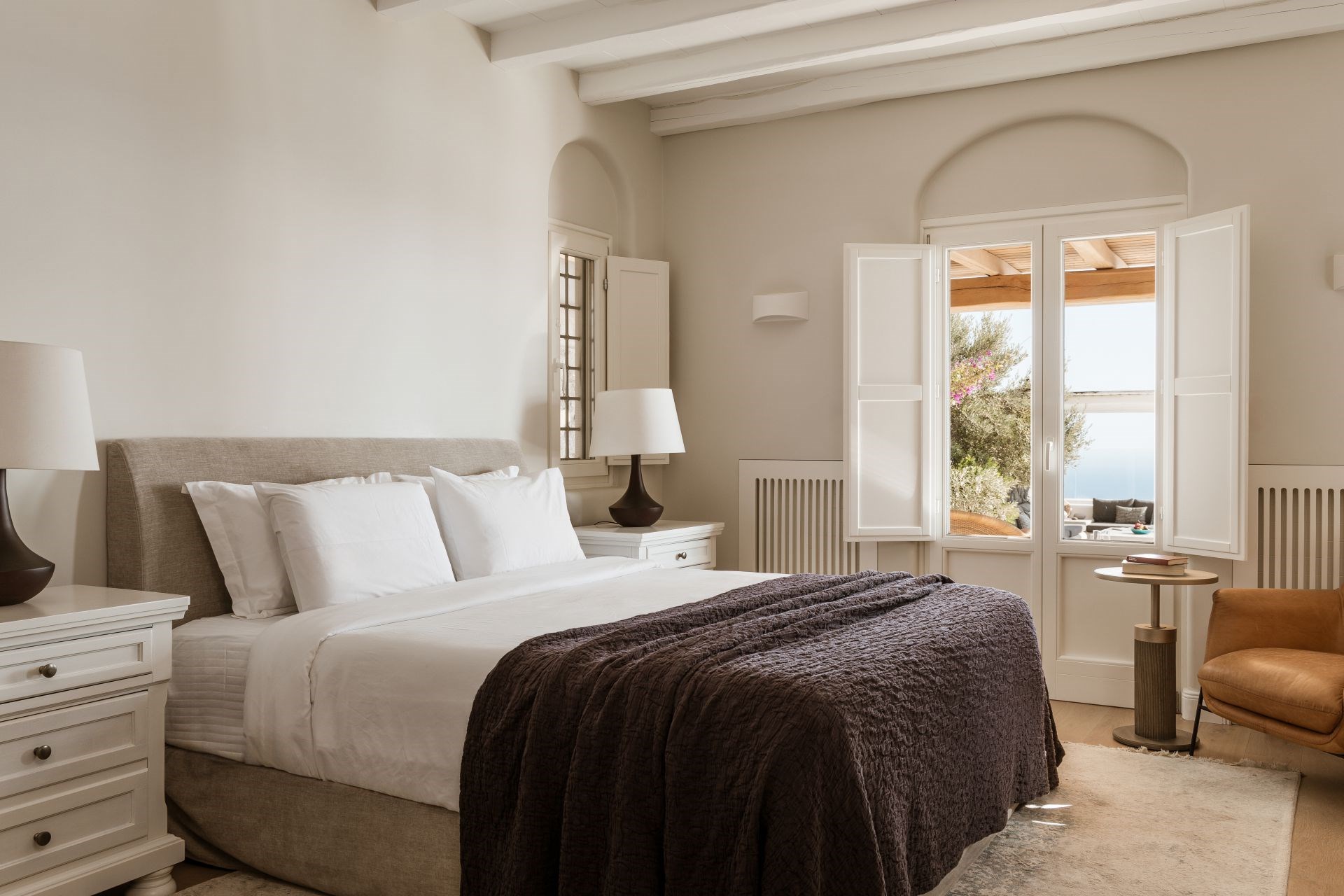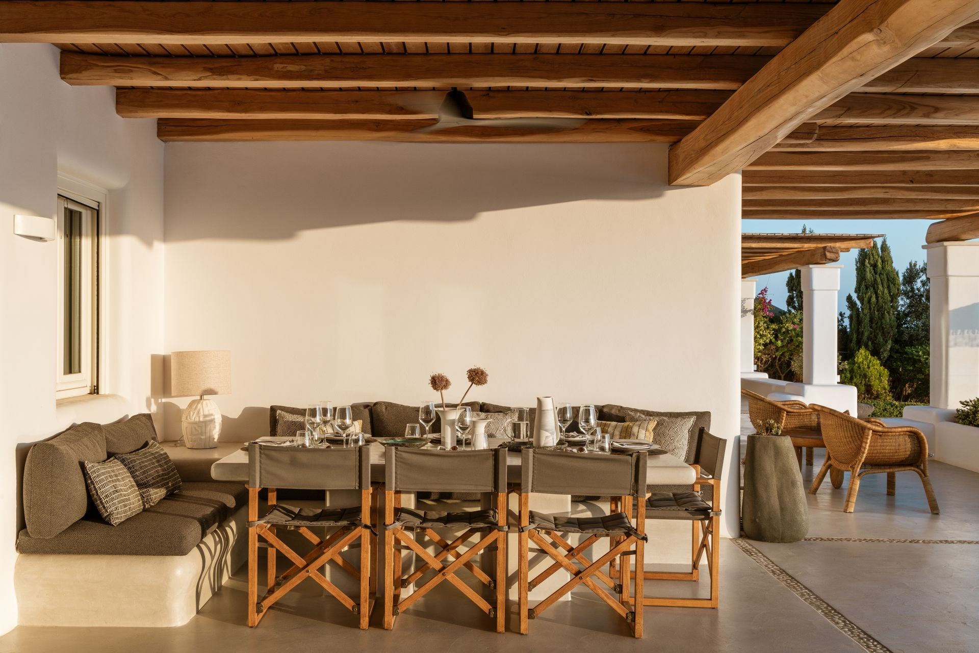 Large, wooden doors lead to the main terrace and pool area, surrounded by beautifully-landscaped gardens. The terraces offer stunning vistas over the Aegean Sea, offering unique sunrise views.