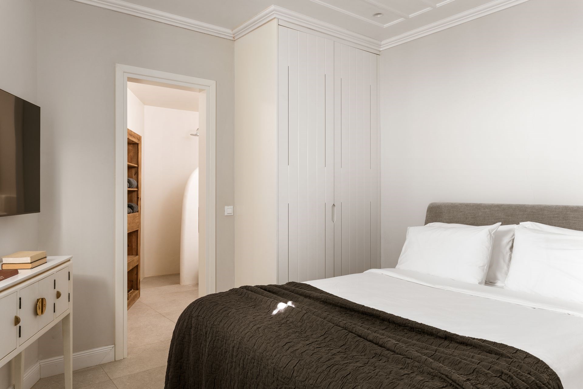 Bedroom 3 – queen-size bed, en-suite bathroom with shower, and terrace access