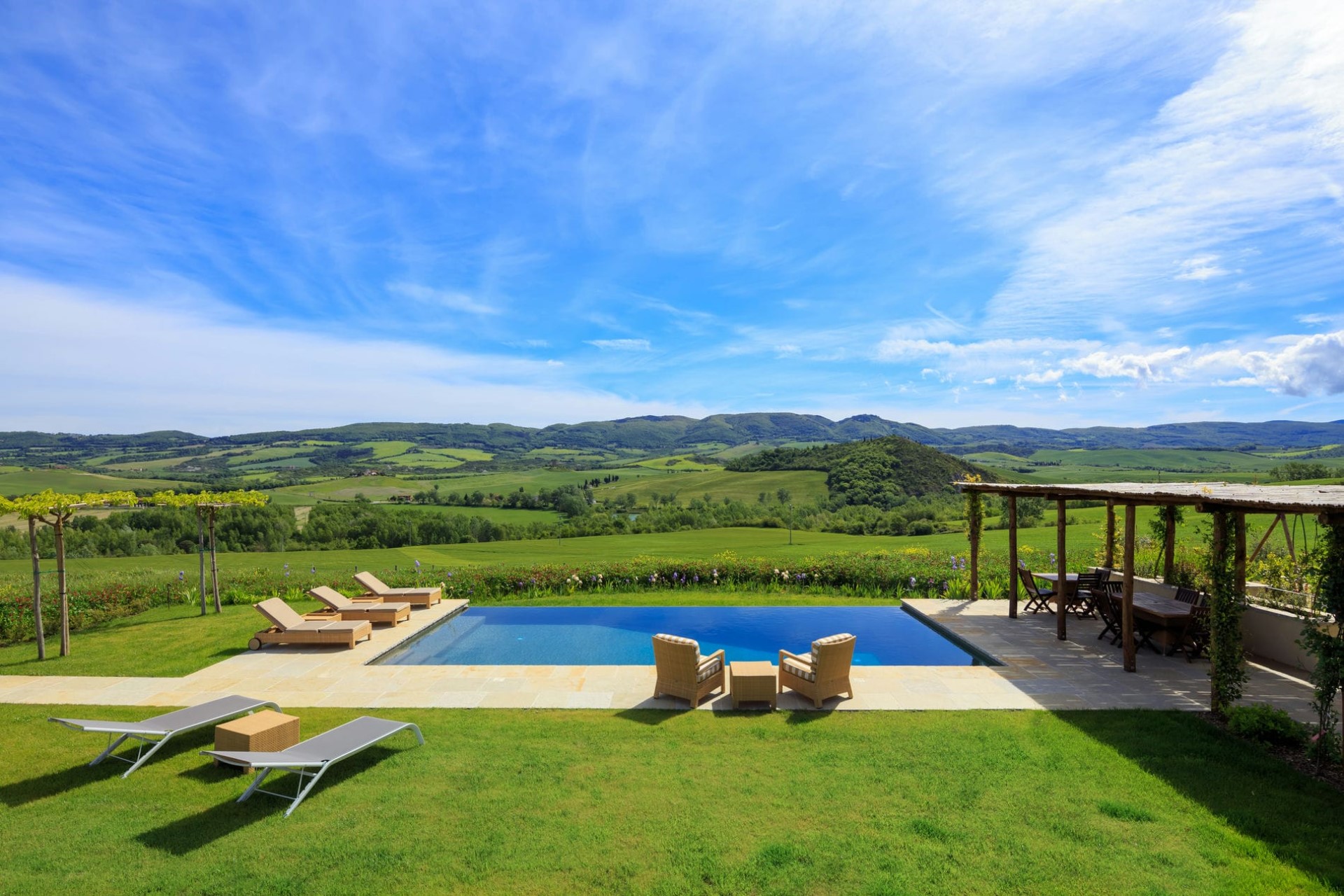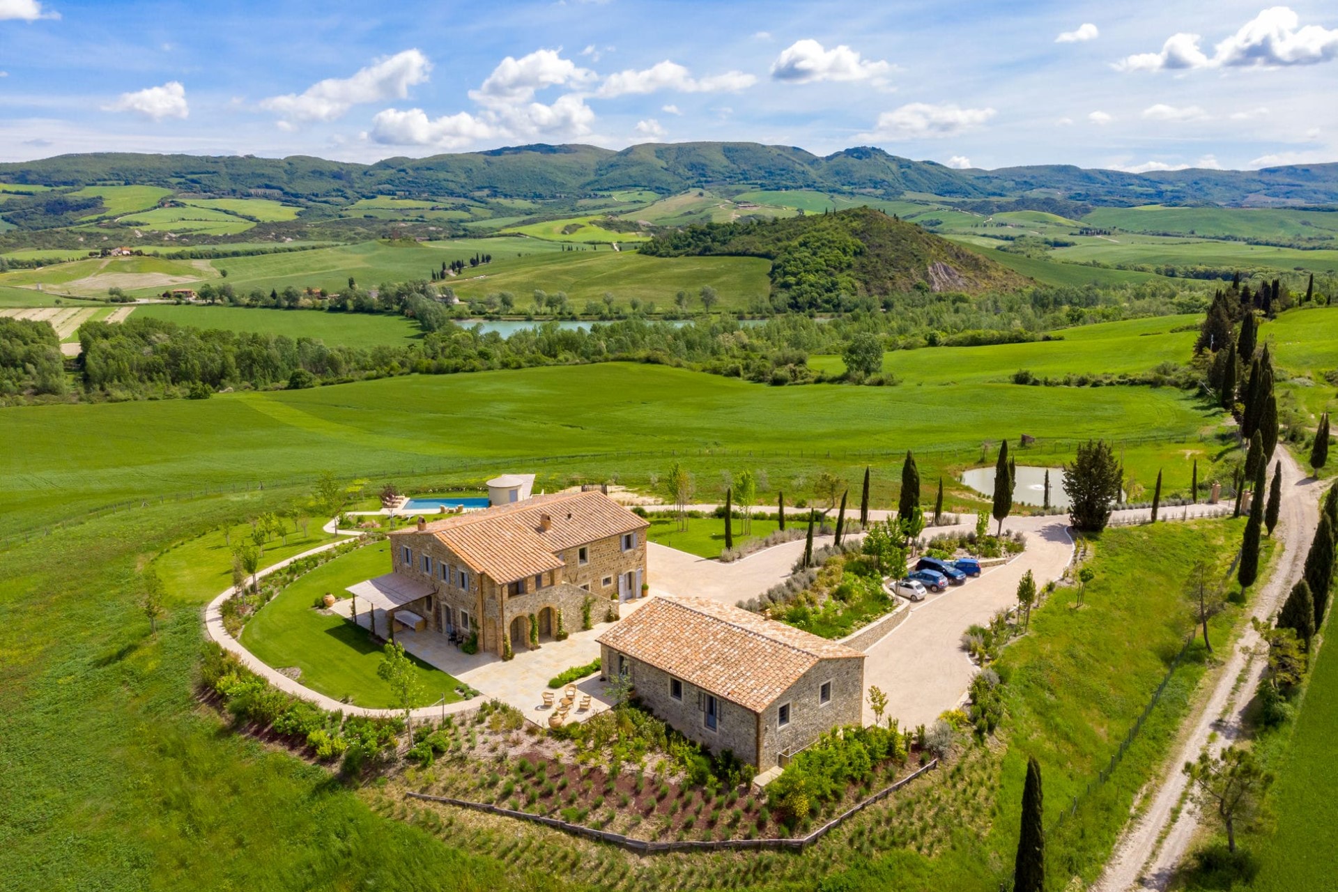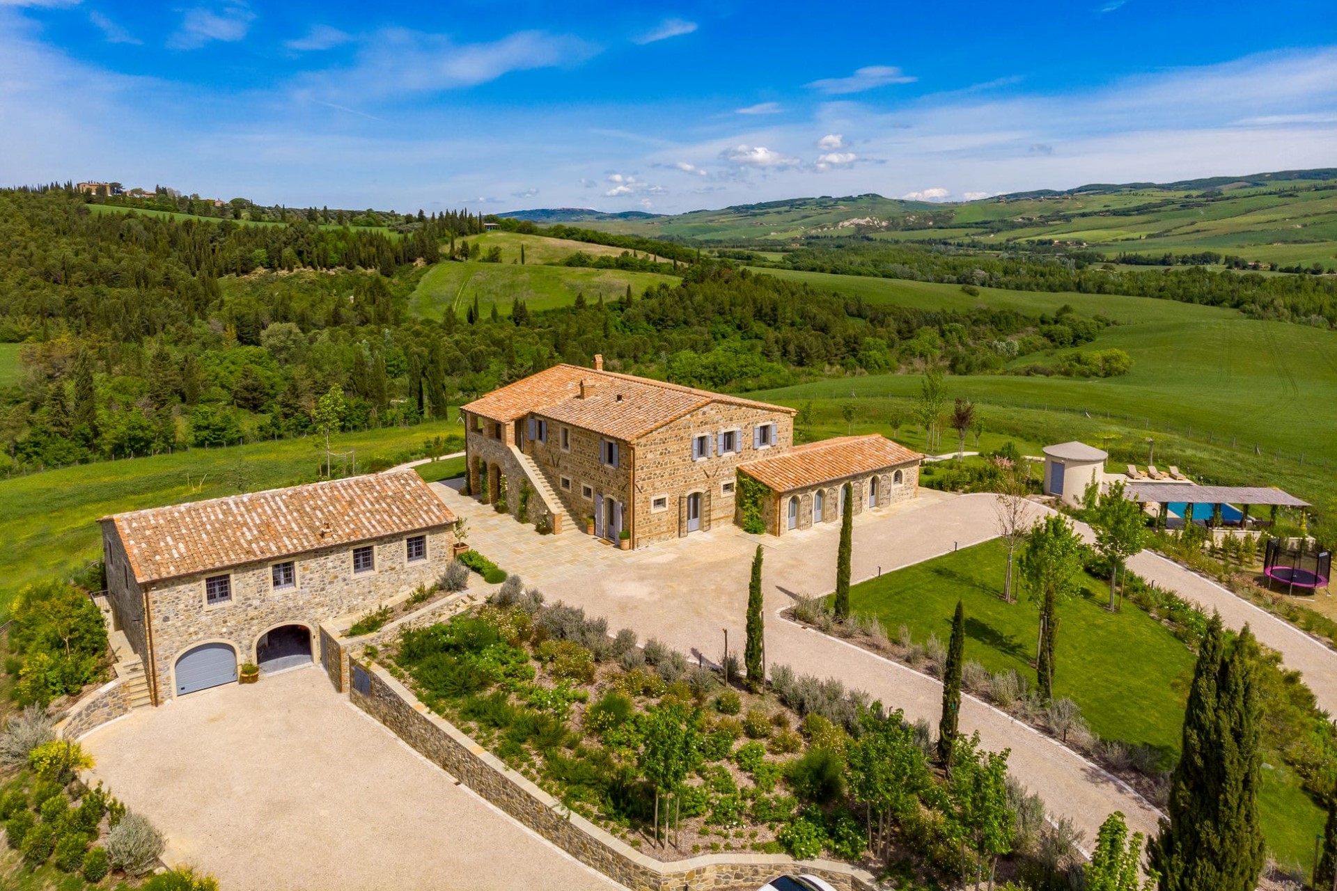 A sprawling luxury villa estate with panoramic views over the lush Tuscan hills