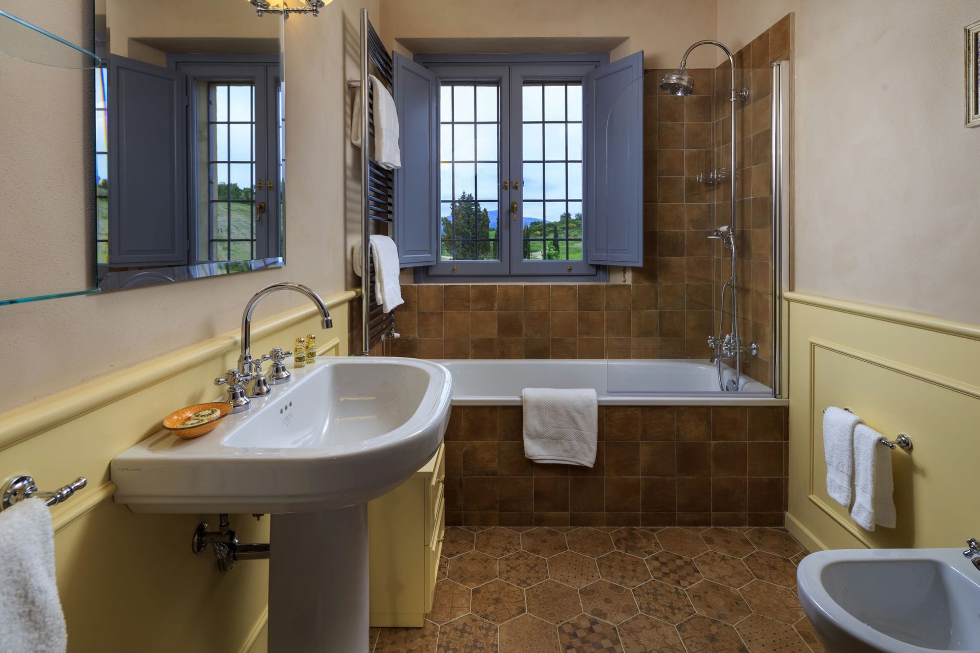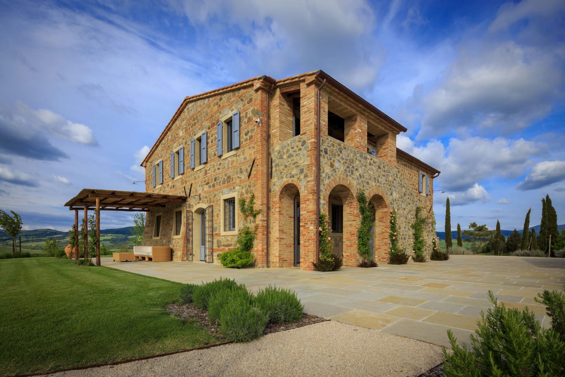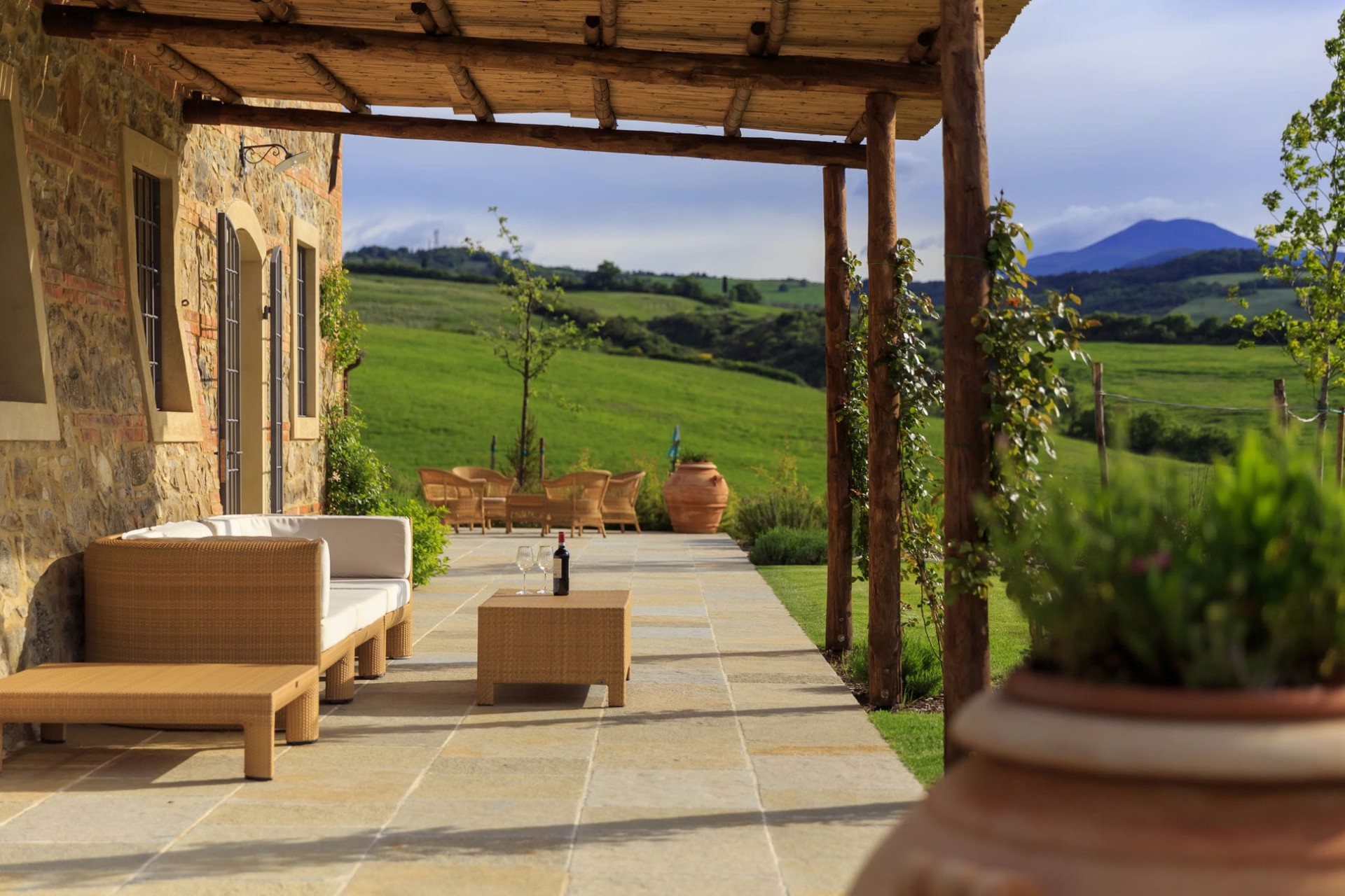 A sprawling luxury villa estate with panoramic views over the lush Tuscan hills