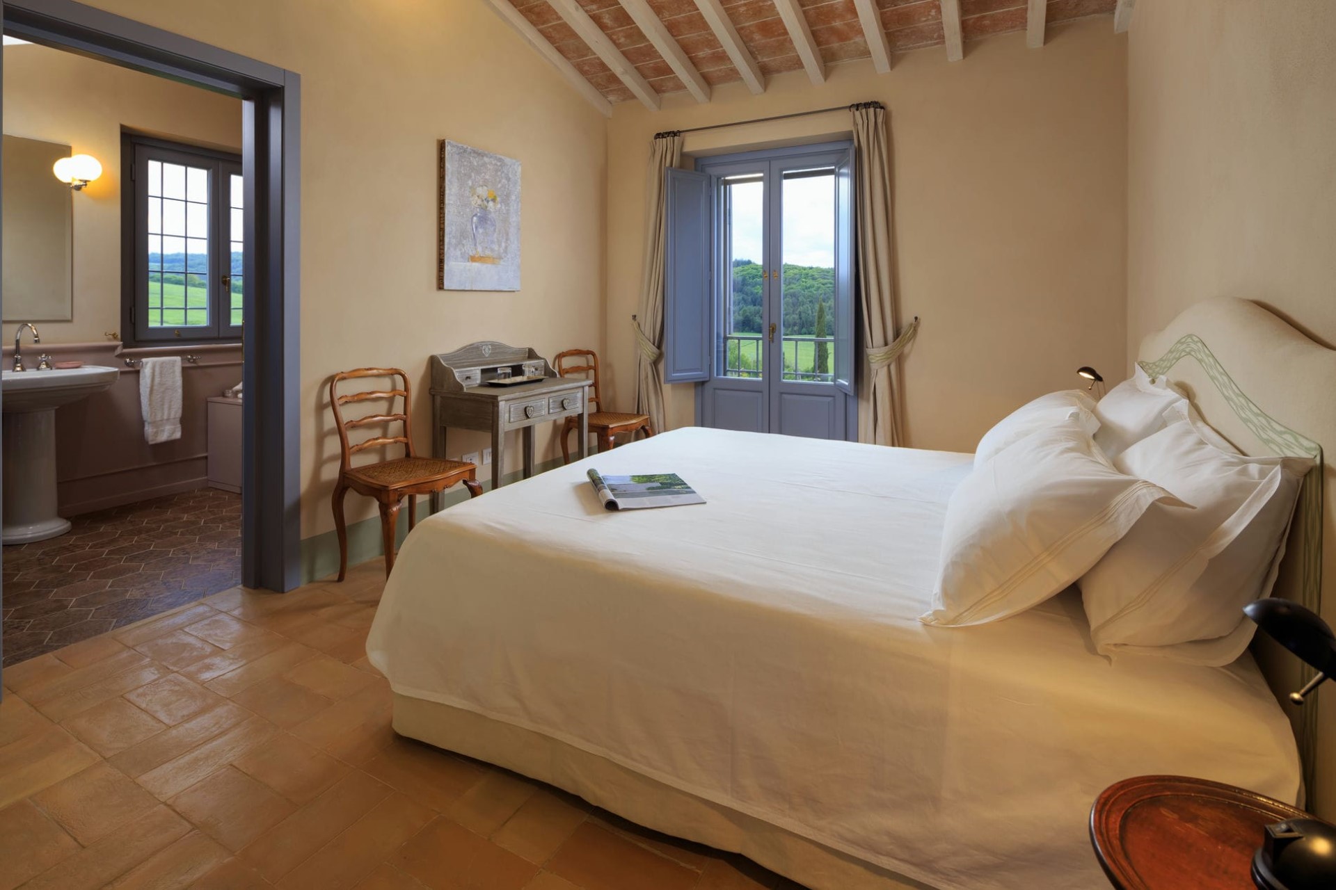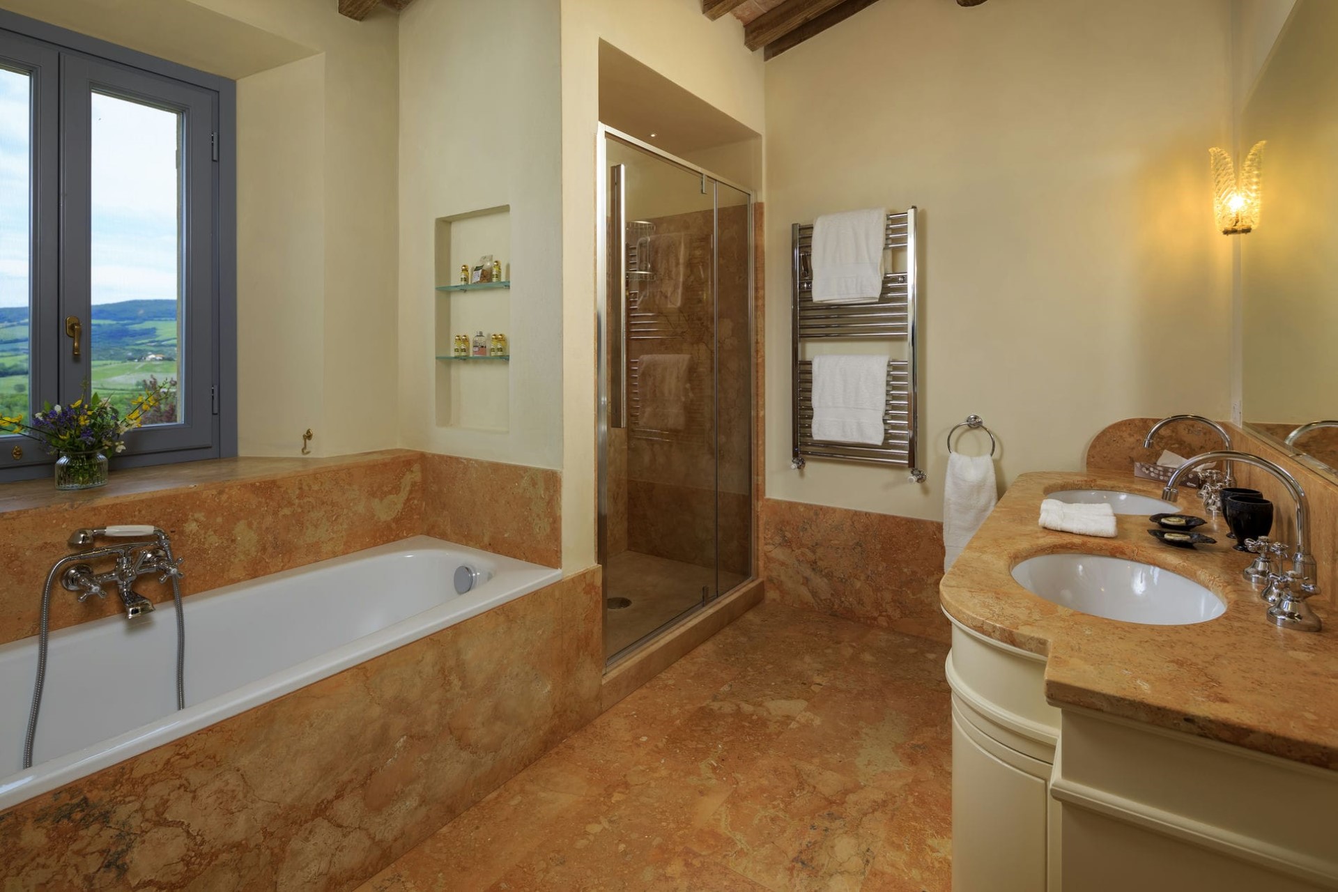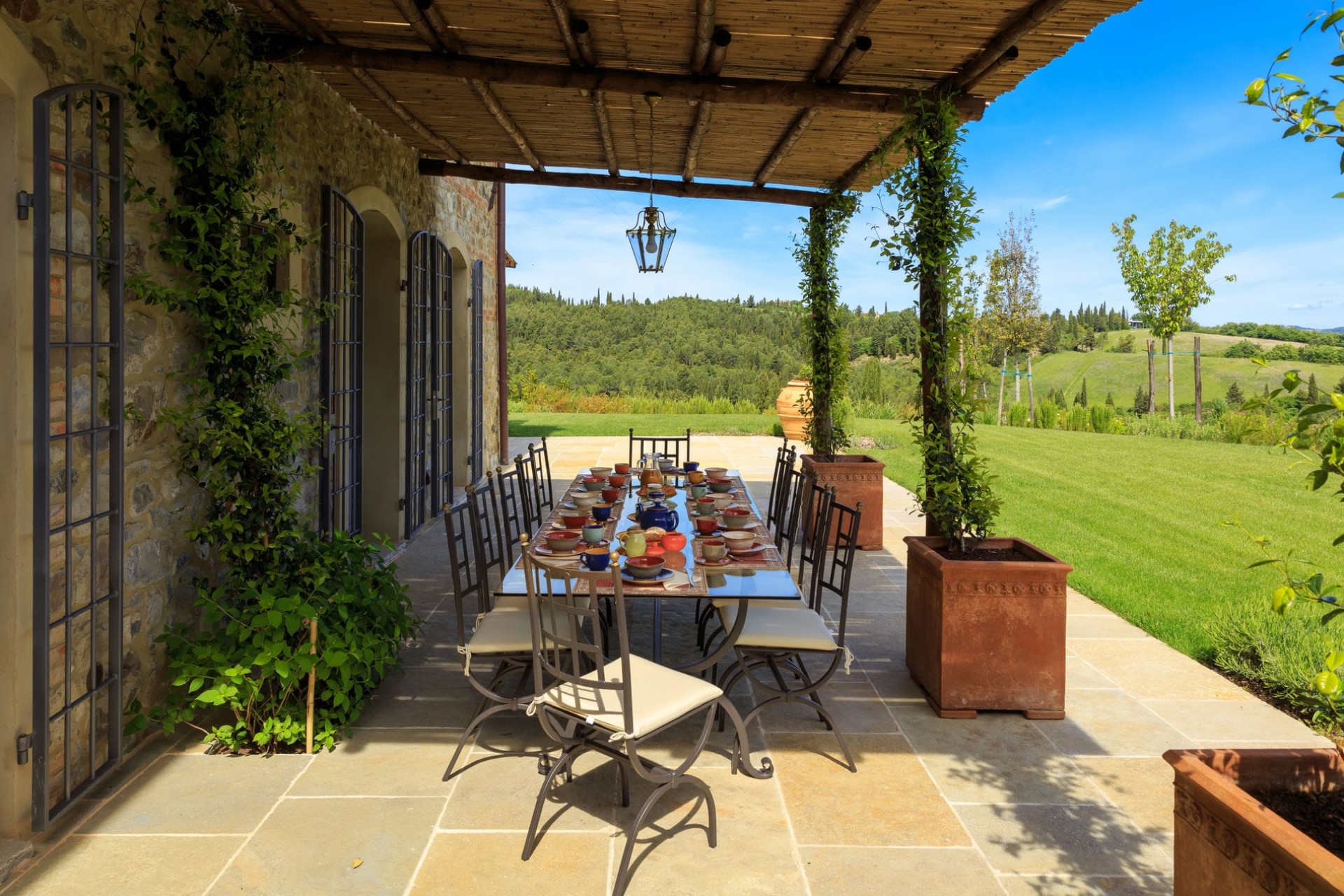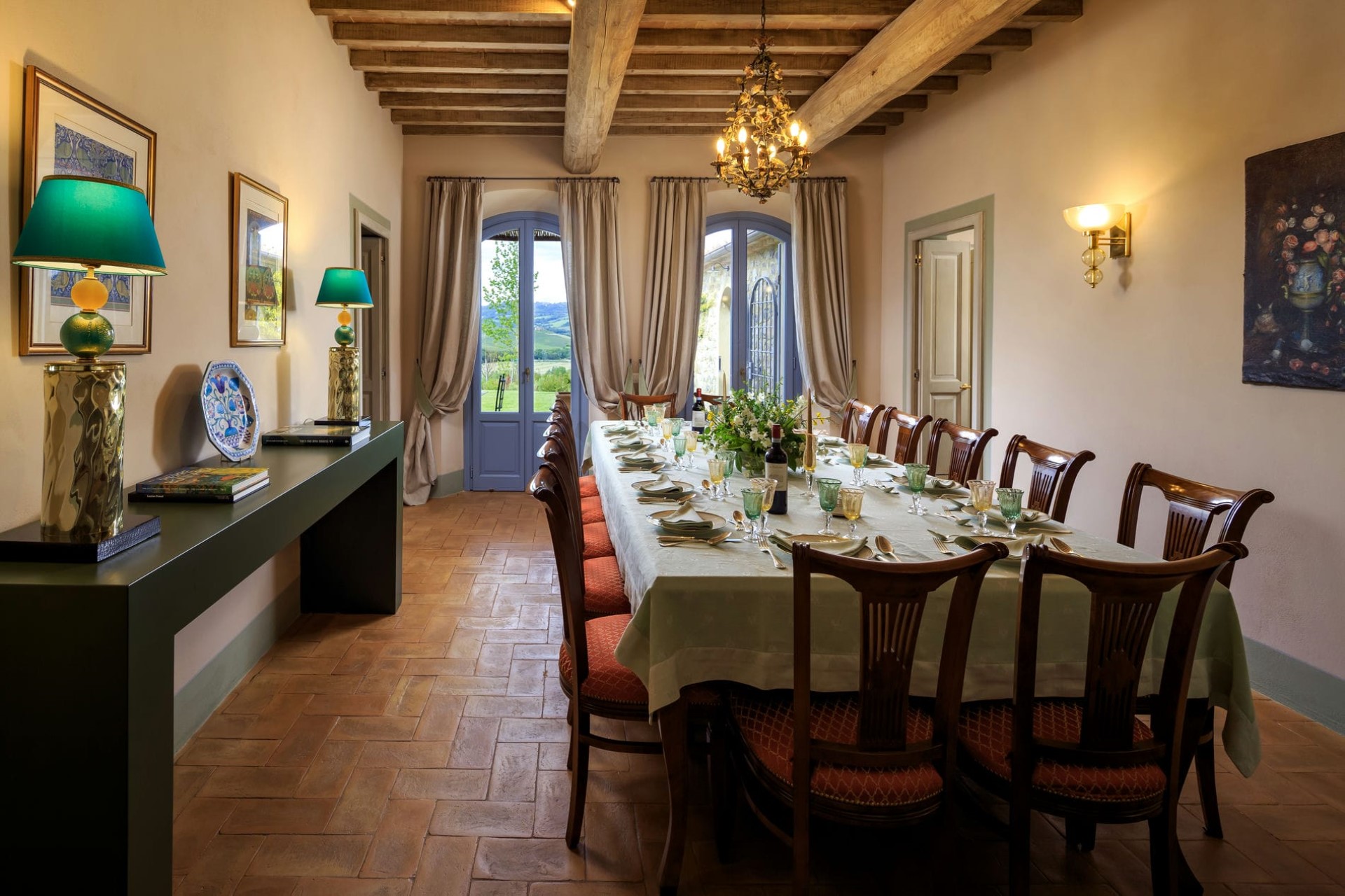 The indoor living areas are spread across more than 6,000 square feet, beautifully decorated in classical local style. High, beamed ceilings create a feeling of space, whilst the use of Tuscan marble, hand-baked terracotta, and stunning Italian period furniture throughout creates a luxurious yet homely feel.